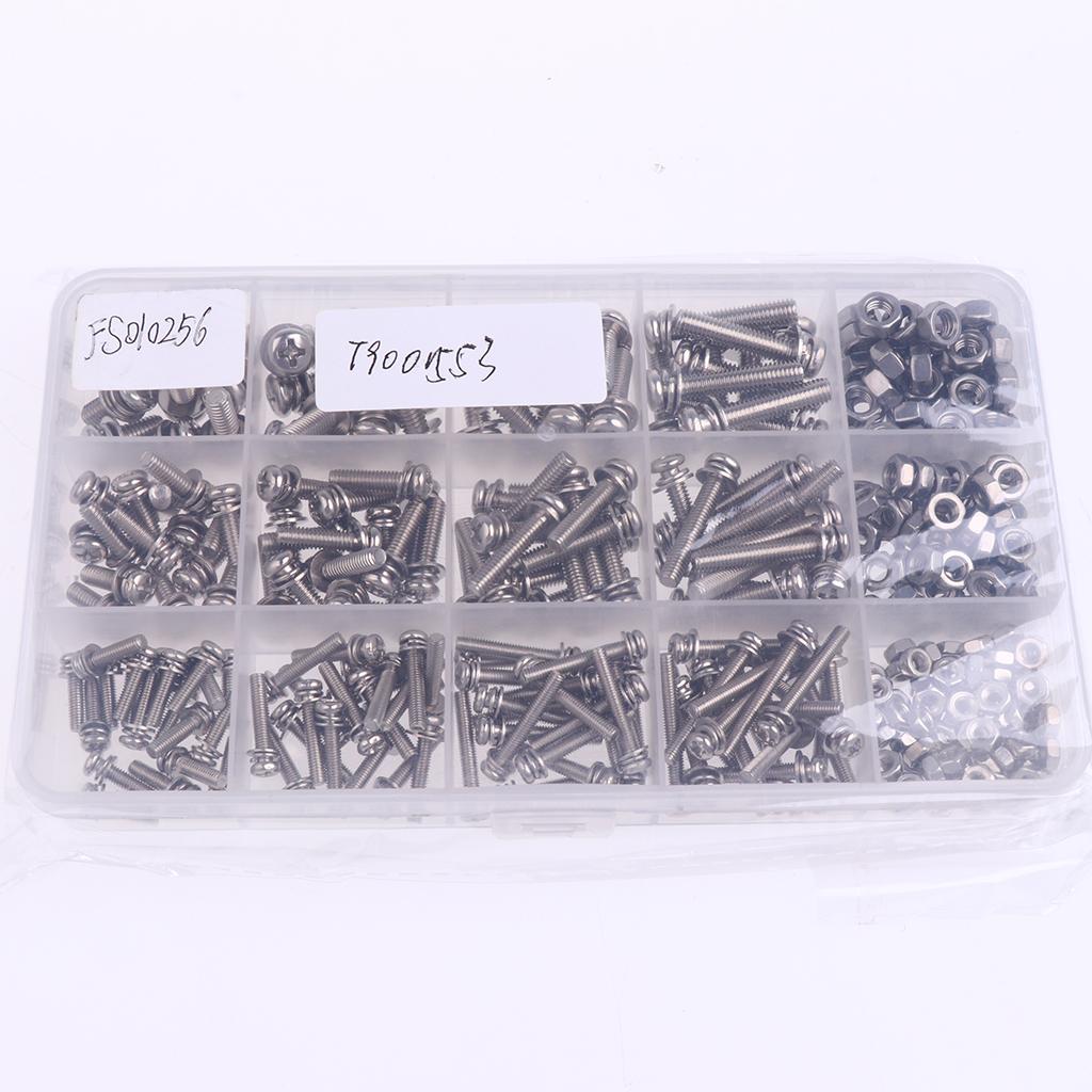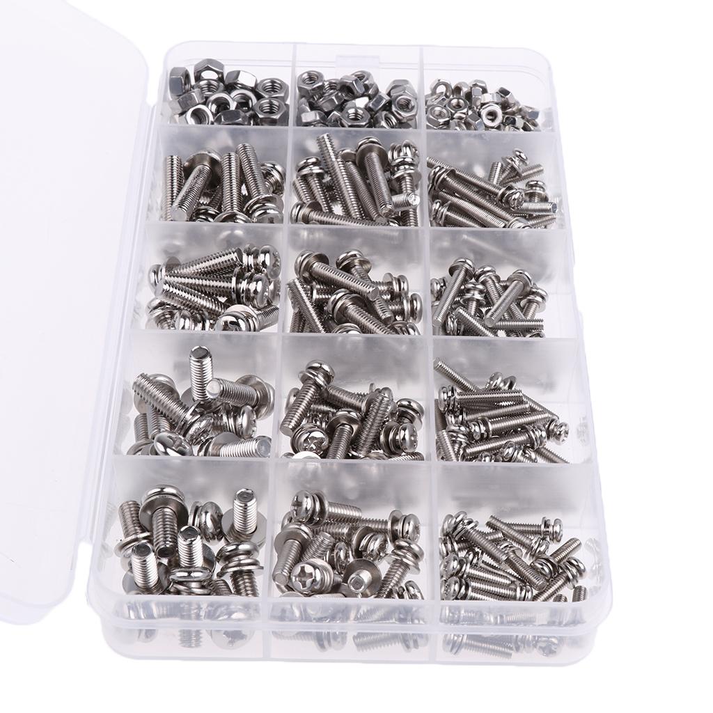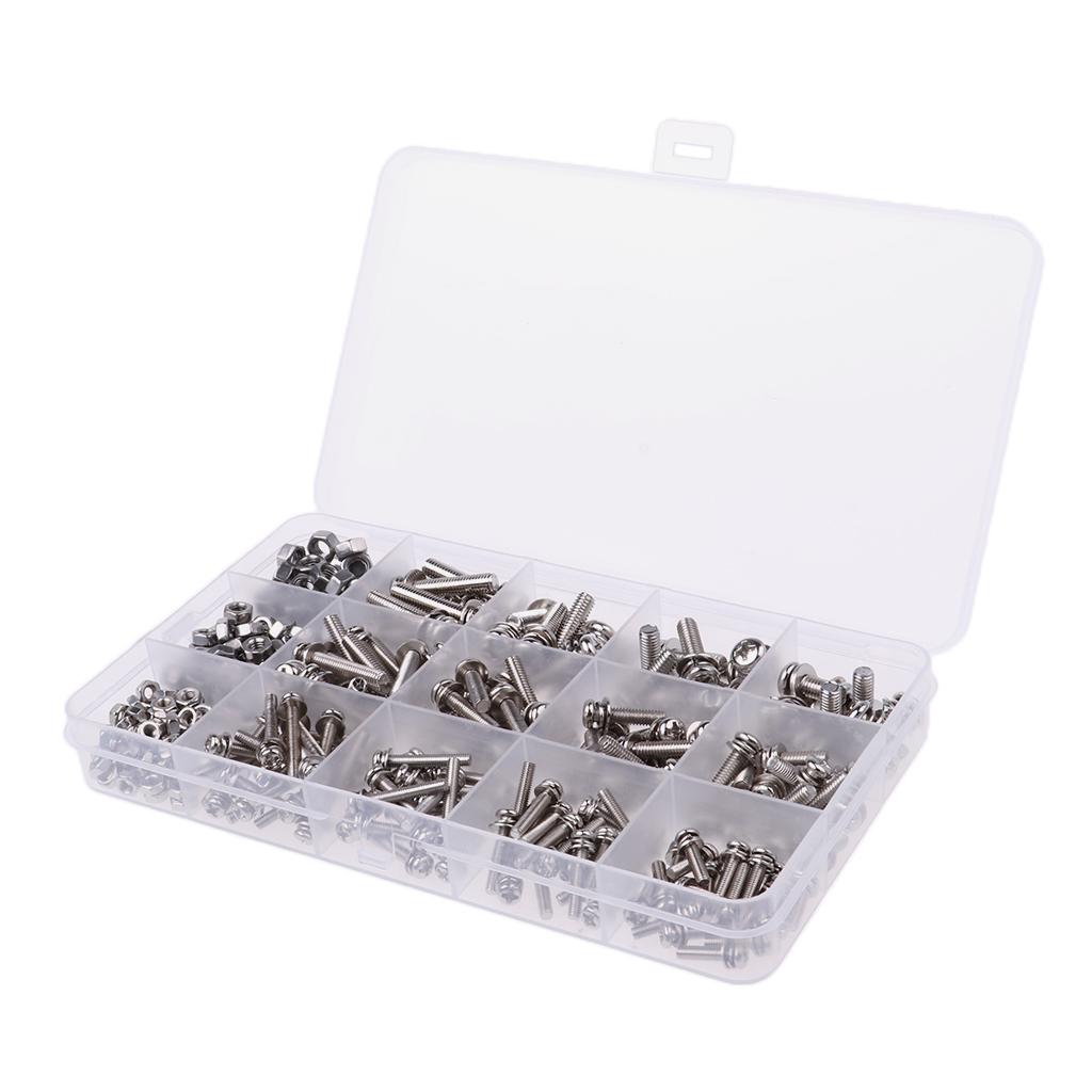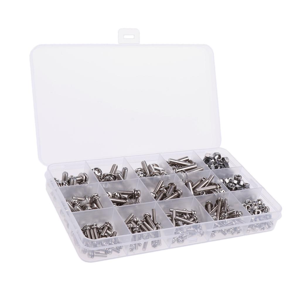 Different size of M3 M4 M5 screws,nuts, flat washers, lock washers, there are totally 720 pieces in a clear box which are commonly used size