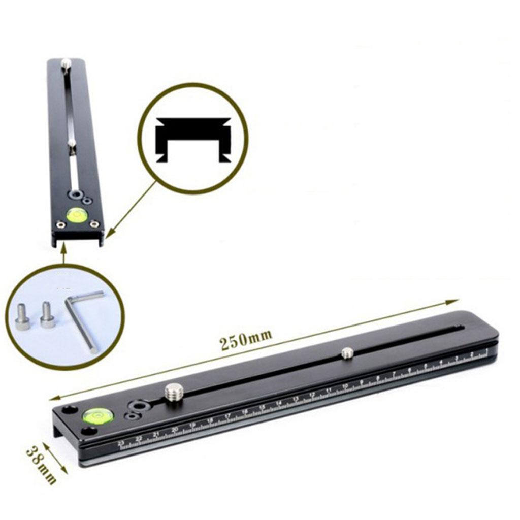 250mm total length, 38mm width, double dovetail slot, 240mm slide length, equipped with a spirit level.