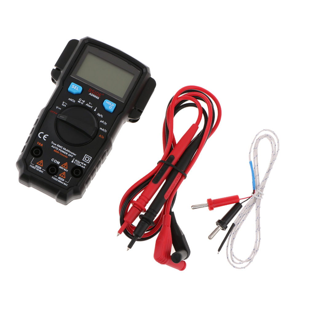 Measures AC/DC current and voltage, resistance, diode, frequency and capacitance, etc