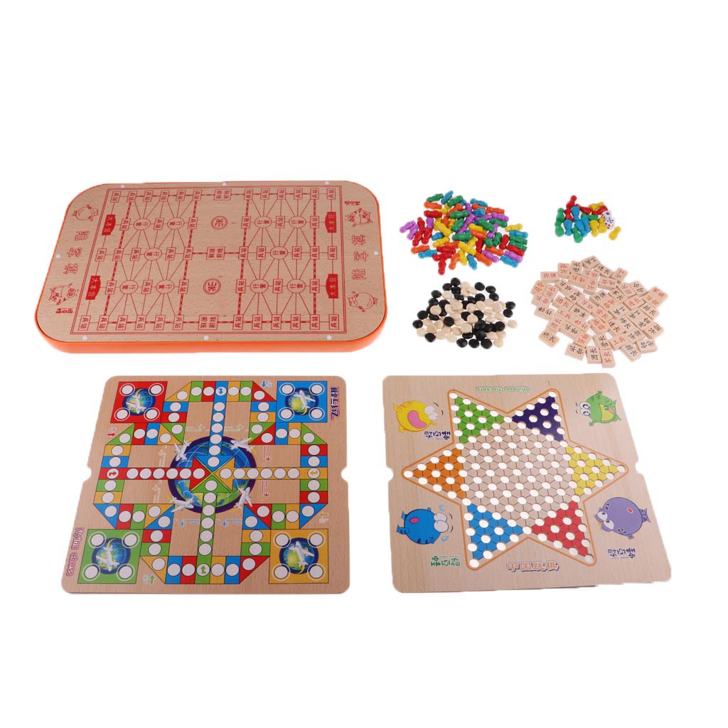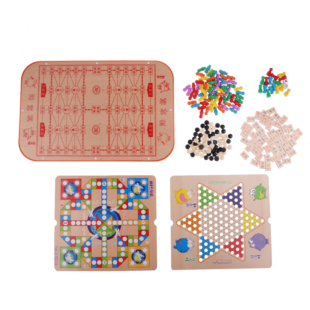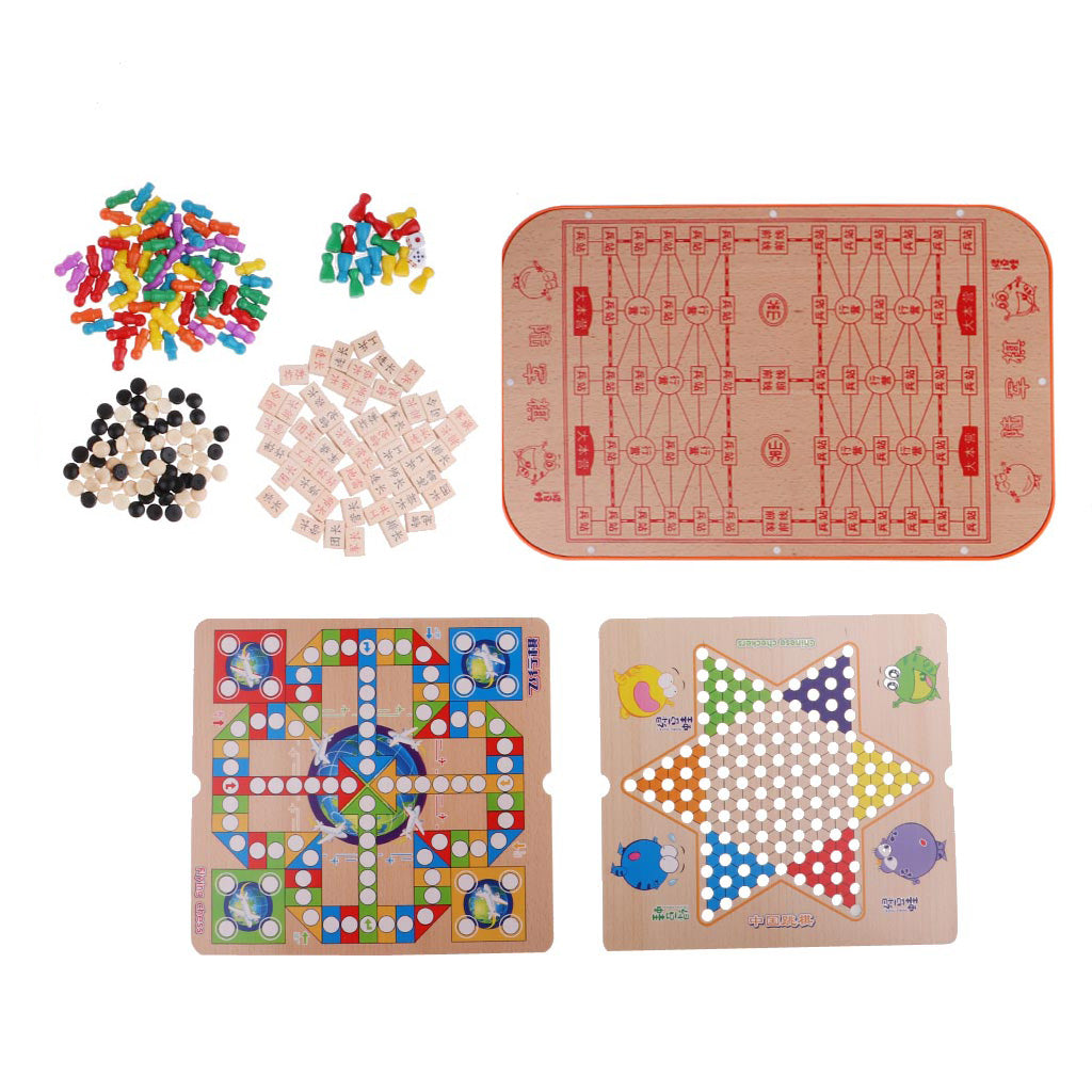 6 In 1 Wooden Chess Pieces Game Board Chinese Checkers Gobang Stratego for Kids Adults Entertainment