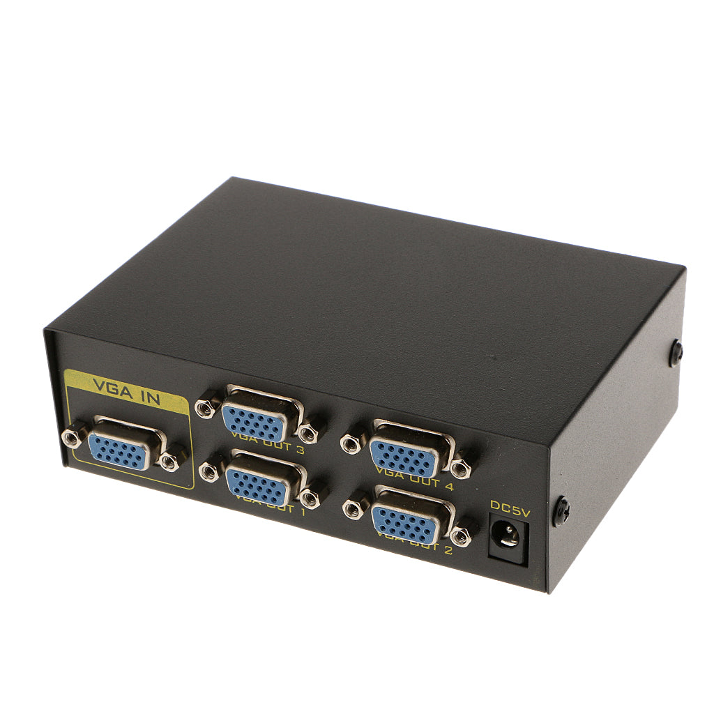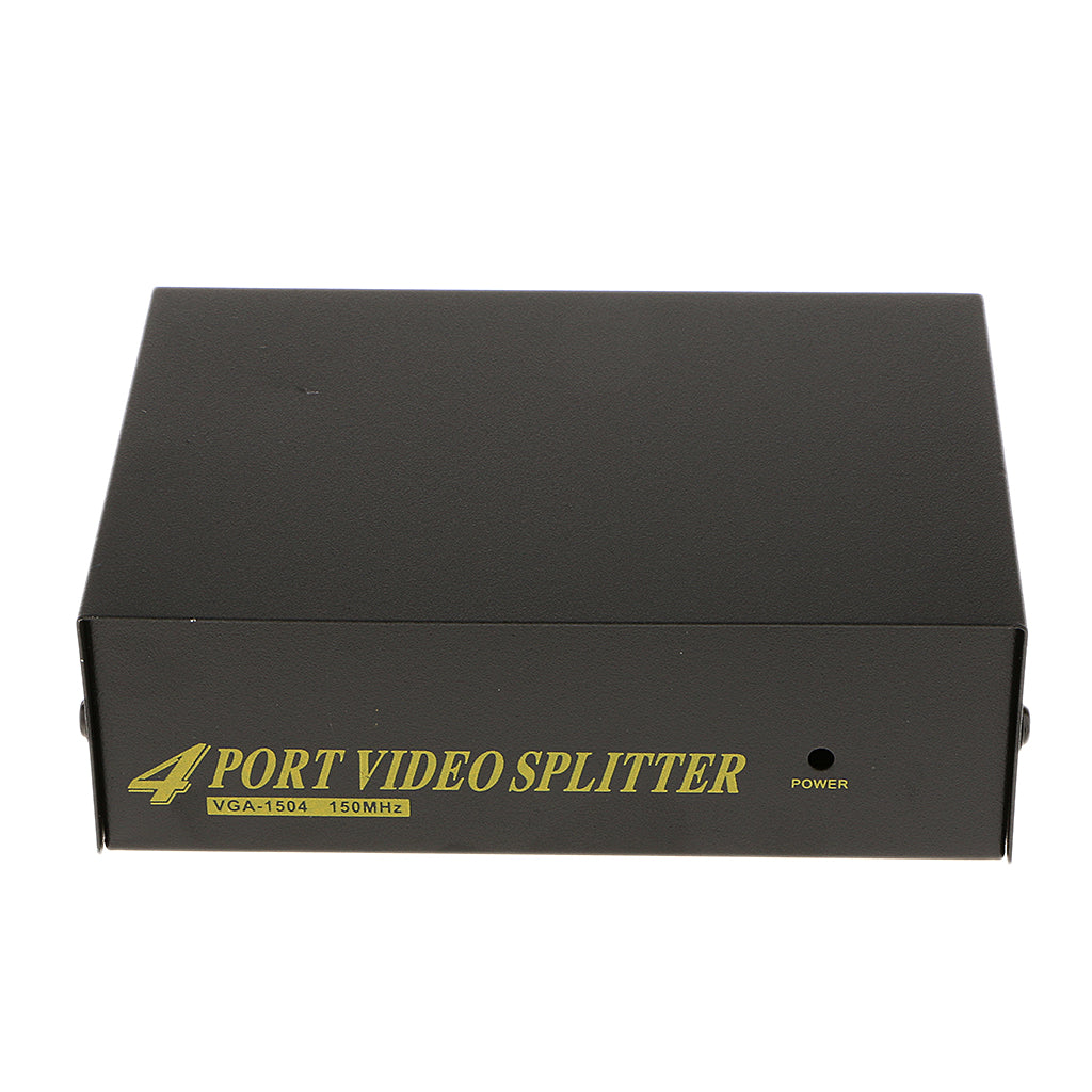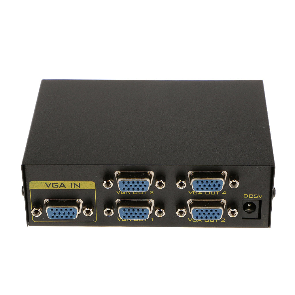 This is a 4 port VGA splitter which takes the computer's VGA signal and duplicates it onto 4 analog monitors. It is compatible with most monitors and enables up to 4 monitors to share the information of a host computer simultaneously. It is also a boosting device that extends the video signal's transmission distance, making it an excellent choice for video broadcast systems