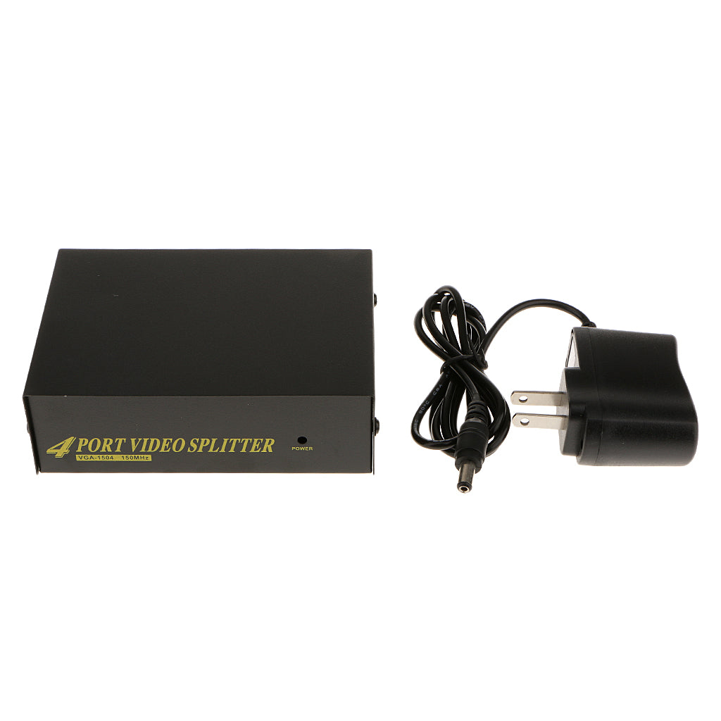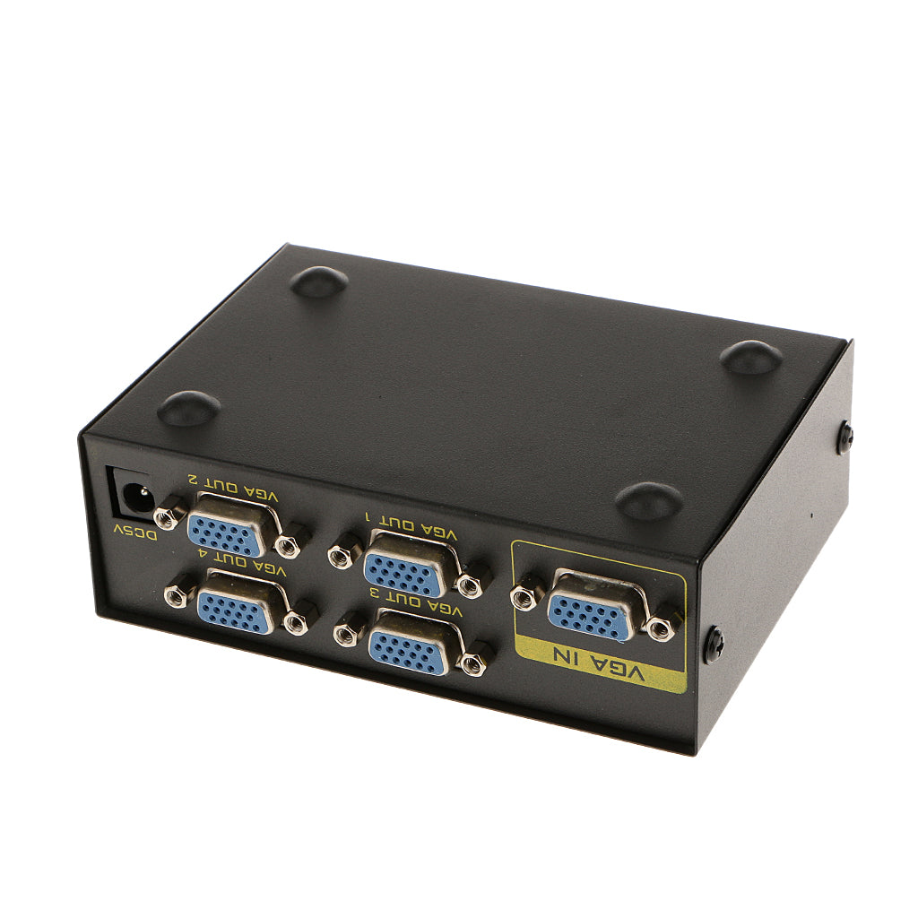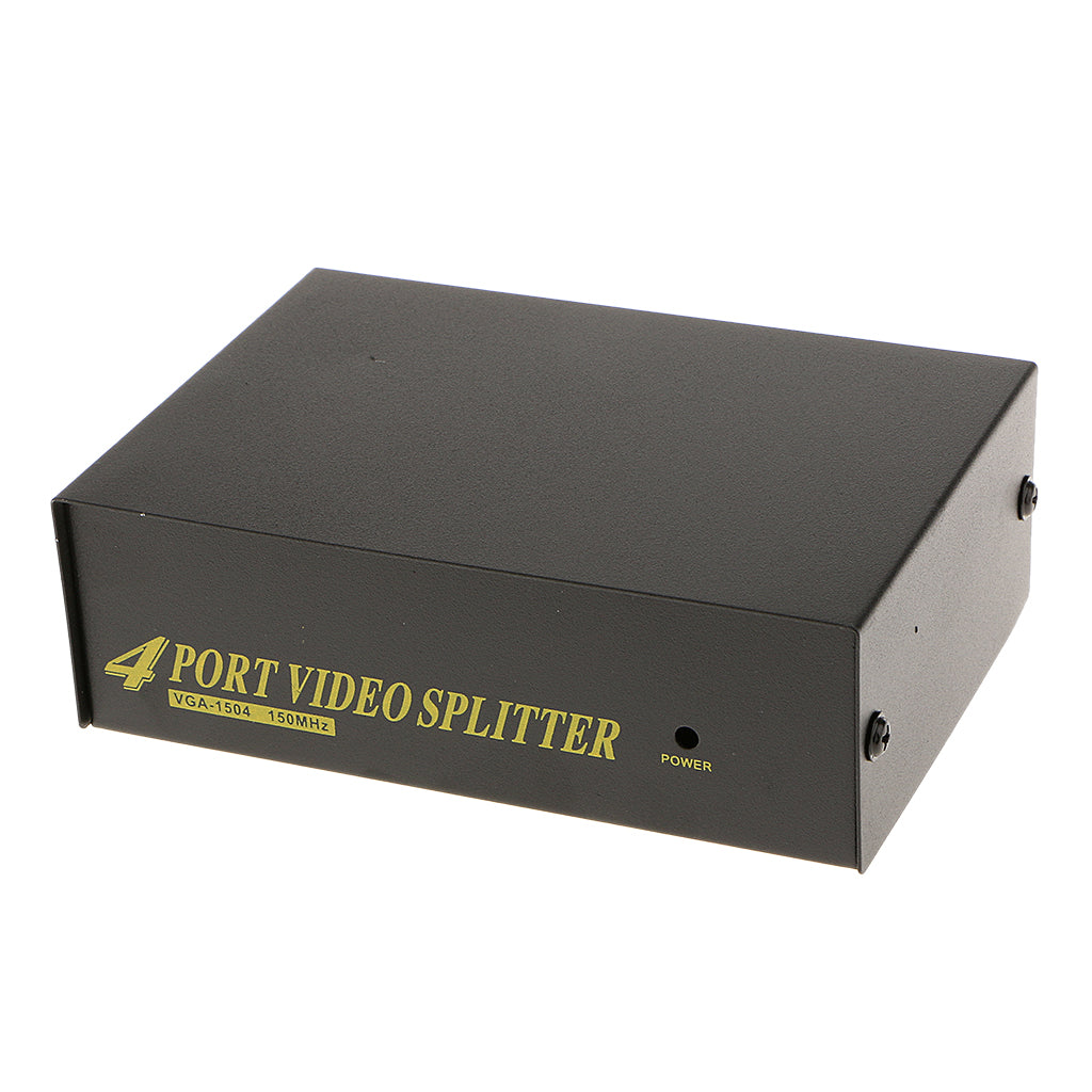 This is a 4 port VGA splitter which takes the computer's VGA signal and duplicates it onto 4 analog monitors. It is compatible with most monitors and enables up to 4 monitors to share the information of a host computer simultaneously. It is also a boosting device that extends the video signal's transmission distance, making it an excellent choice for video broadcast systems