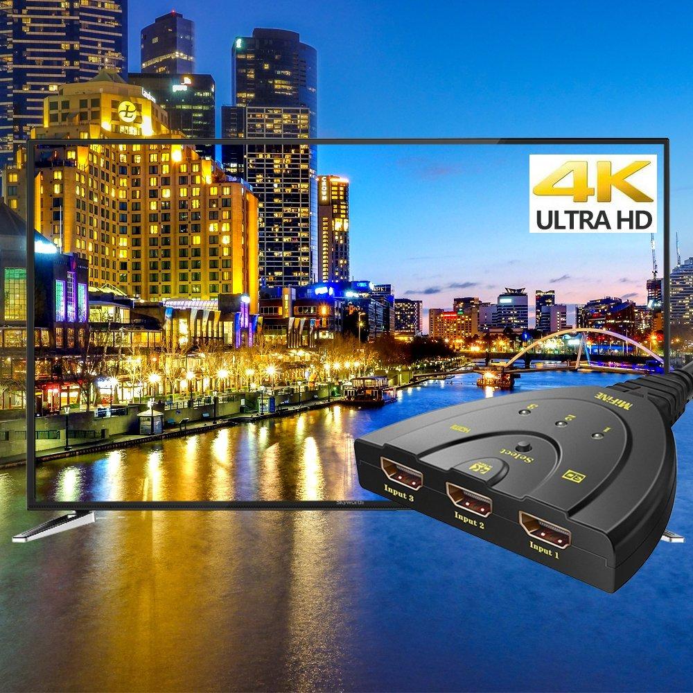 3-Port HDMI Switch: very easy to use, plug and play. You can hook up 3 devices to it (ps3/fire TV/Blu-players) and 1 way out (TV or Monitor).
