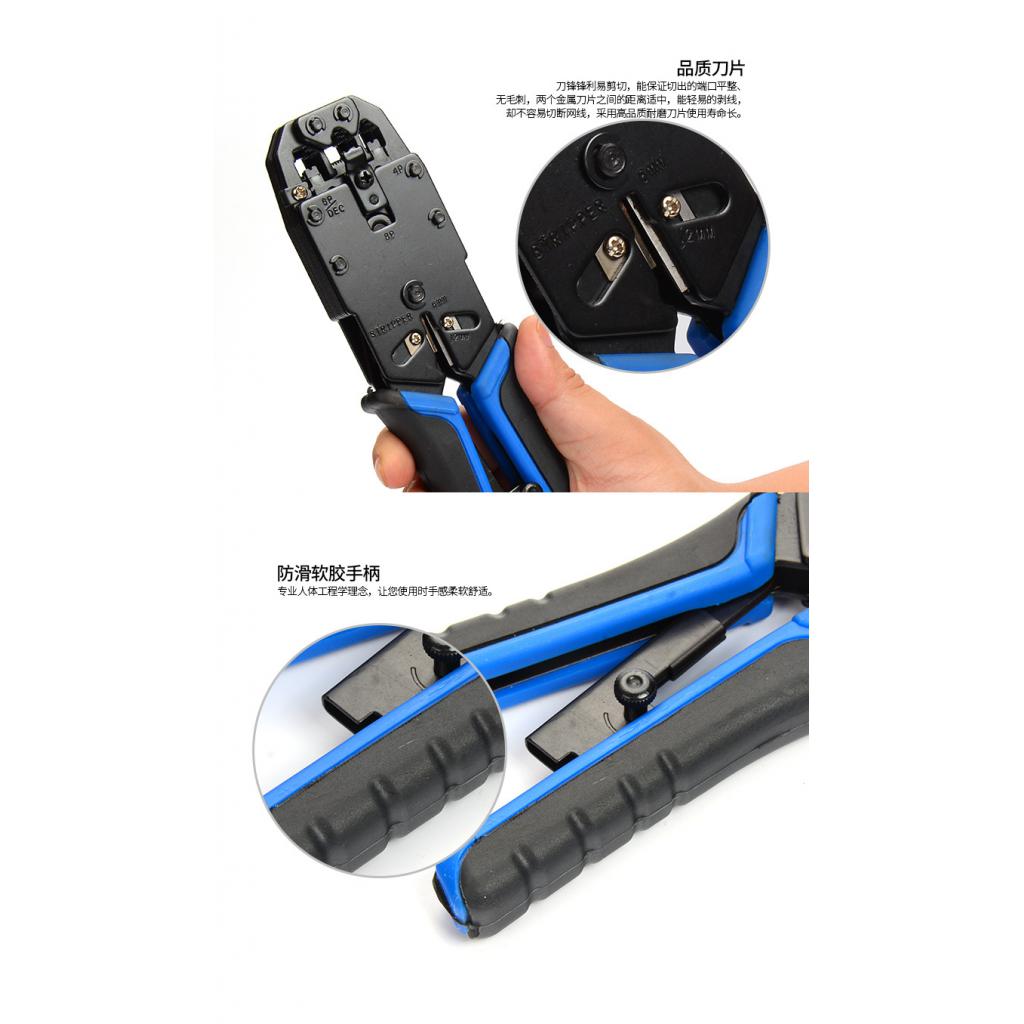 Features: with a ratchet labor-saving device, effort and ensure that the effect of pressing a variety of die can choose to cover all the general specifications of the phone, cable terminal cut part of the protection device to avoid work damage ratchet with a lock function, UTP / STP round twisted pair function