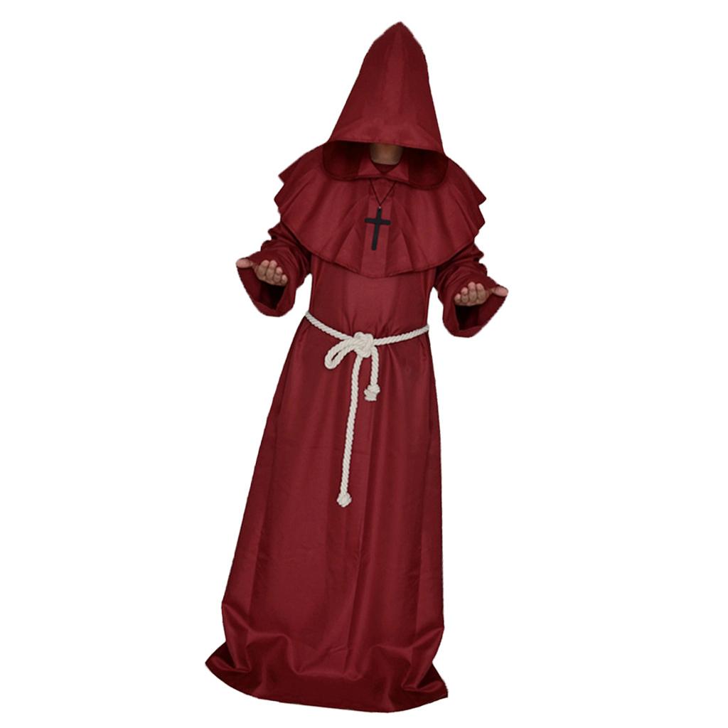 Men Women Hooded Robe Long Black Cloak Cape + Necklace + Cotton Belt for Halloween Fancy Costume Dress Accessory Wine Red S
