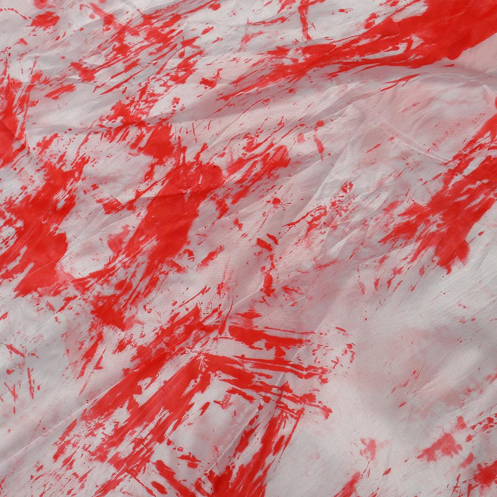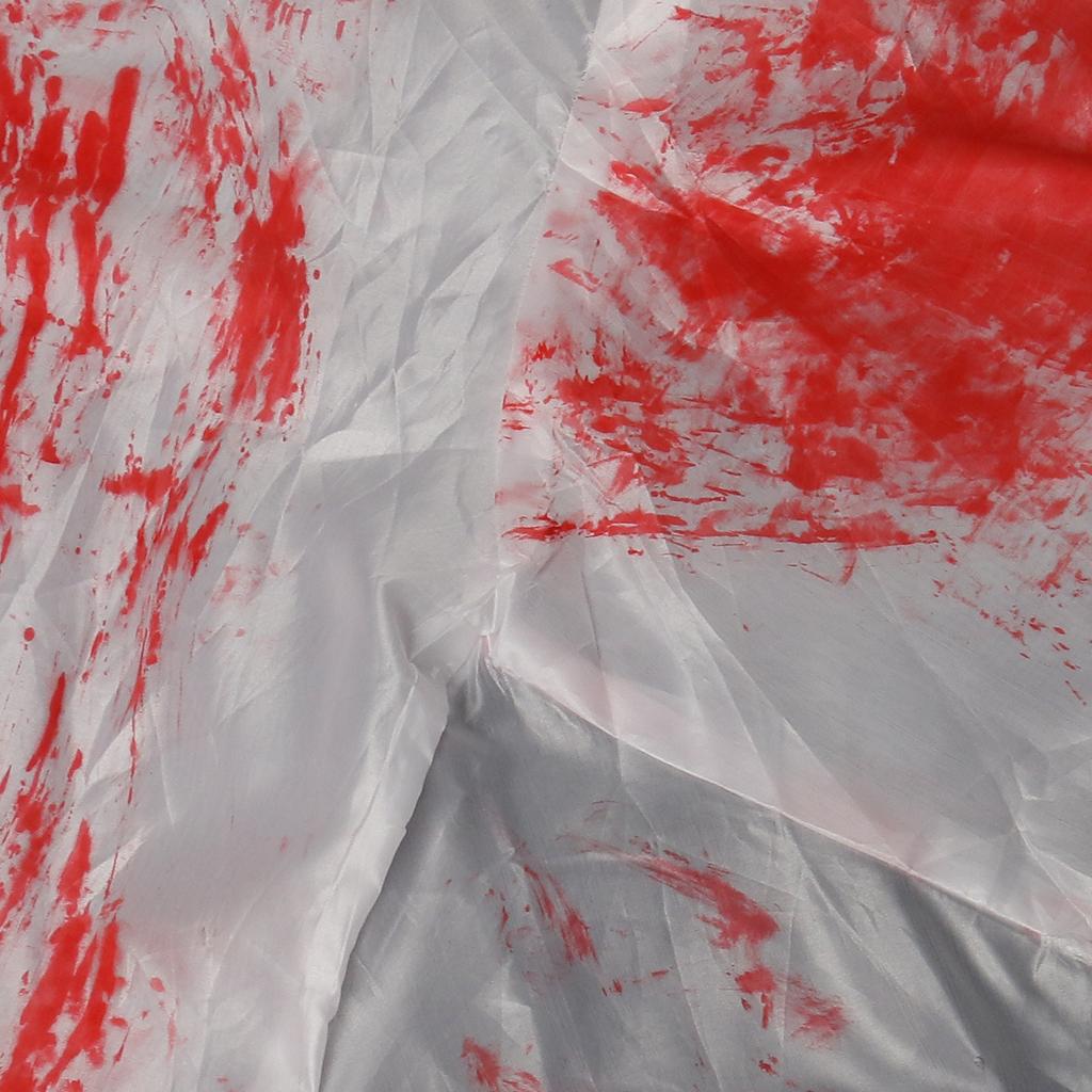 A piece of white costume dress, black tassel around neck, horrible bloody stain splashed