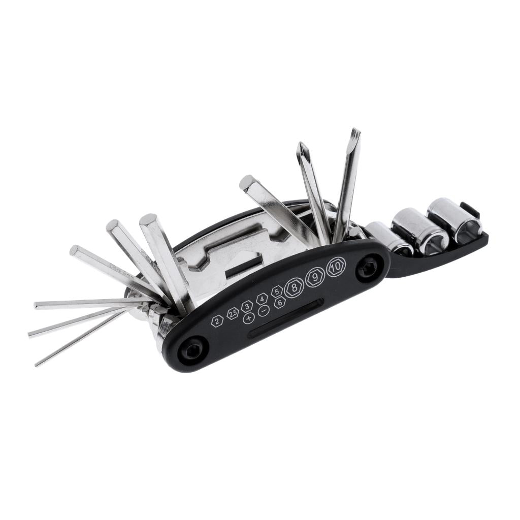 16 in 1 Tool Includes: 2/2.5/3/4/5/6mm Hex Wrench, 8/9/10mm Hexagonal Socket Wrench, 8/10/15mm Open-end Wrench, Cross Screwdriver, Flathead Screwdriver, 14GE Spoke Wrench, Sleeve Rod