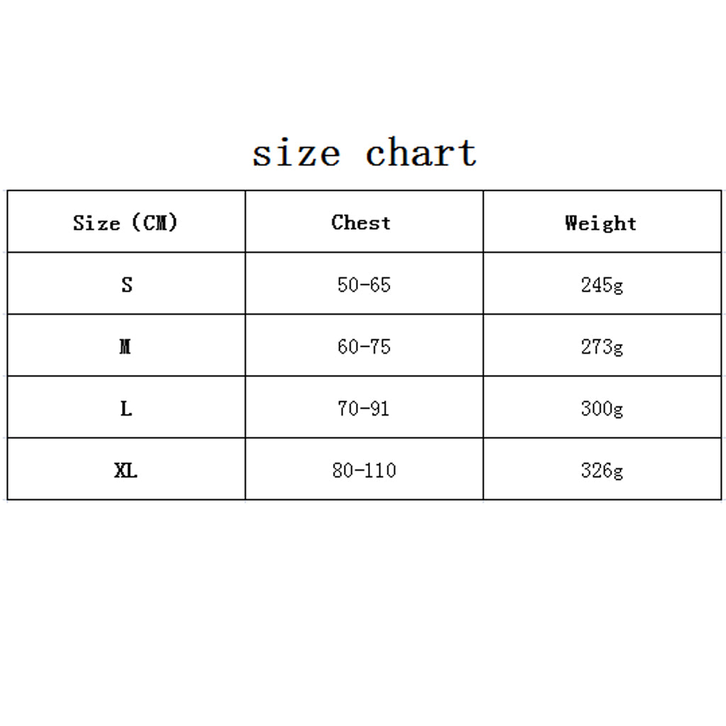 | Chest | 19.7-25.6“ / 50-65cm | 23.6-29.5" / 60-75cm | 27.6-35.8" / 70-91cm | 31.5-43.3" / 80-110cm |