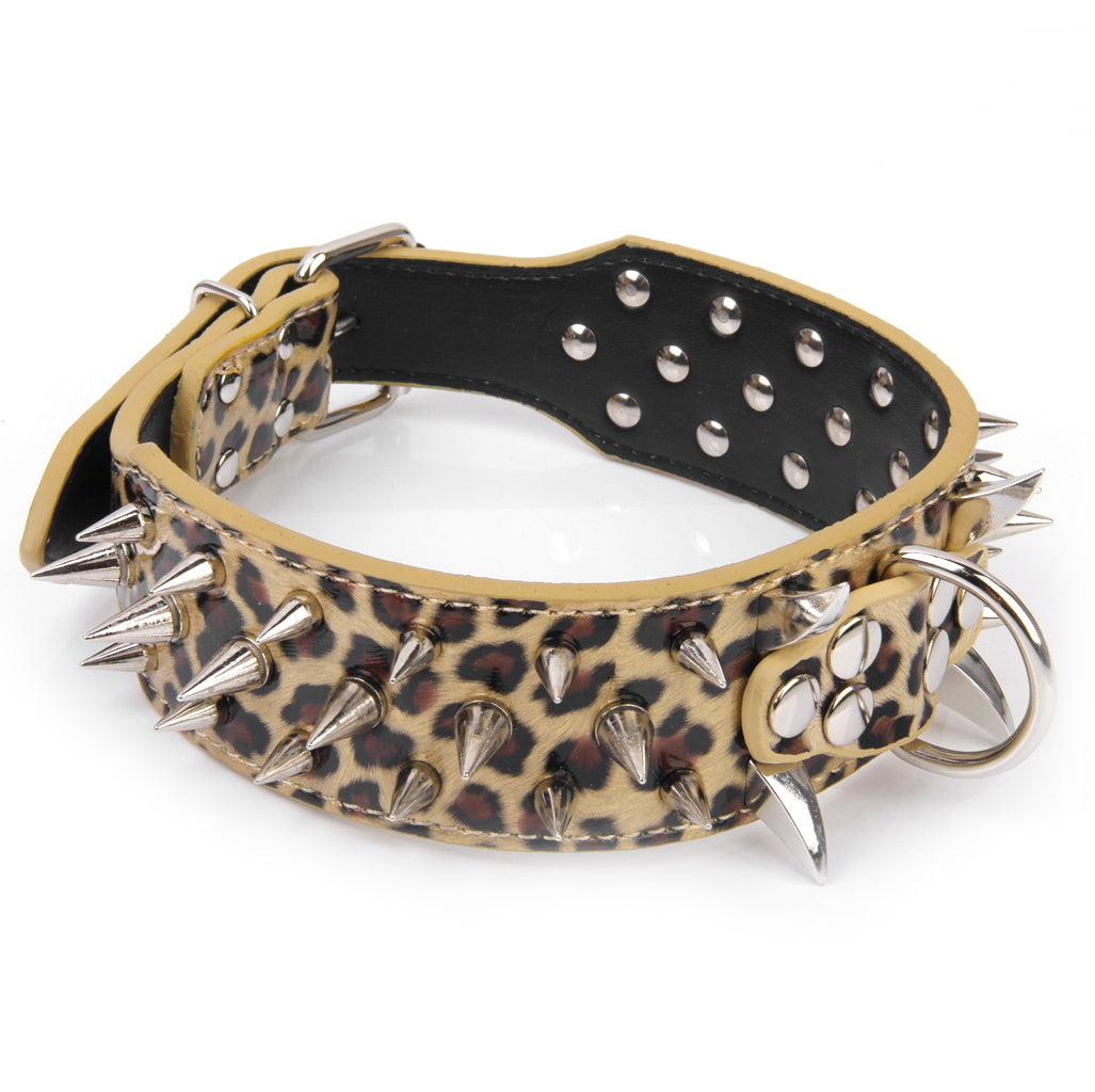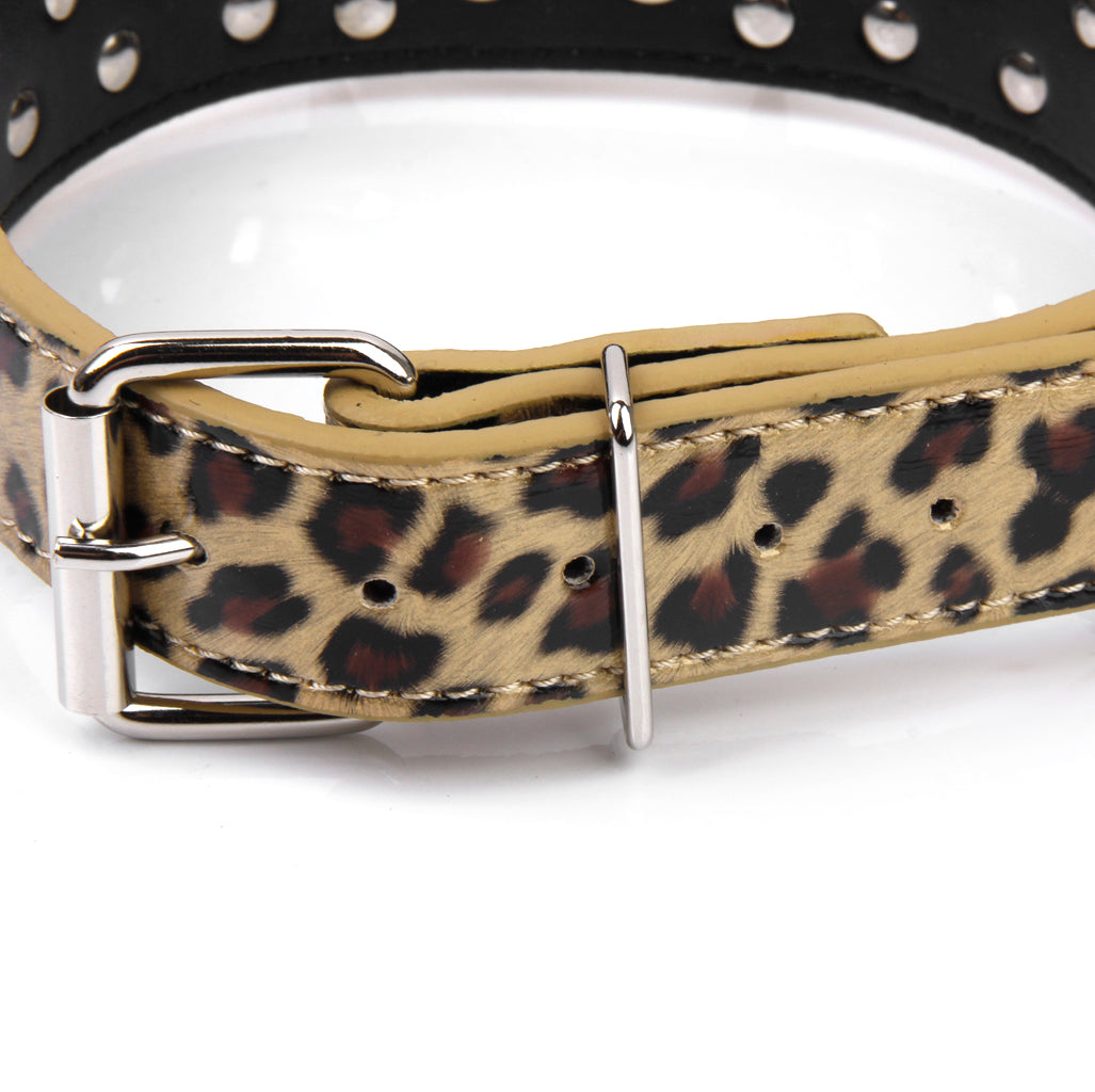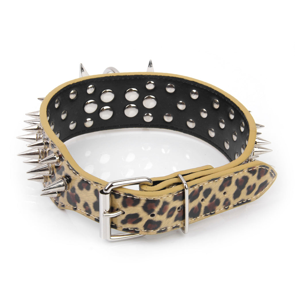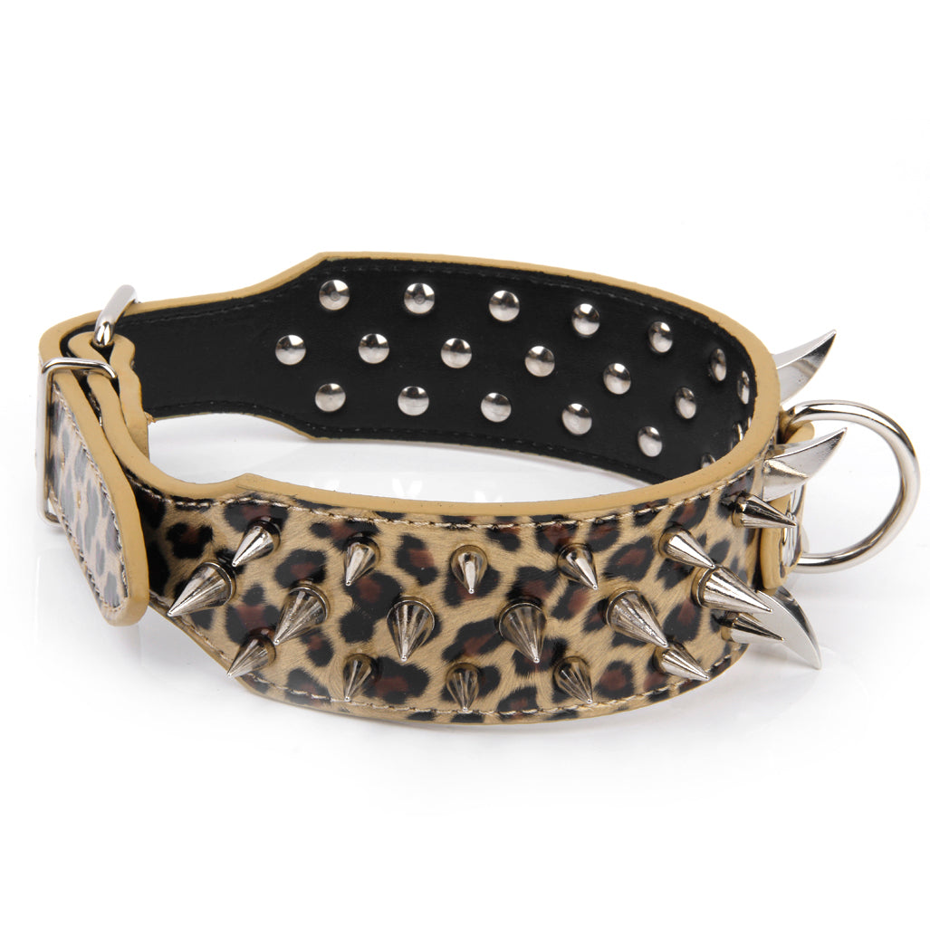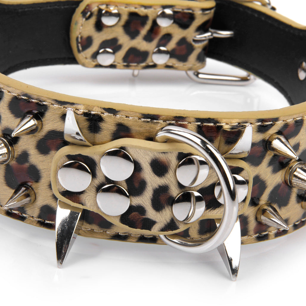 New Spiked Studded PU Leather Durable Pet Dog PitBull Mastiff Collar with D-ring L - Gold Leopard