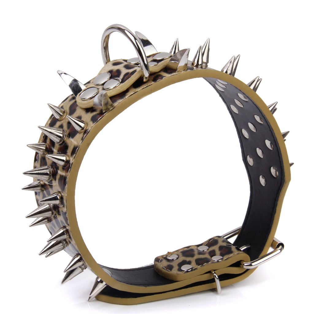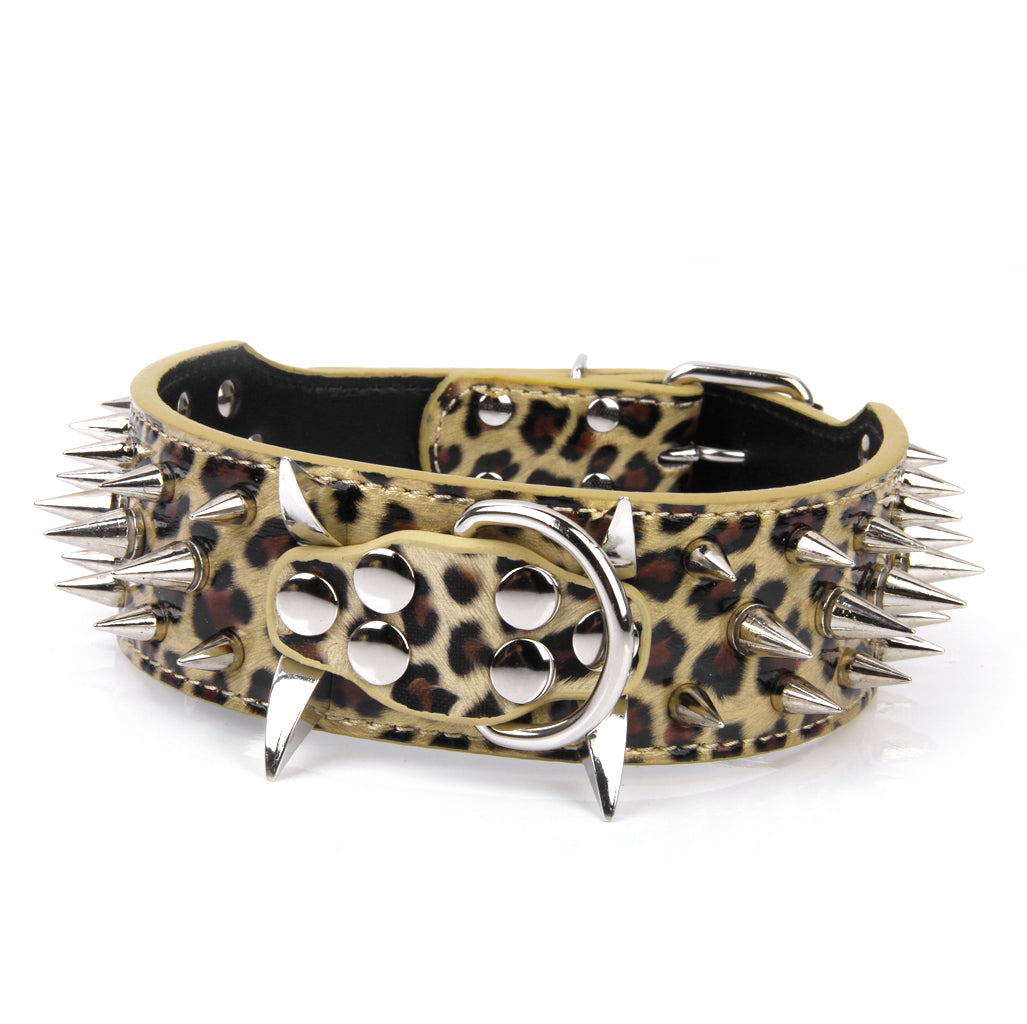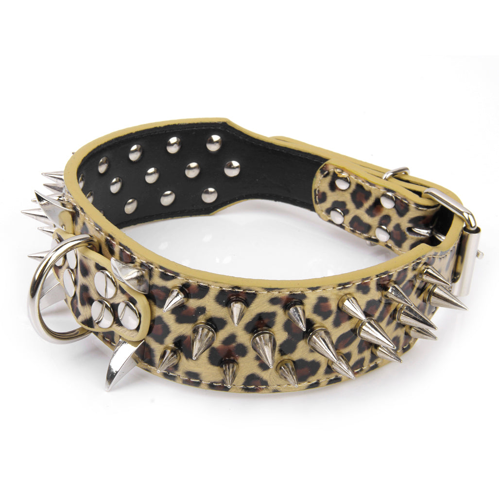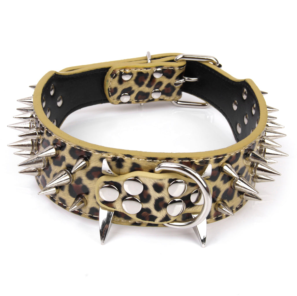 New Spiked Studded PU Leather Durable Pet Dog PitBull Mastiff Collar with D-ring L - Gold Leopard