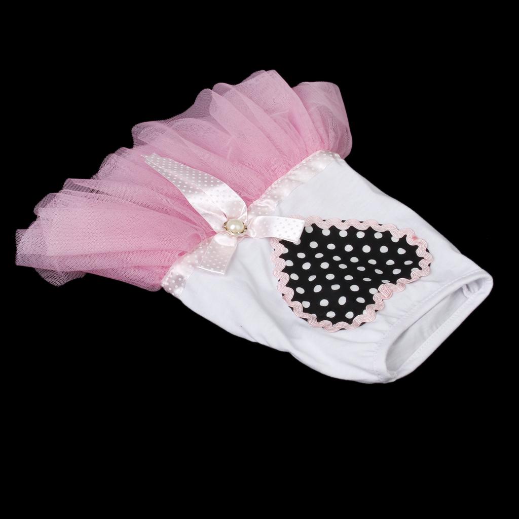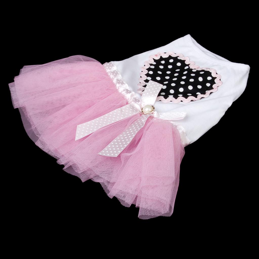 Beautiful dog dress gives pet a bright, breezy, and ultra fashionable look for warm weather outings. Super sweet dog dress features cute heart pattern and tulle hem. This dog dress is perfect for parties or everyday strolls.