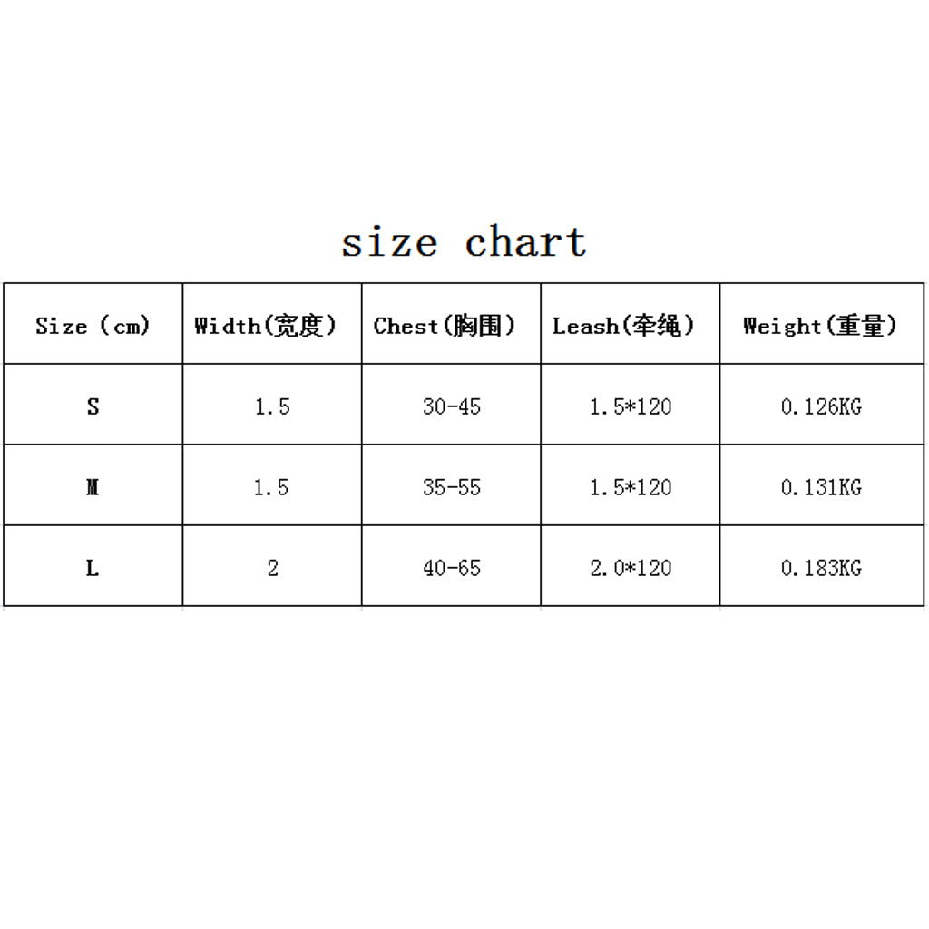 | Size | Chest Cirth (approx.) | Leash (W x L) approx. |