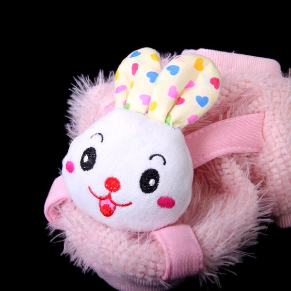 Two crossed band on the back and there is a smiling rabbit head on the band