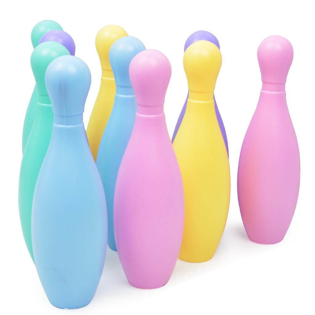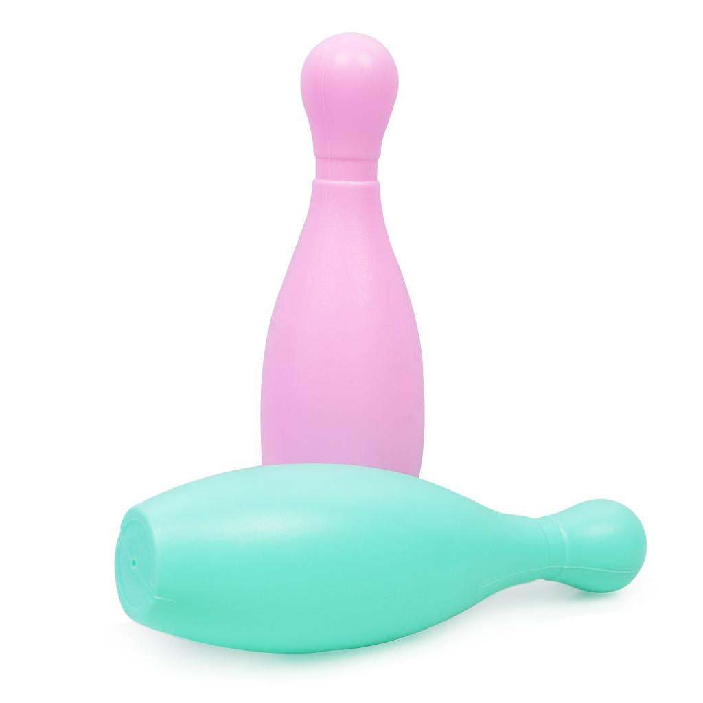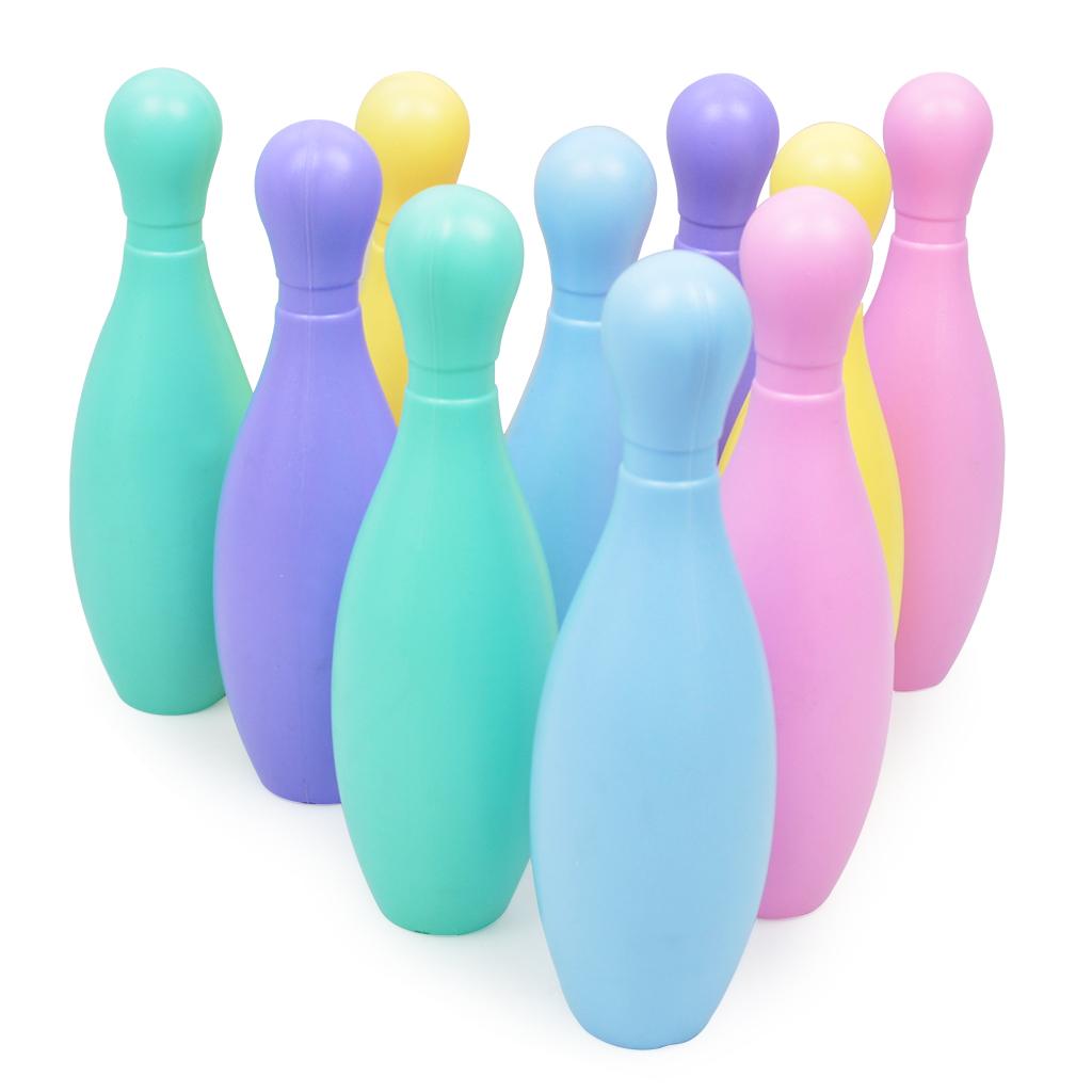 Kids mini bowling game set comes with 5 bright colors, 10 plastic pins and 2 bowling balls.