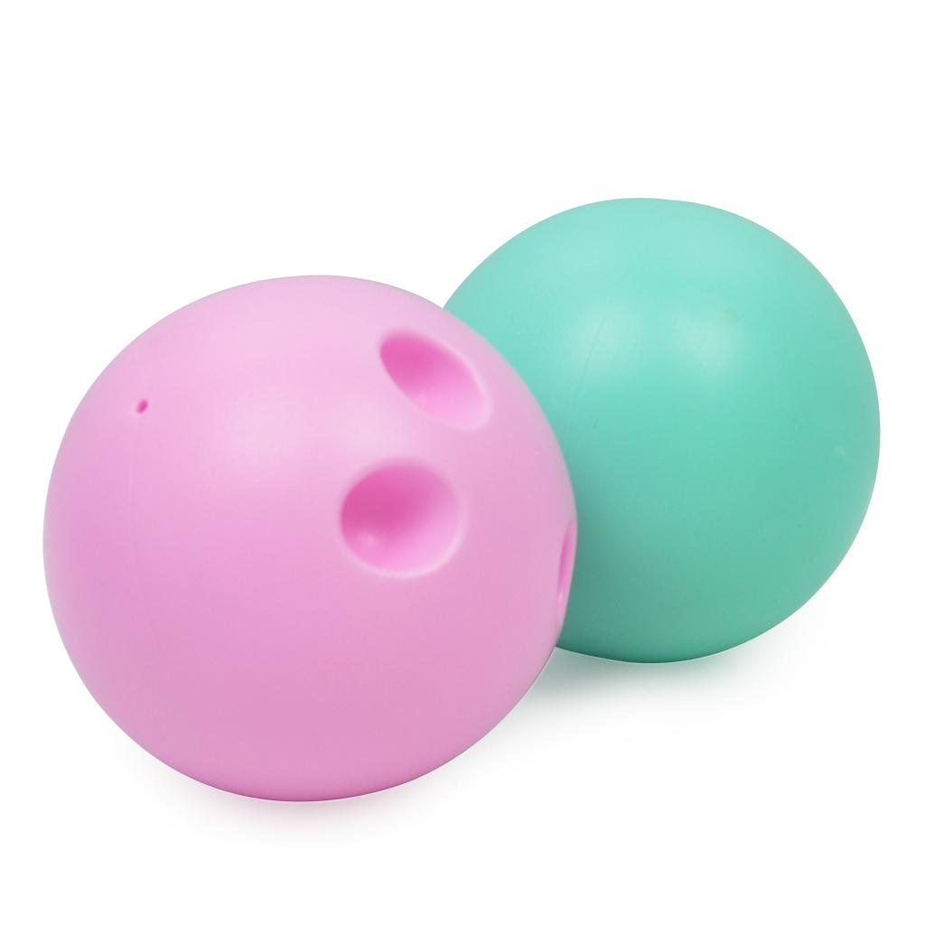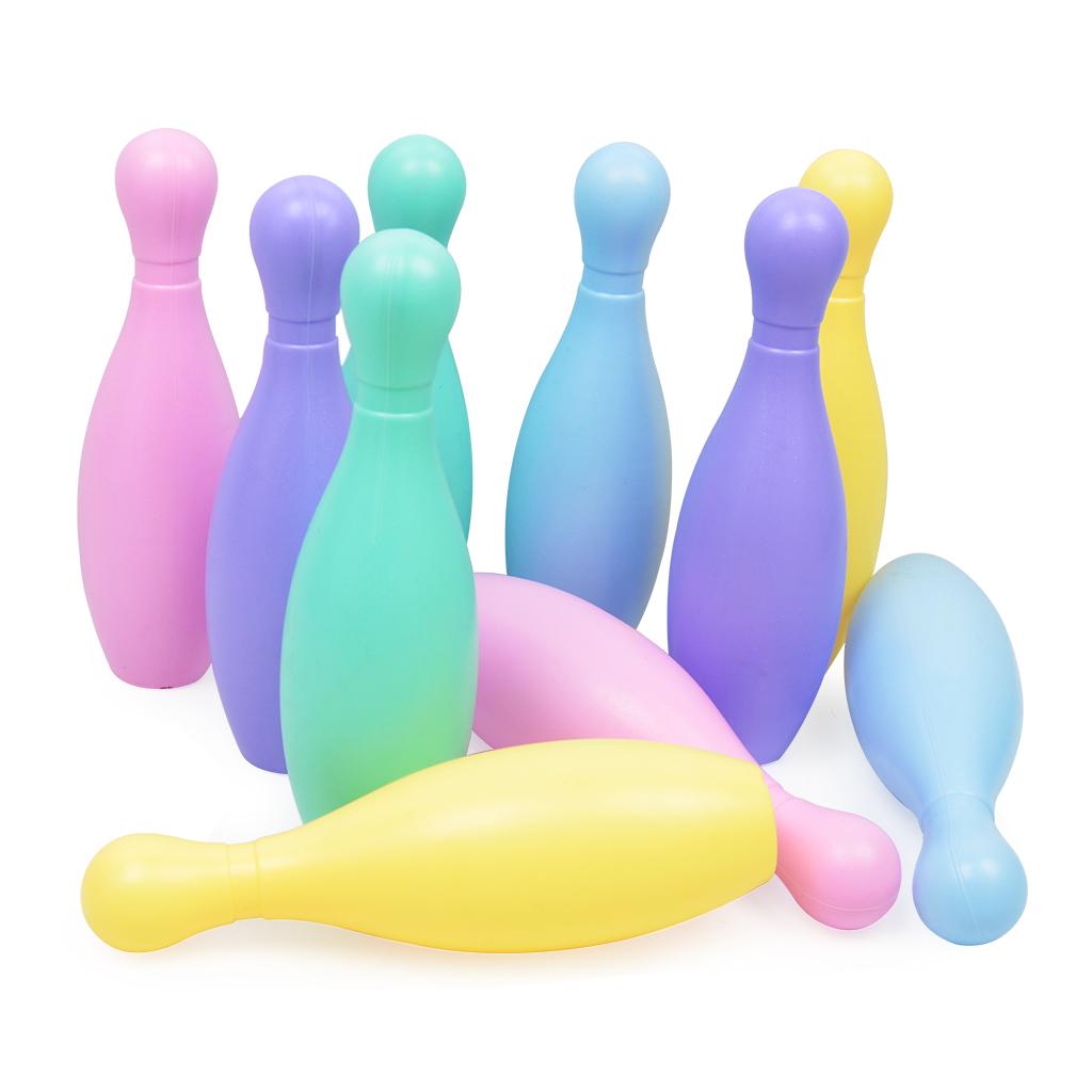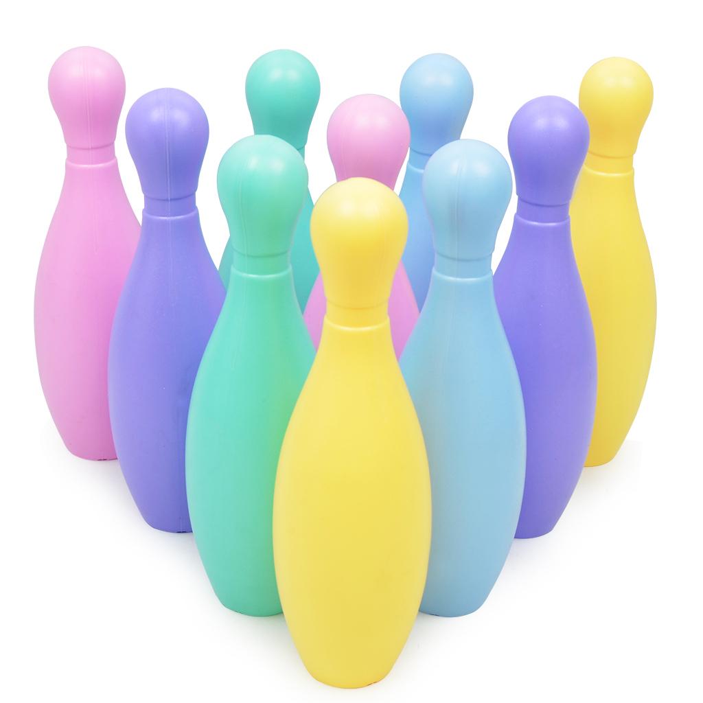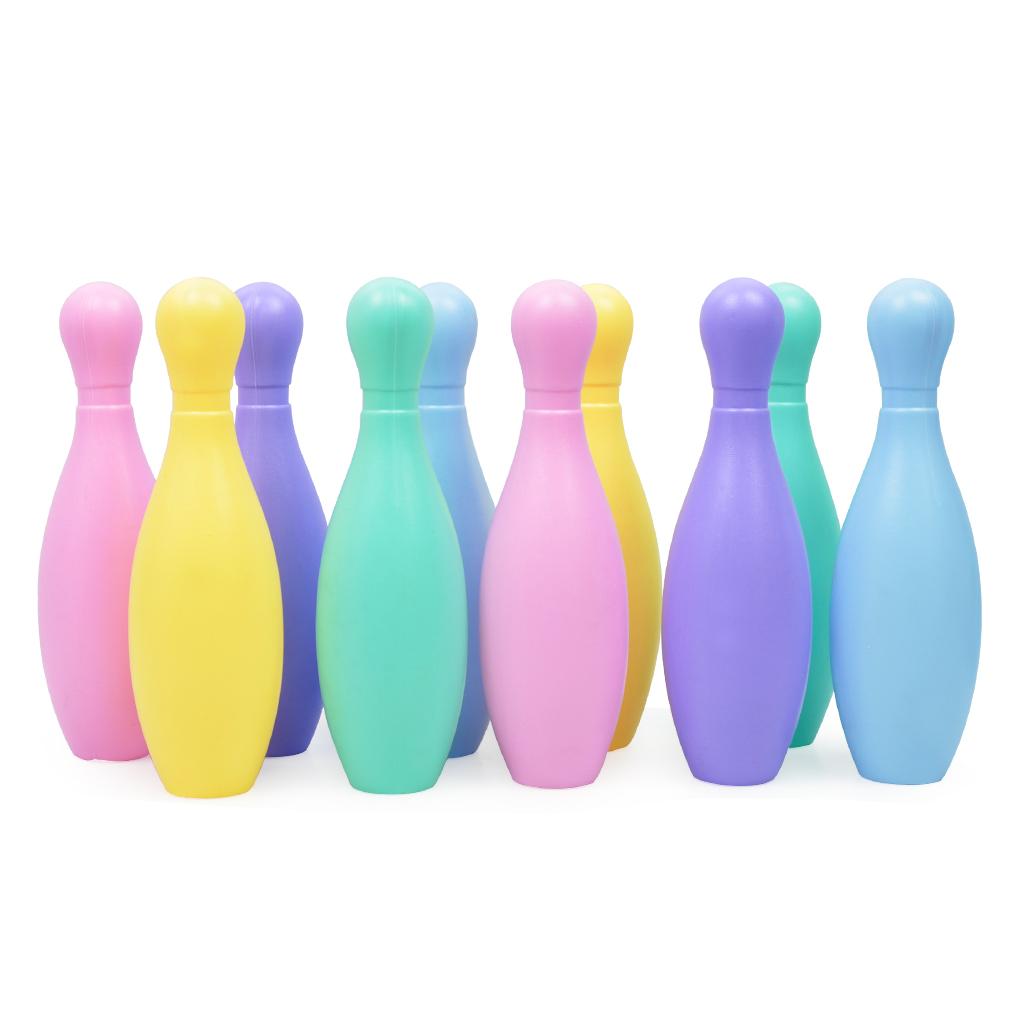 Kids mini bowling game set comes with 5 bright colors, 10 plastic pins and 2 bowling balls.
