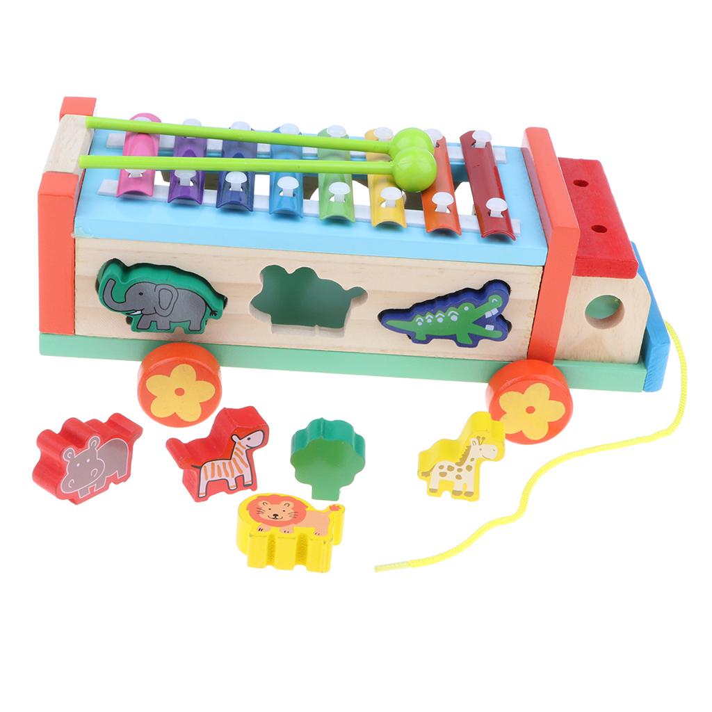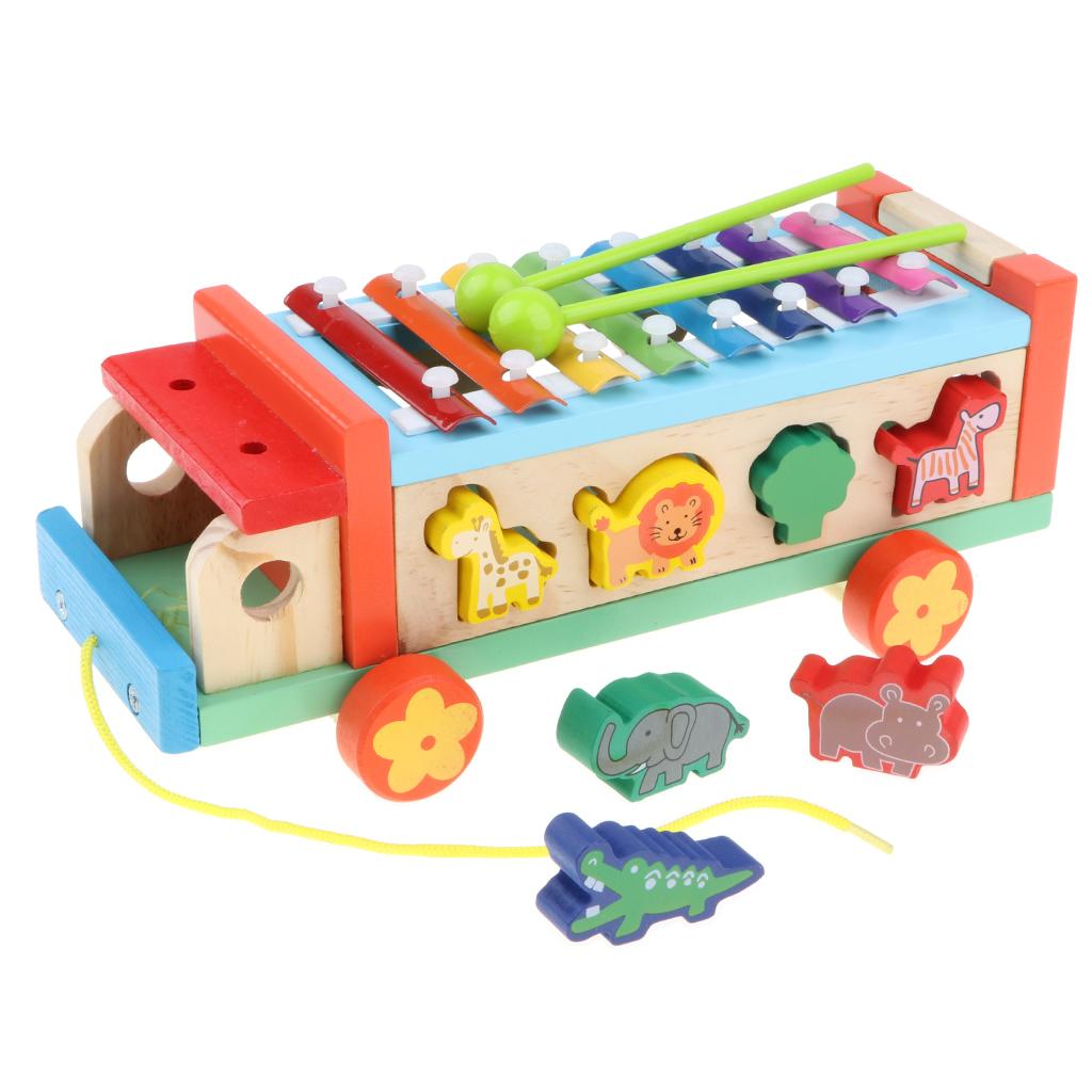 Includes 1 pull along car, 1 knock piano and 1 animal shape matching game