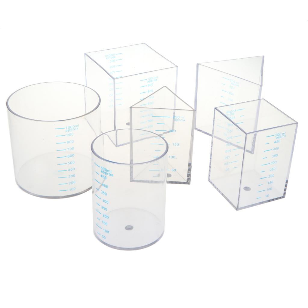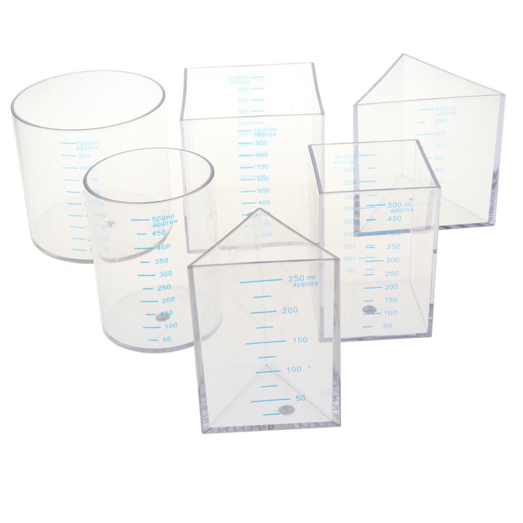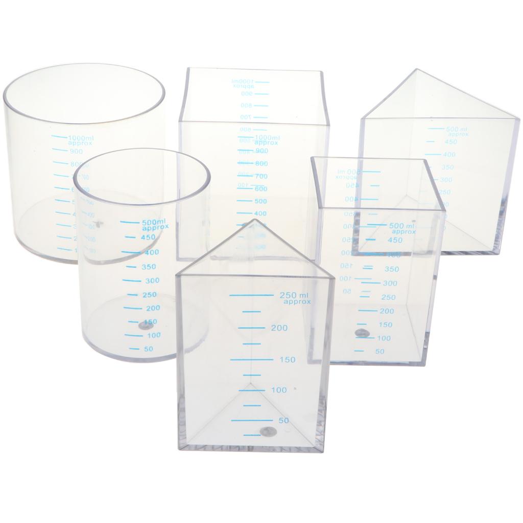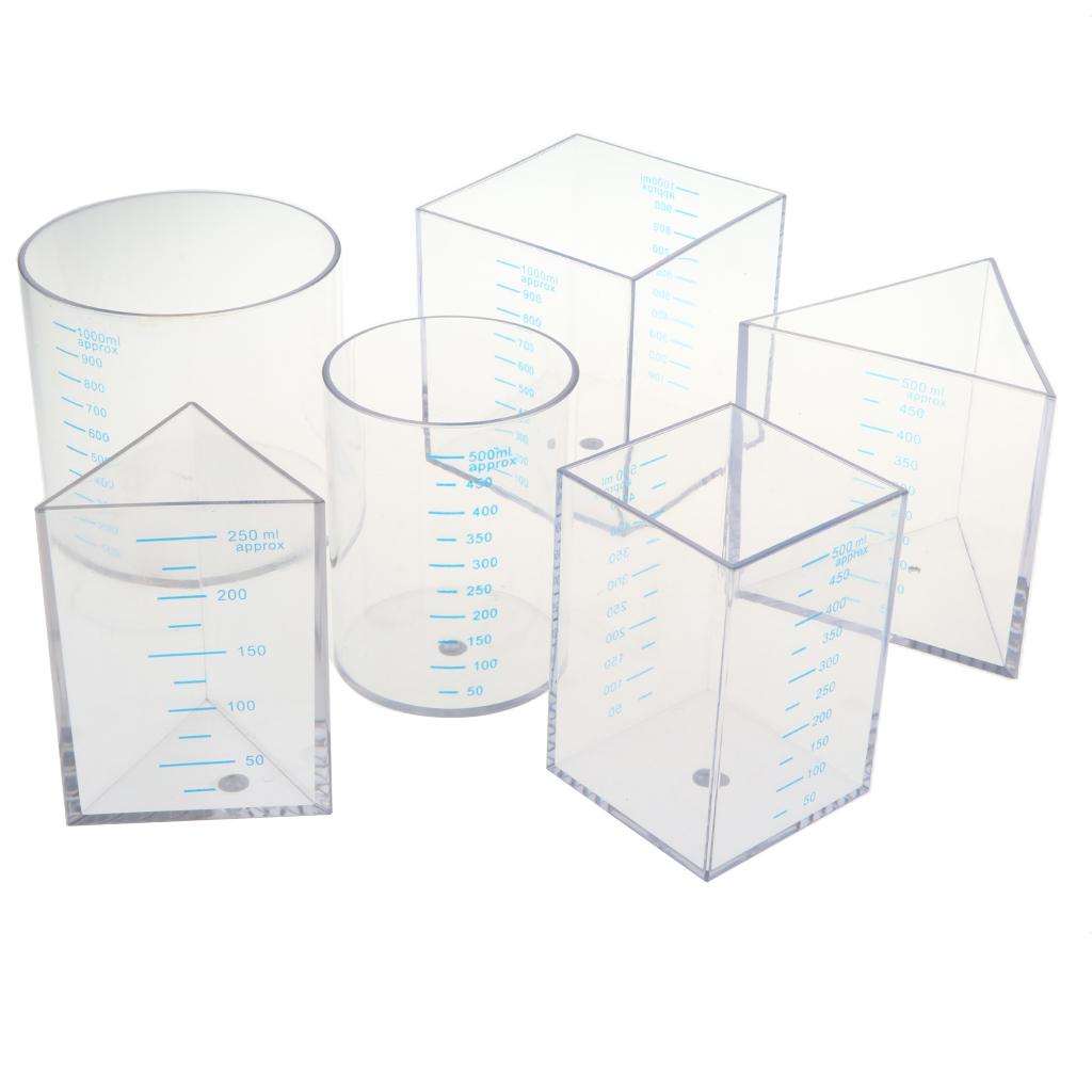 Includes 2 pcs triangle prism cup: 500ml & 250ml; 2pcs cuboid cups: 1000ml & 500ml; and 2 pcs cylinder cups: 1000ml & 500ml.