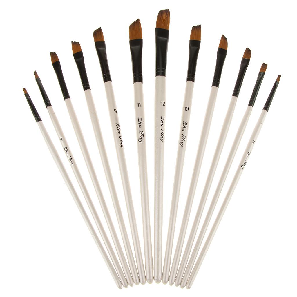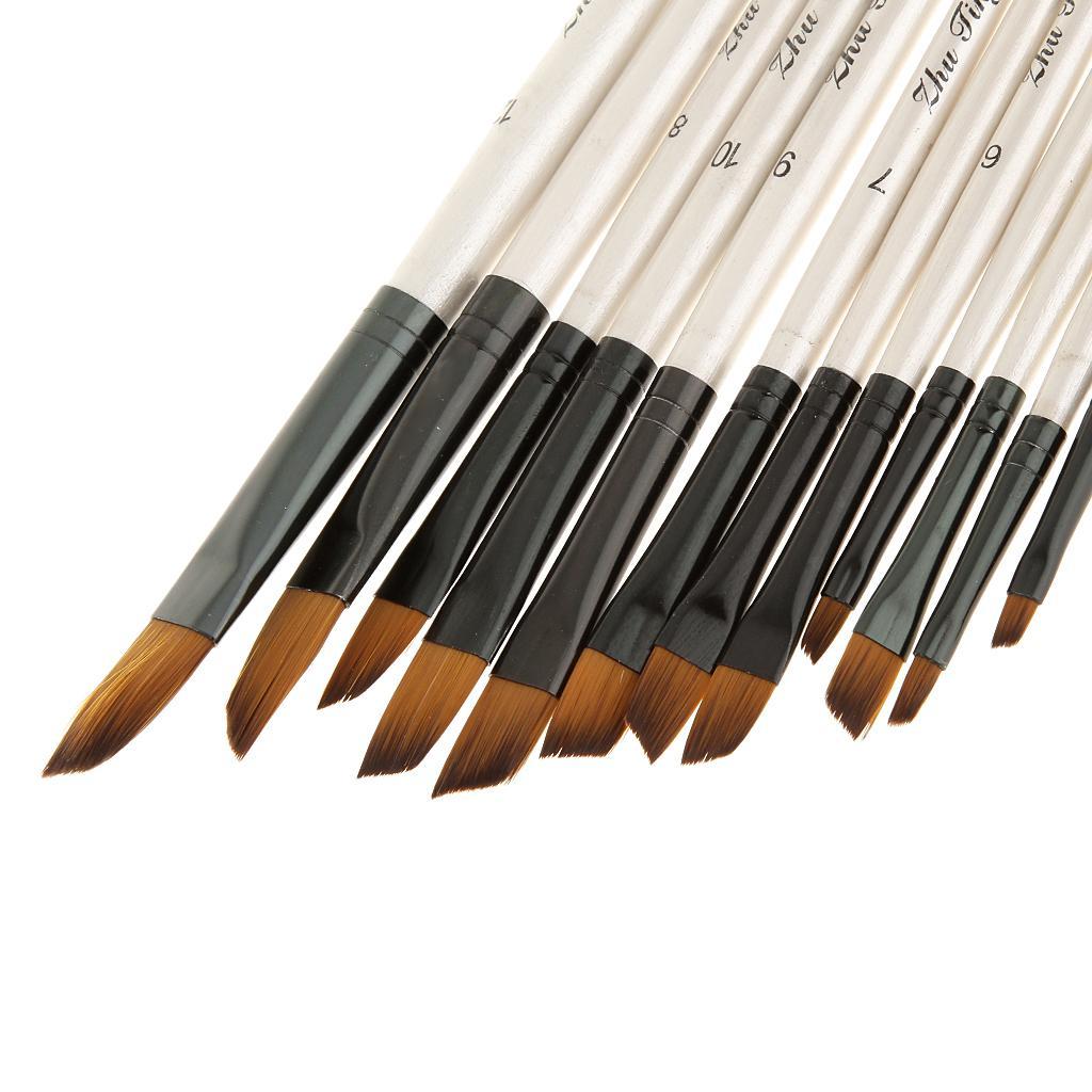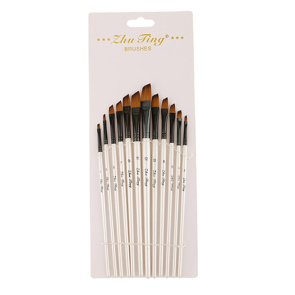 Set of 12 Pcs Nylon Hair Paint Brush Artist Painting Slant Tip White Handle