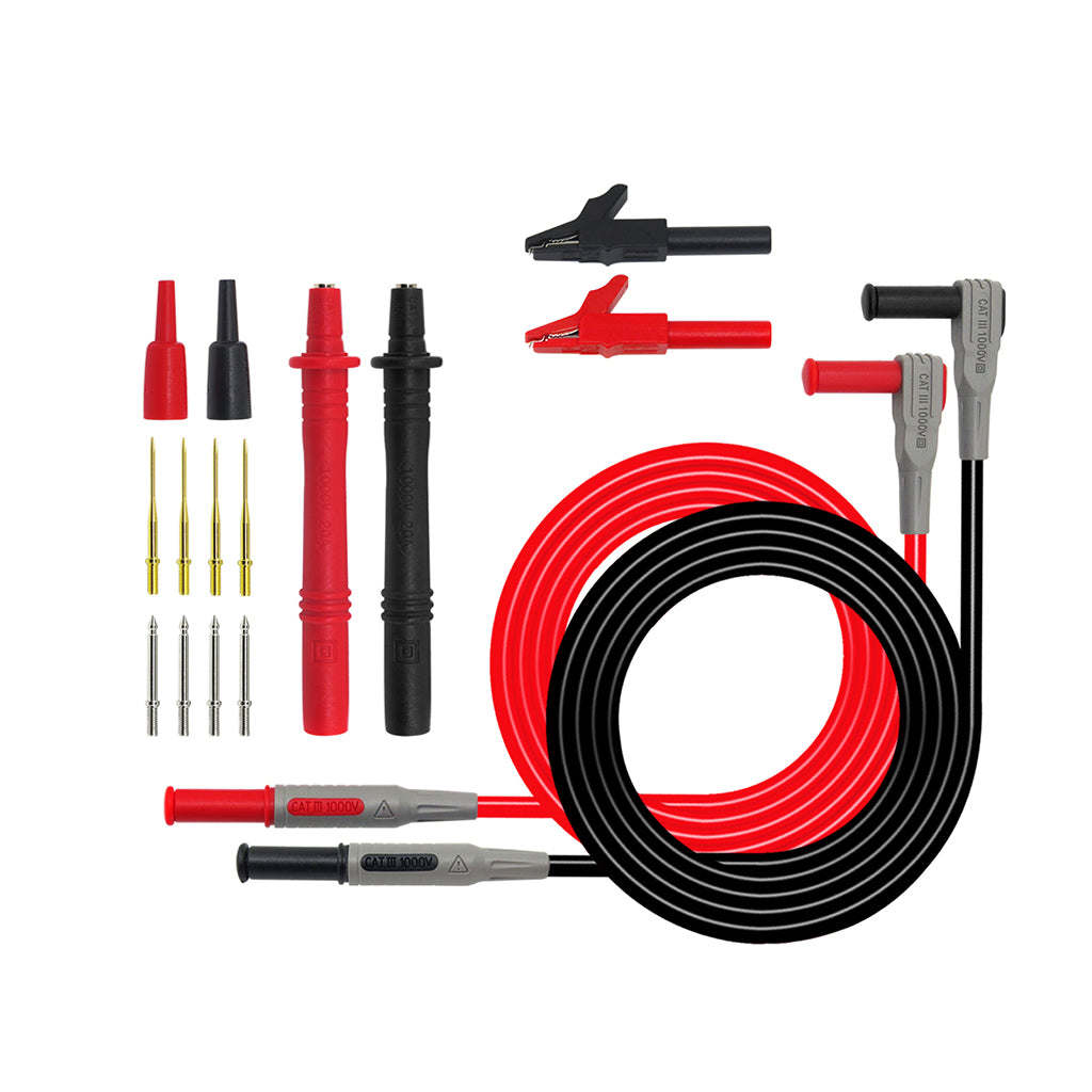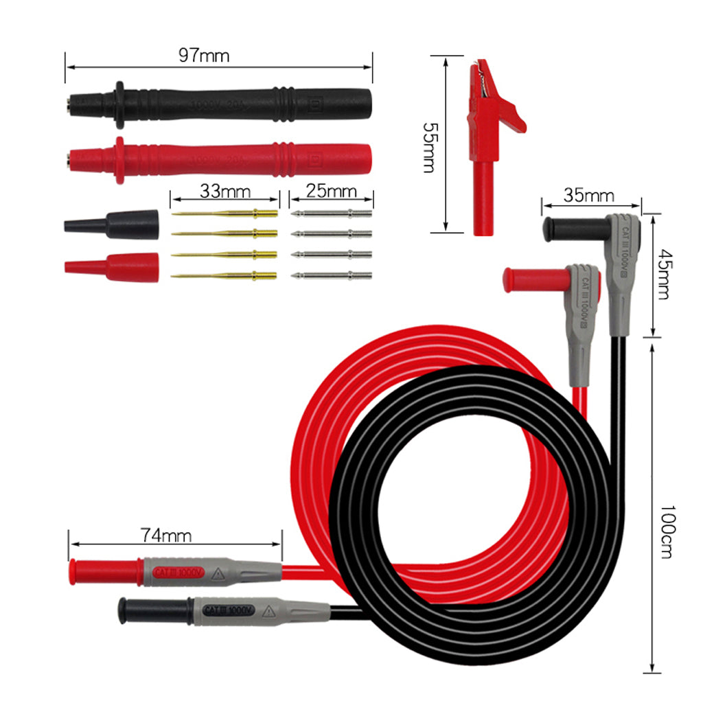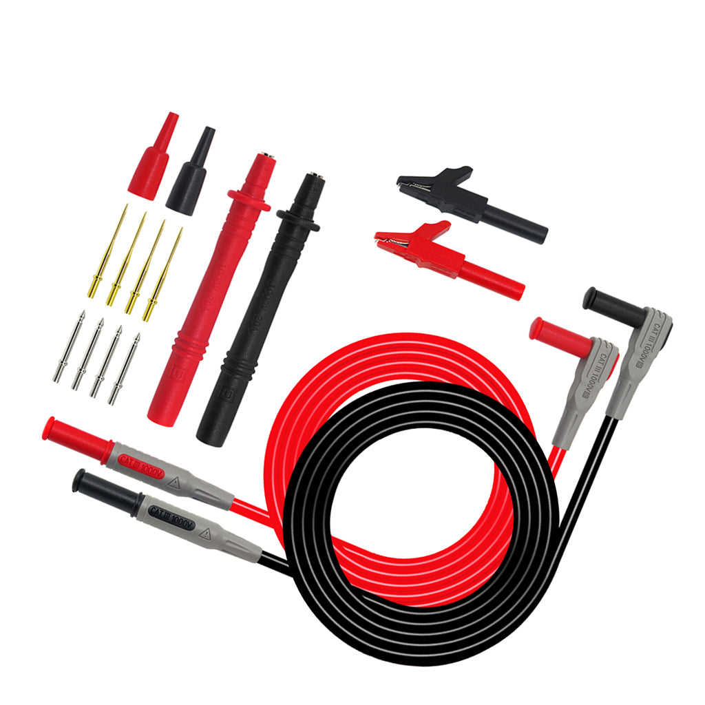 Electronic test leads kit includes: 2x 4mm banana plug test leads, 2x alligator clips, 2x test probe, 8x probe tips(4 x gold plated Ultra thin tips, 4 x standard tips, with protective cover case)