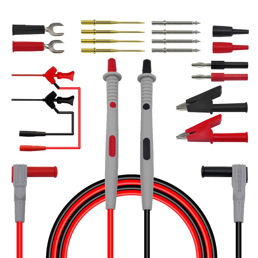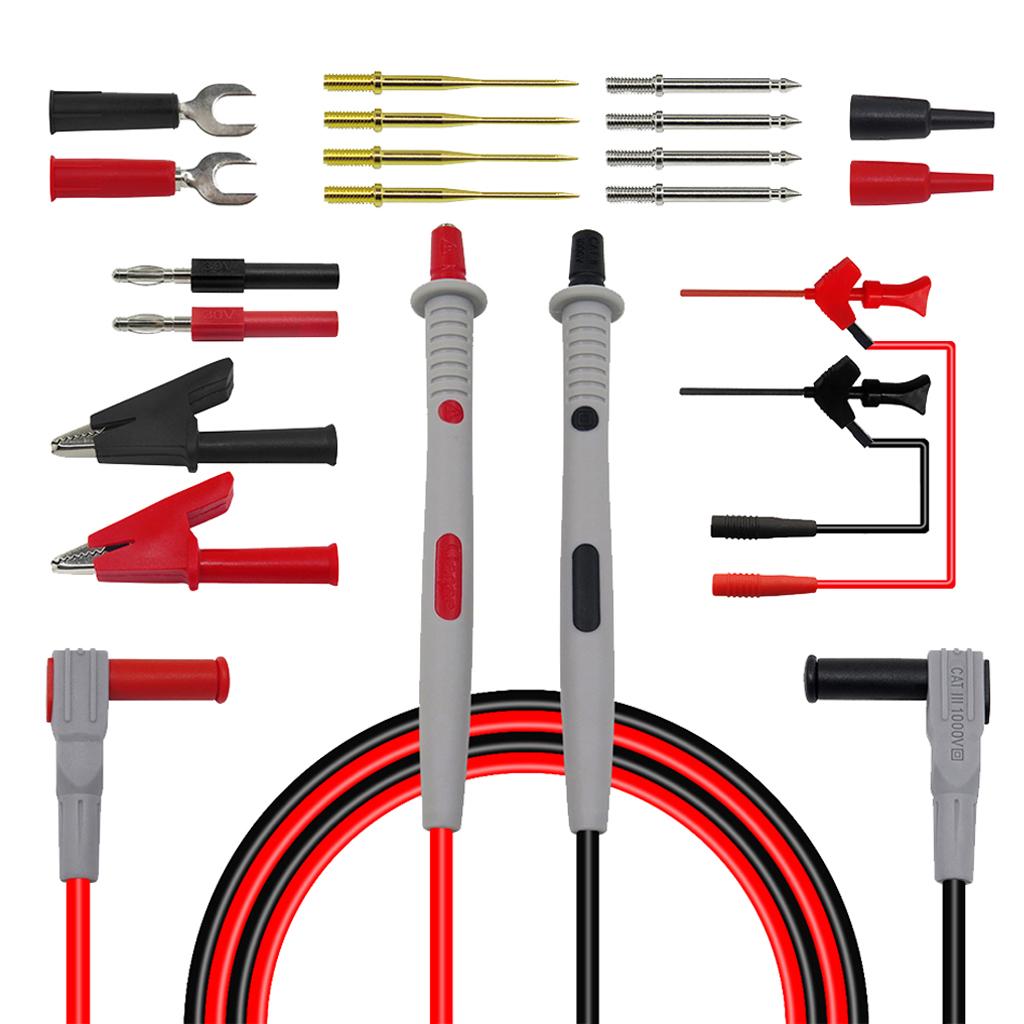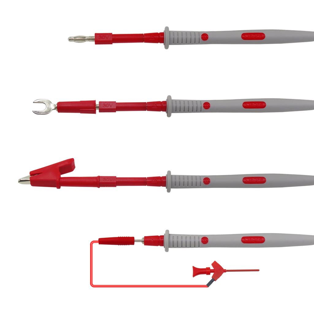 Package Content: 2 x 4mm Banana Plug Mutimeter Probe Test Leads; 4 x Gilded sharp needle; 4 x Standard needle; 2 x Protective Cap; 2 x U-Type Insert; 2 x 2mm inner spring to 4mm male banana plug adapter; 2 x Crocodile Alligator Clips; 2 x IC testing hook.