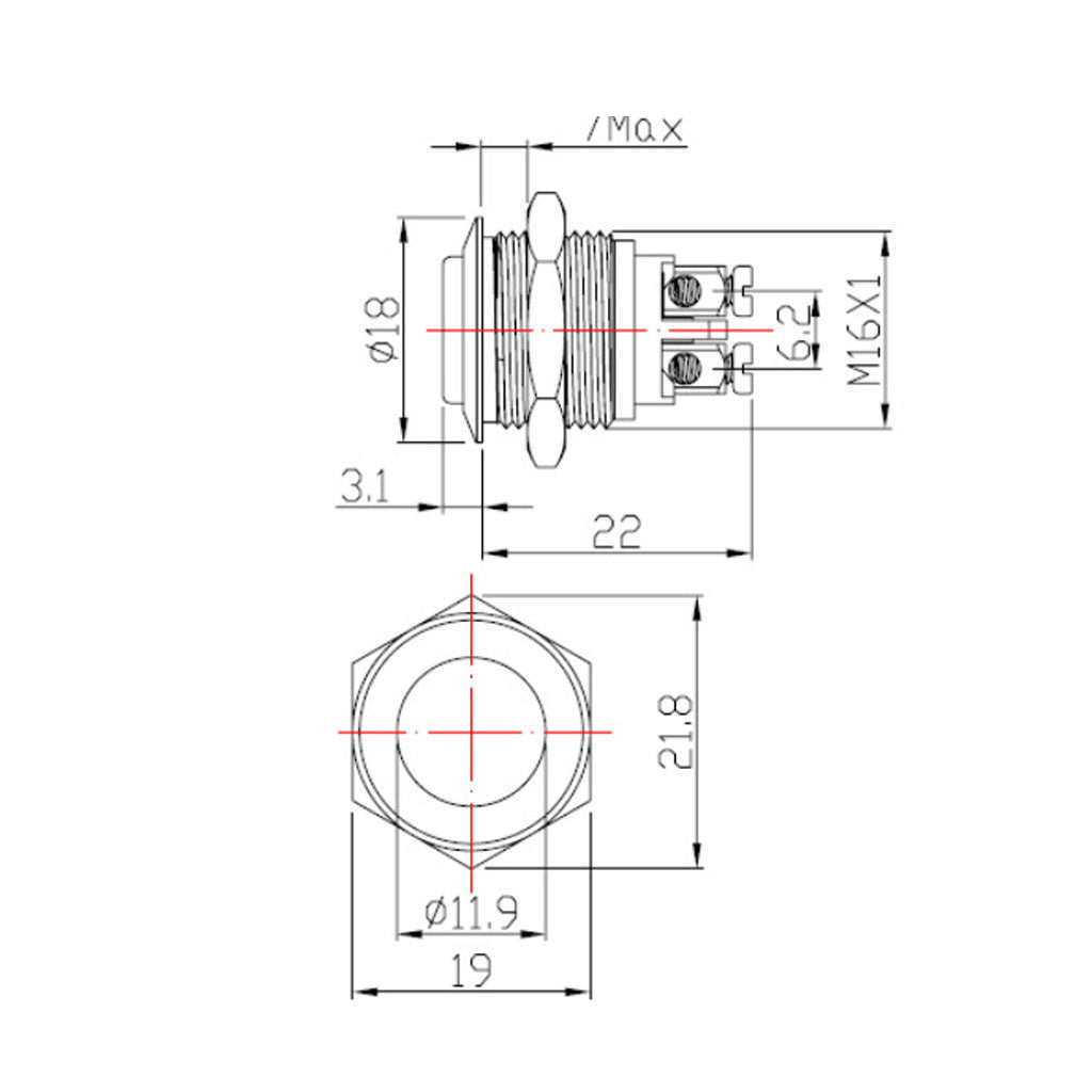 This metal push button switch is suitable for 16mm diameter mounting hole.