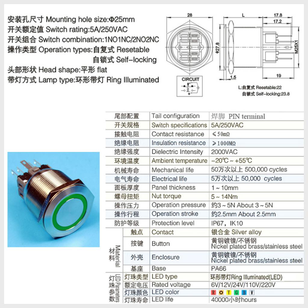 Mounting Hole Size: Φ25mm, Switch Rating: 5A/250AC, Switch Combination : 1NO1NC