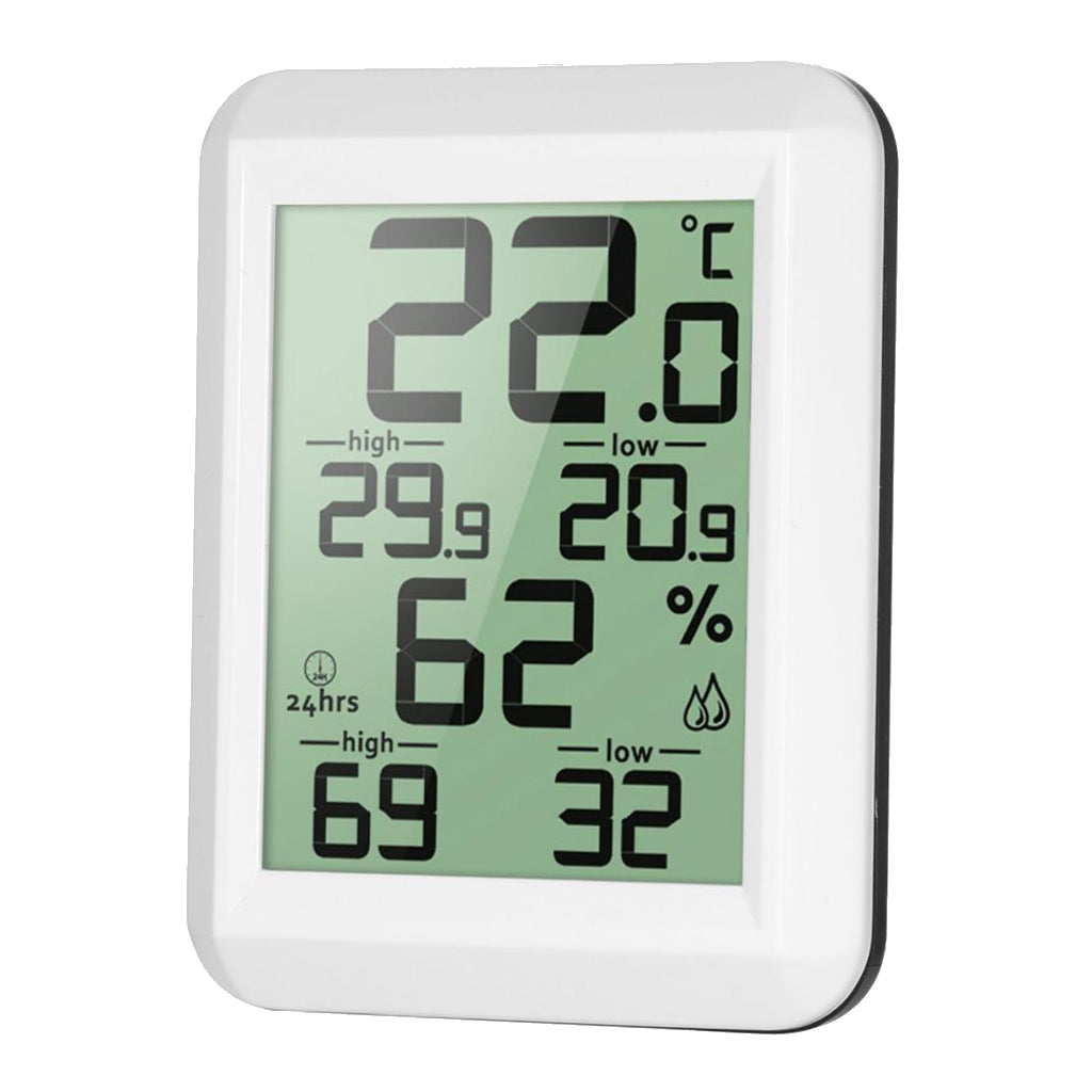 Large LCD display shows real-time temperature, lowest & highest temperature, relative humidity, lowest & highest humidity and humidity icon.