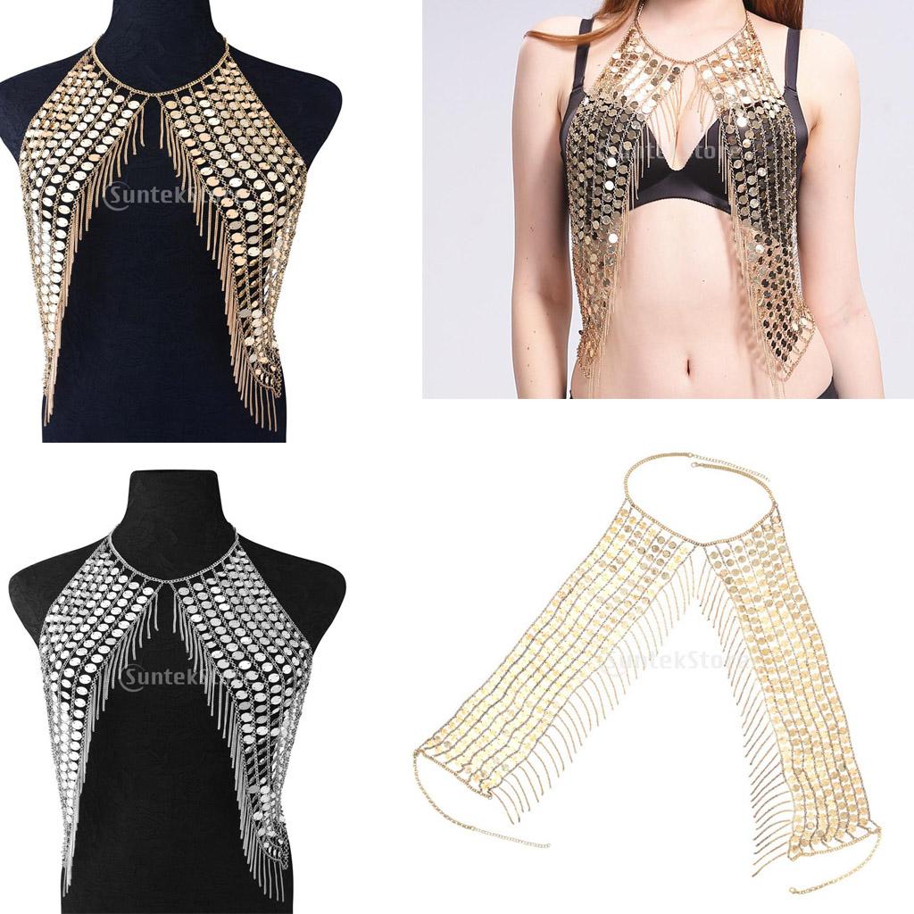 2 Pieces/ Set Sequins Tassels Necklace Bikini Bra + Crystal Leg Thigh Chain