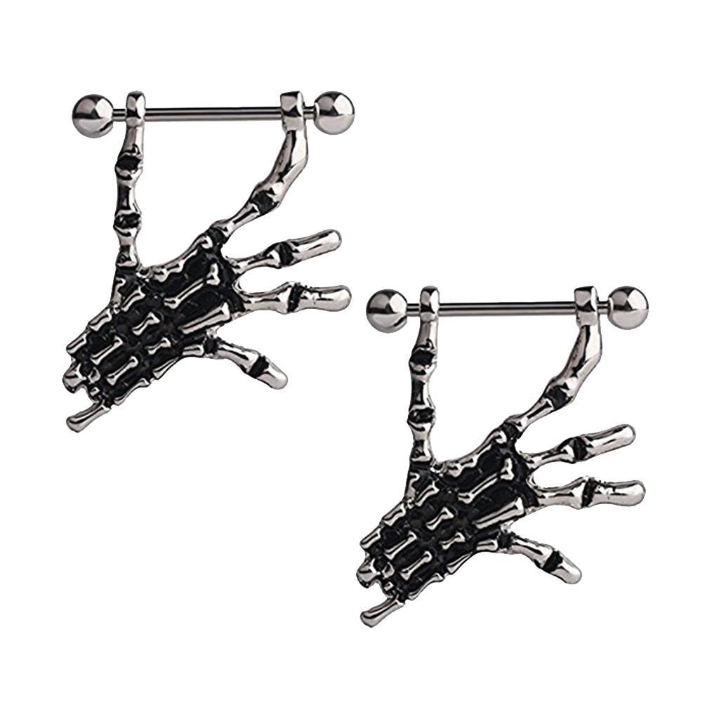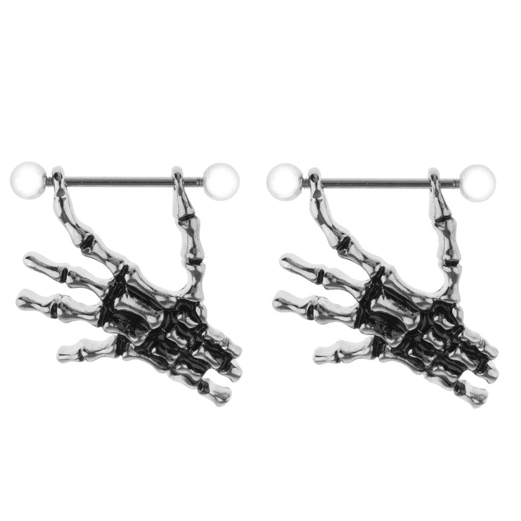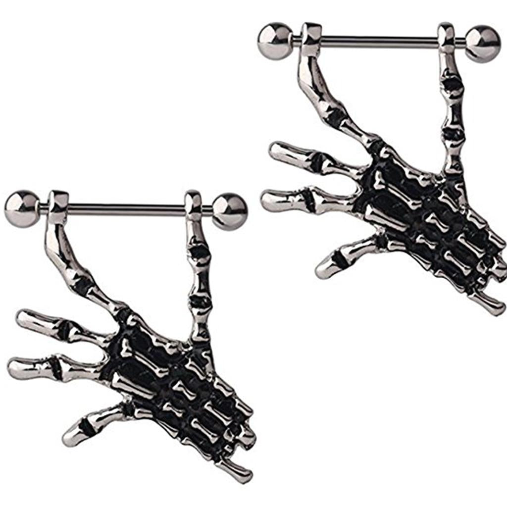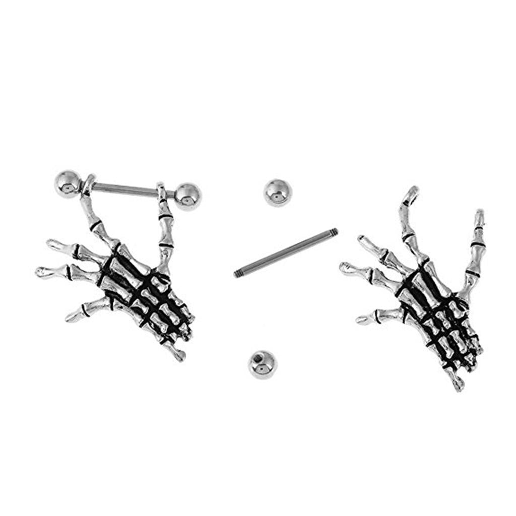 2pcs Punk Skeleton Hand Skull Dangle 18G Nipple Bars Barbells Piercing Rings