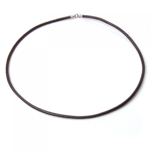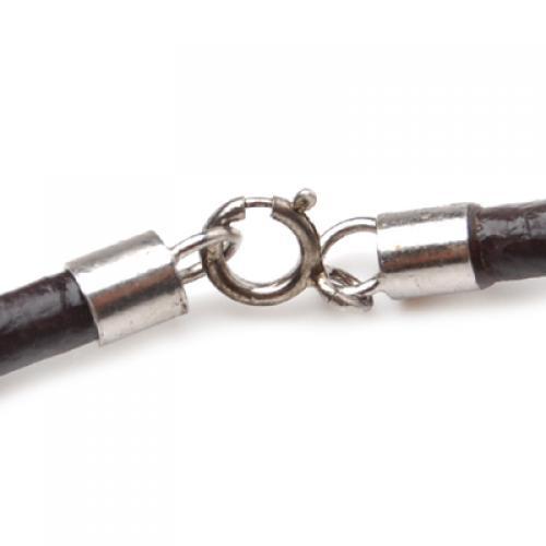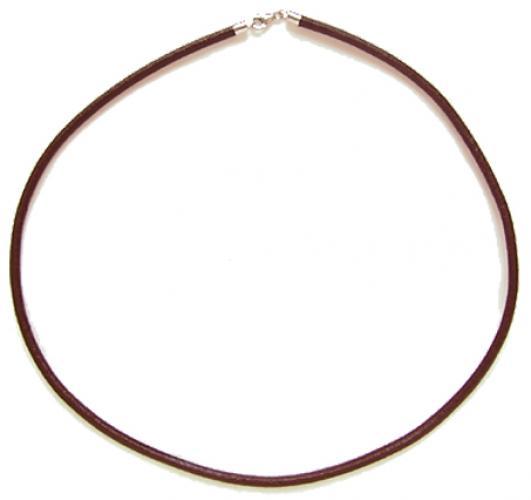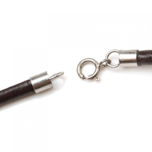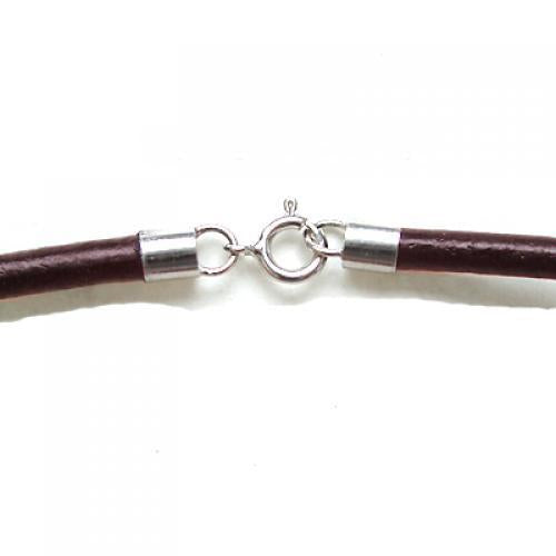 Be in fashion with a 3 mm thick brown leather cord choker style necklace. The leather has a smooth finish and secures with a spring ring clasp.The ring clasp is round and made with 100% Solid .925 Sterling Silver material.It is stamped with a .925 stamp, that is too small to show up in the photo.Wear alone or with a pendant or slide.