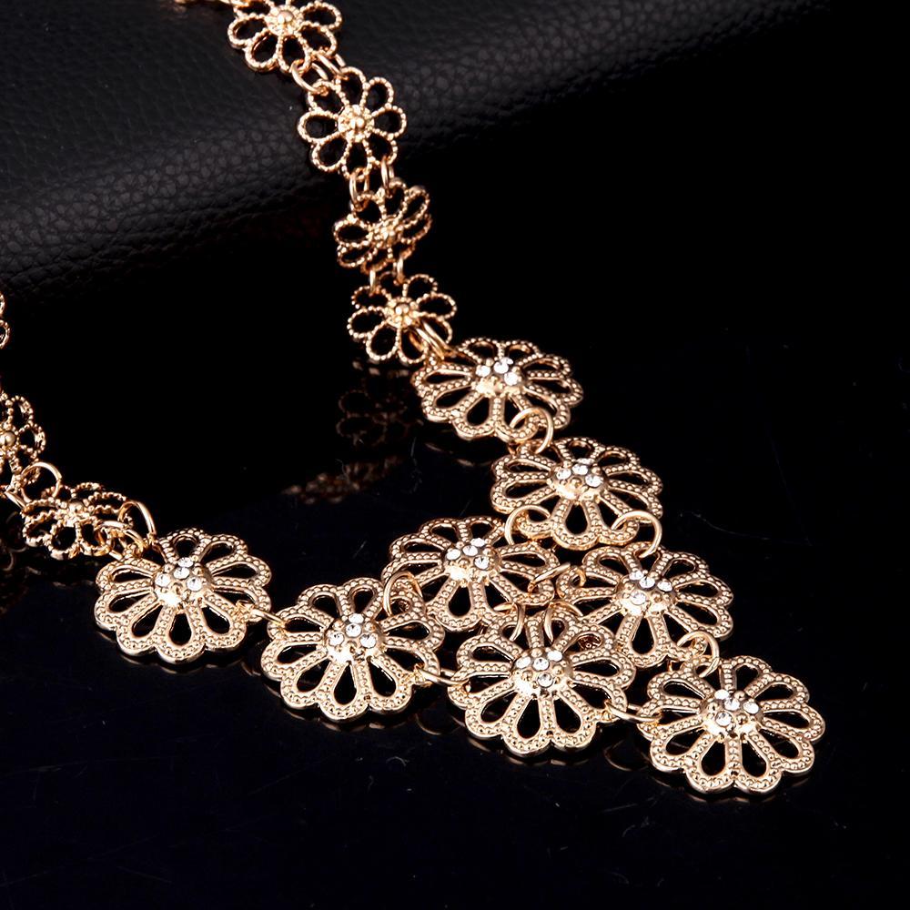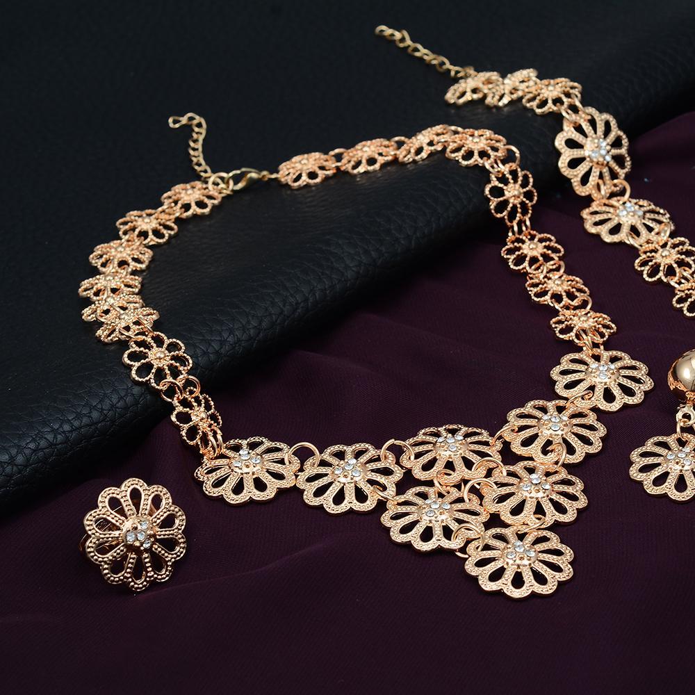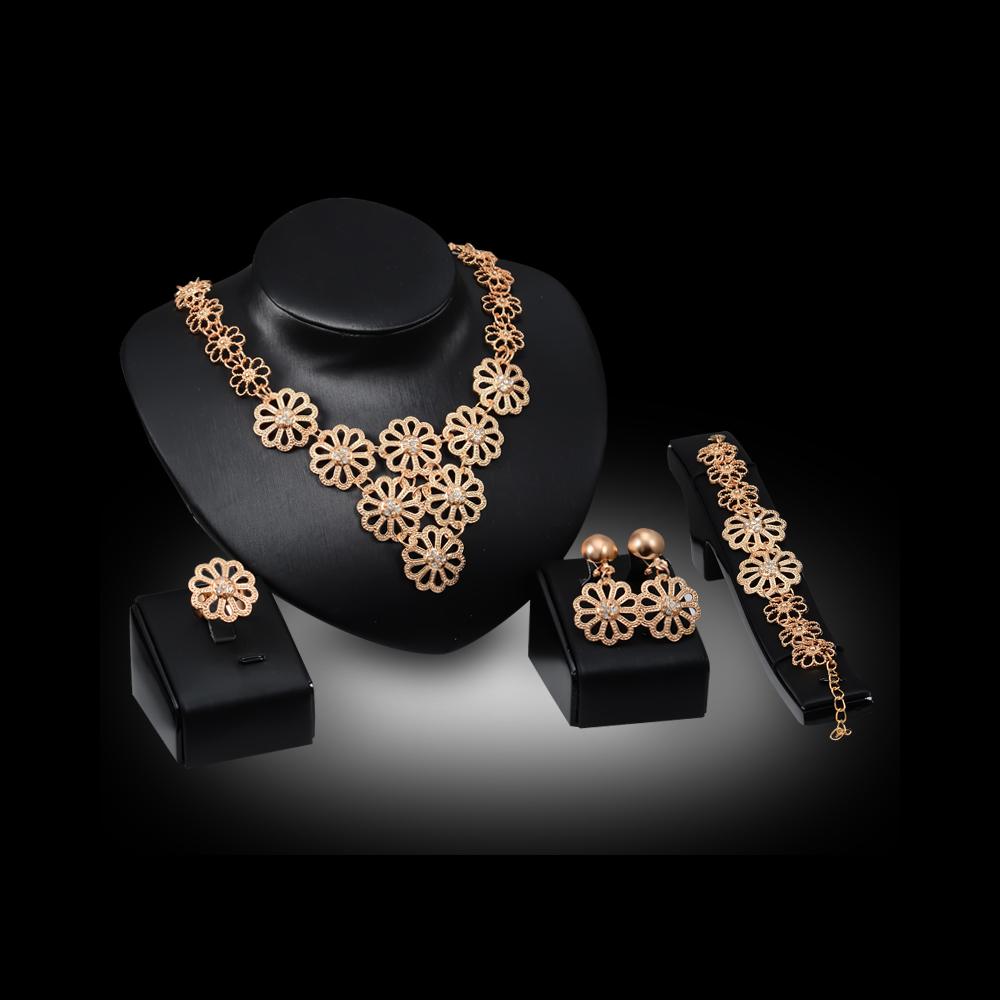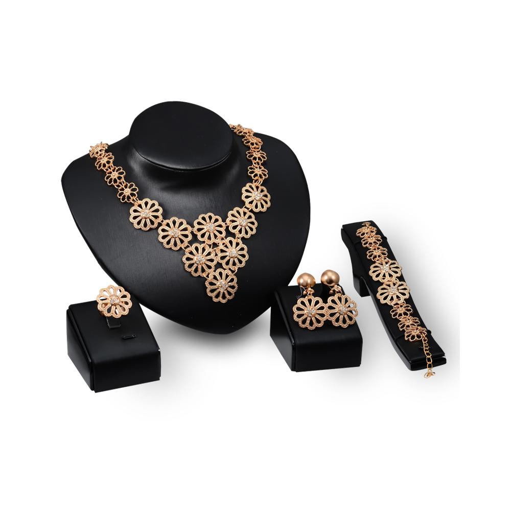 4 in 1 Alloy Flower Hollow Necklace Bracelet Ring Earrings Jewelry Set Gold
