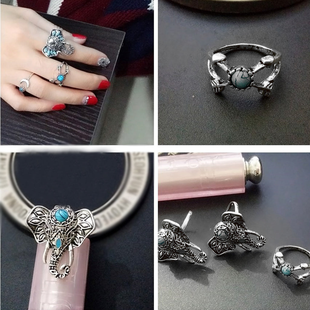 6Pcs Boho Turquoise Elephant Moon Midi Finger Tip Knuckles Rings Silver