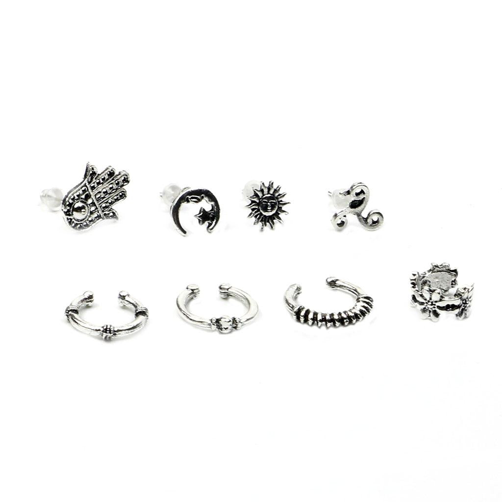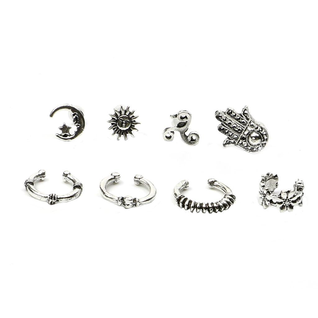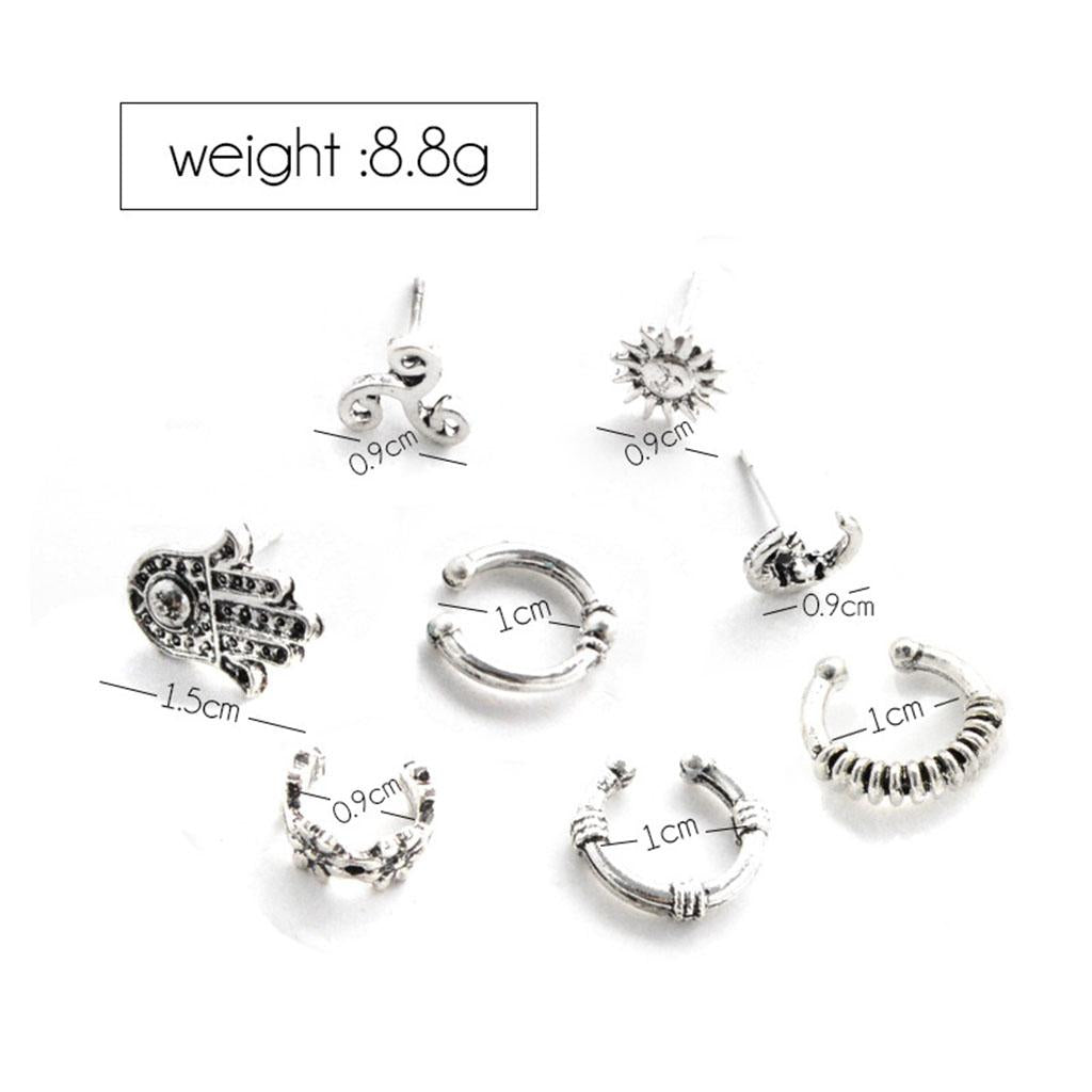 8pcs Women Cuff Earrings Set Antique Silver Sun Fatima Carved Stud Earrings