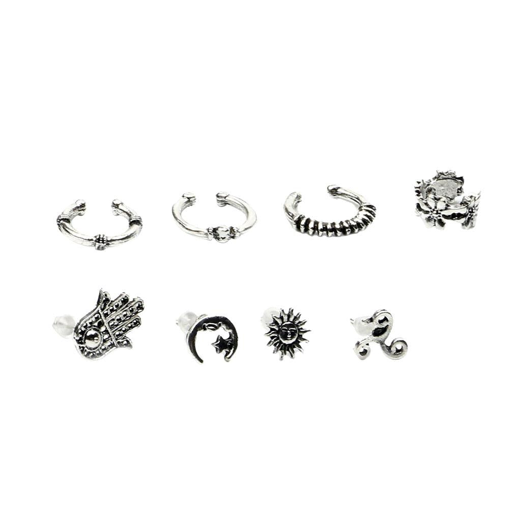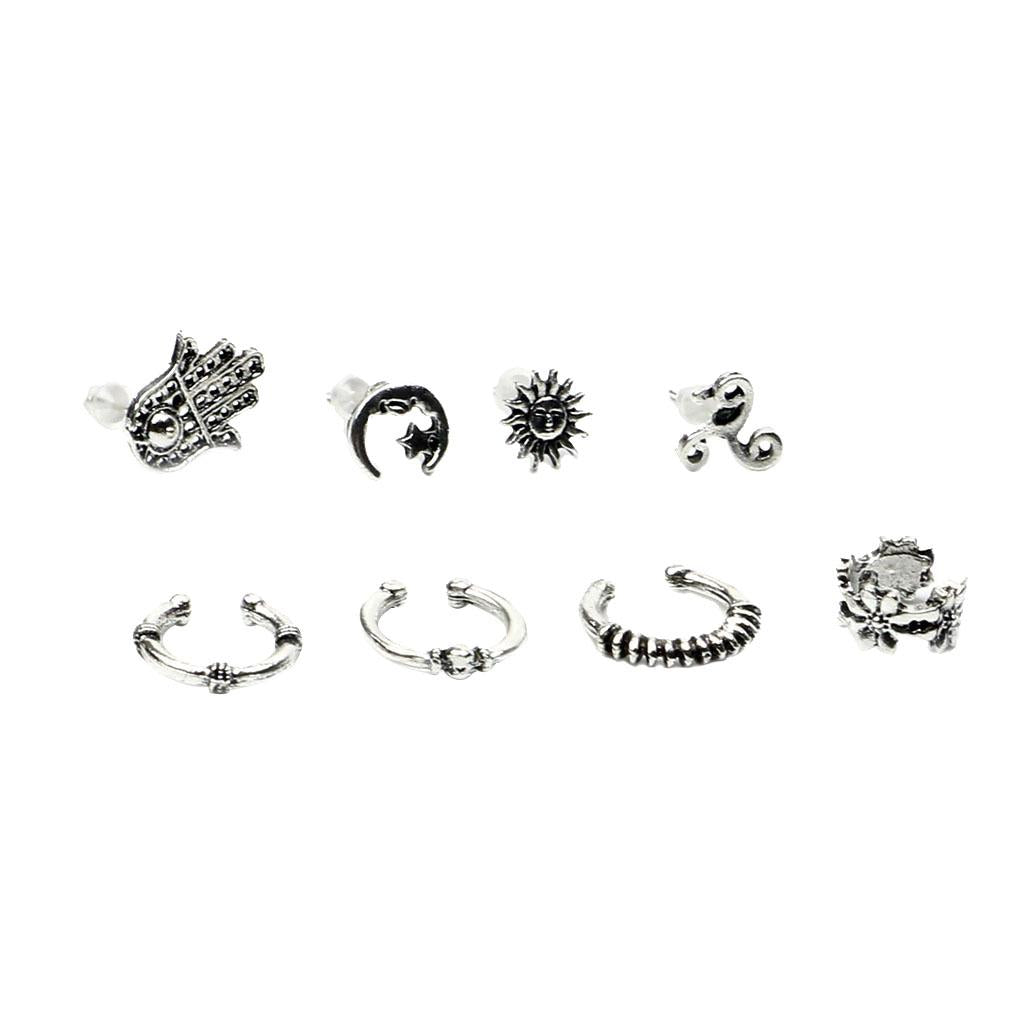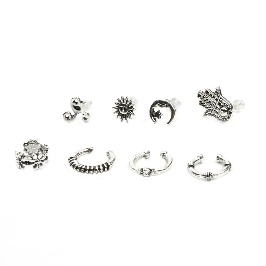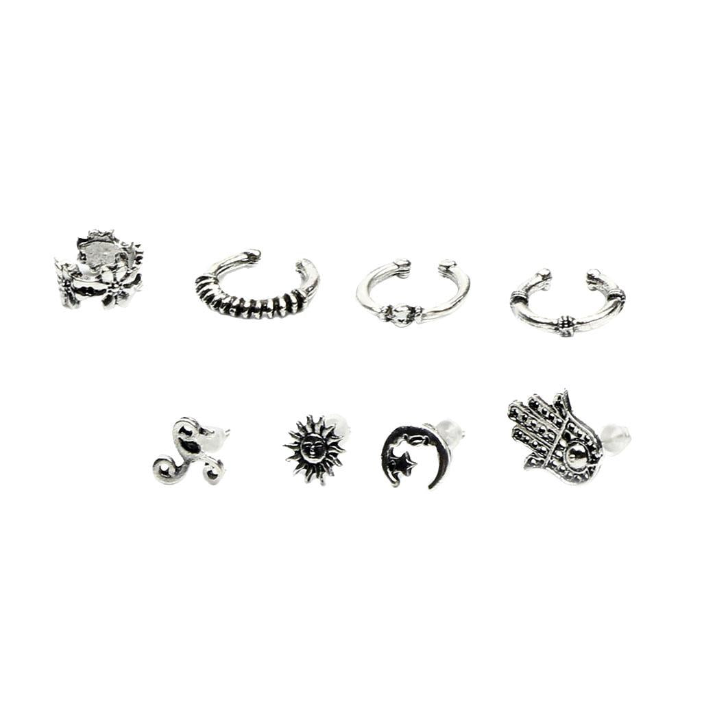 8pcs Women Cuff Earrings Set Antique Silver Sun Fatima Carved Stud Earrings