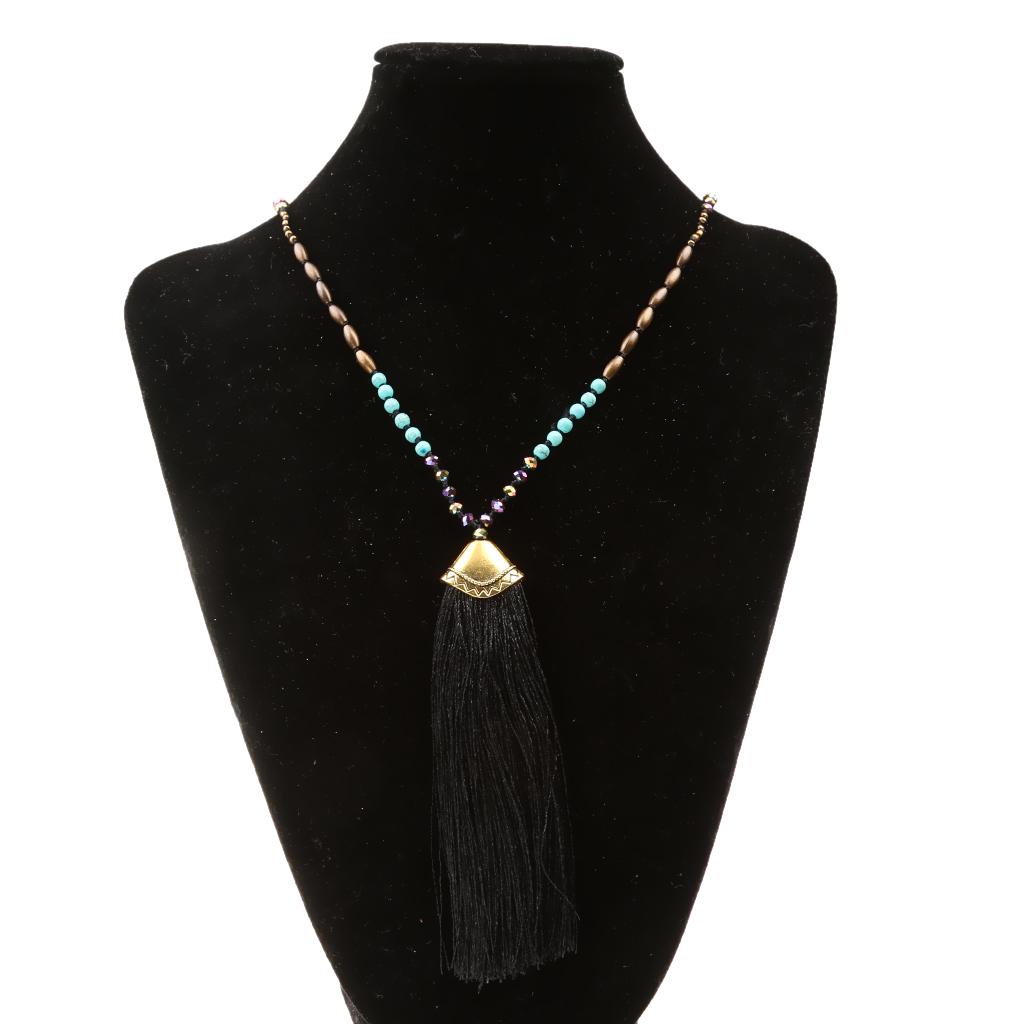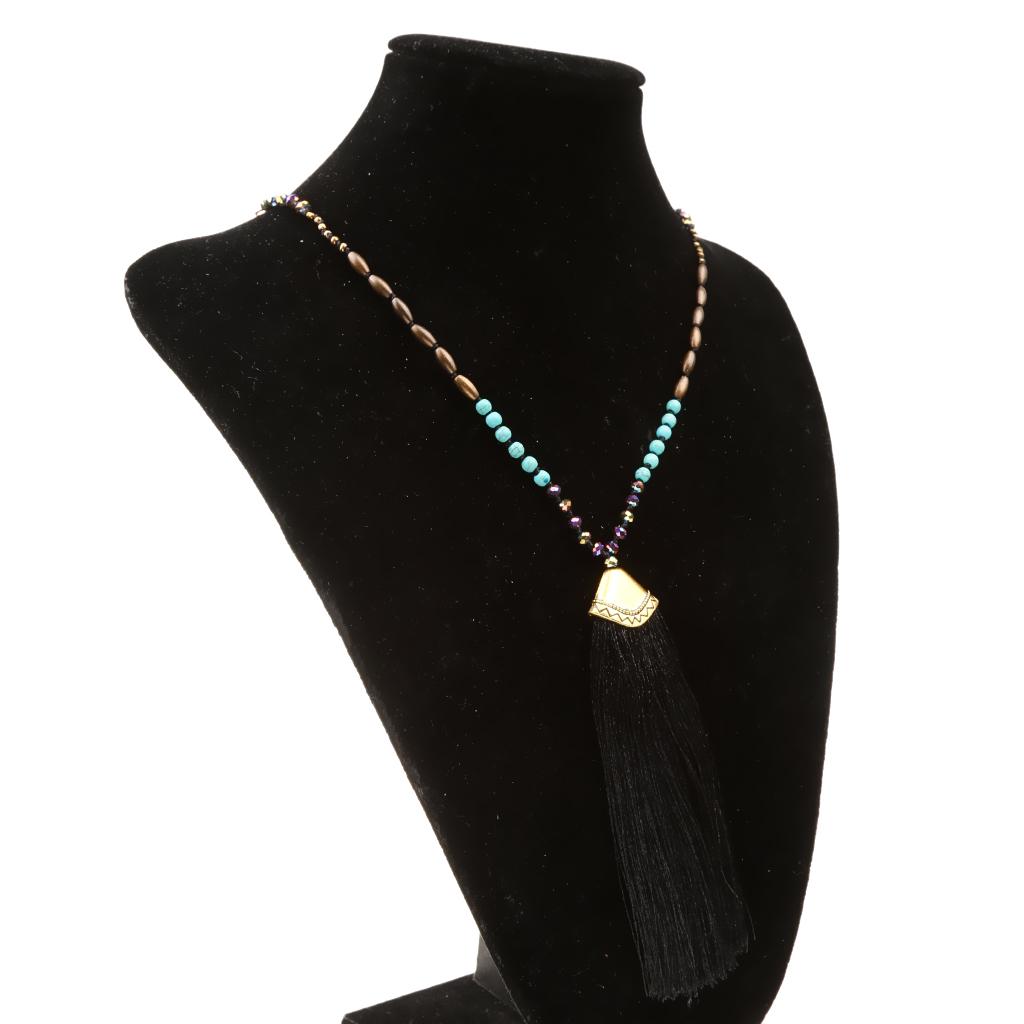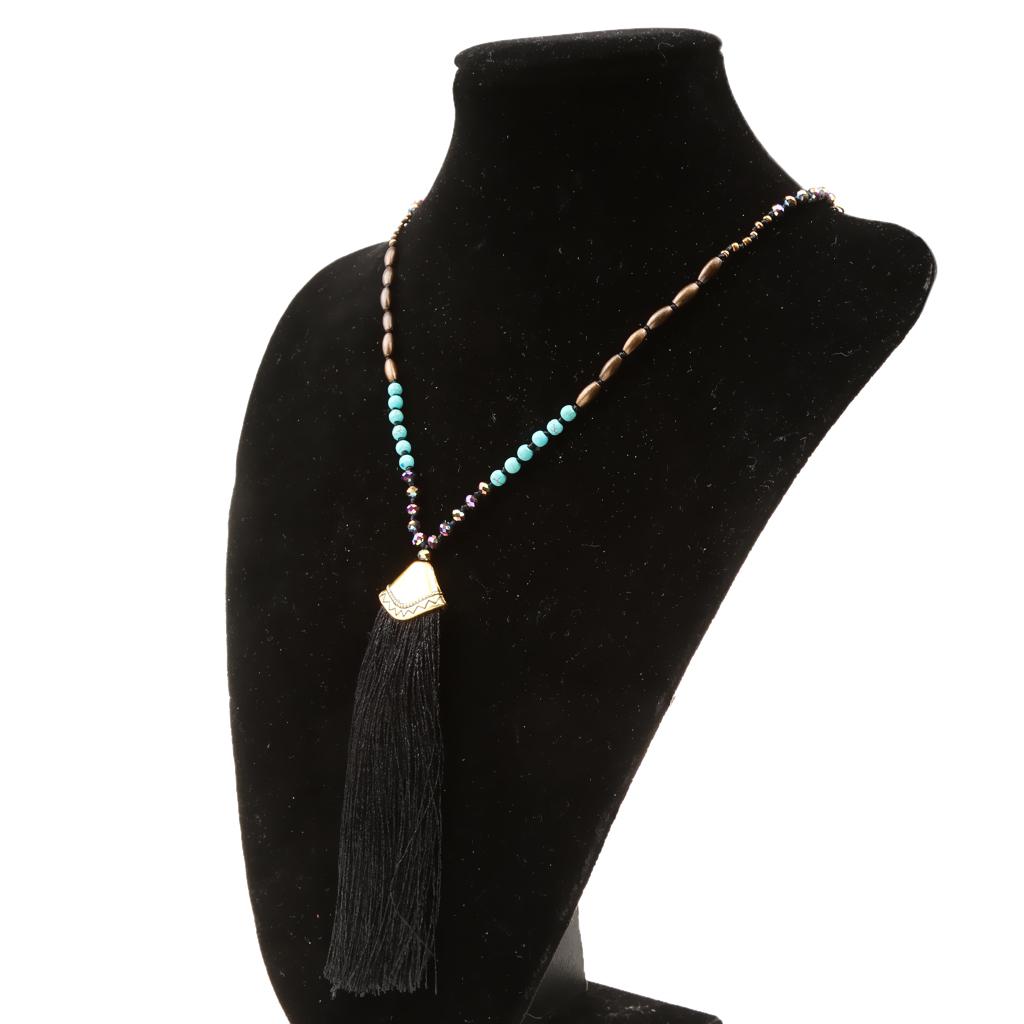 Boho Beaded Rope Chain Tassel Pendant Charm Fringed Necklace Black