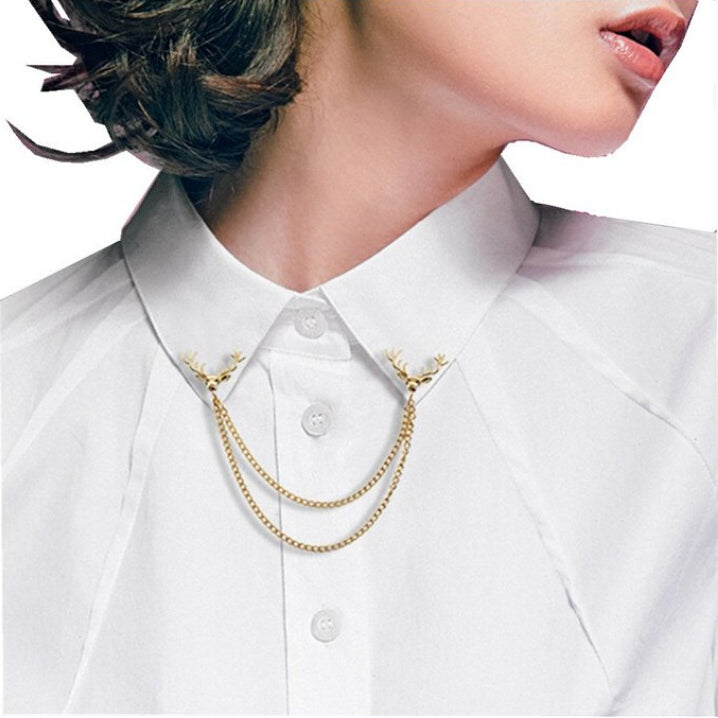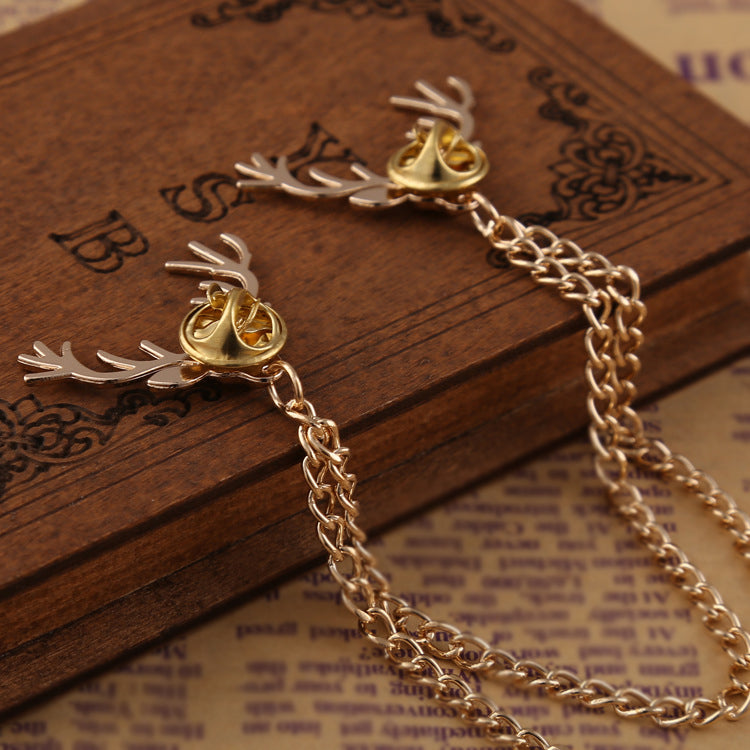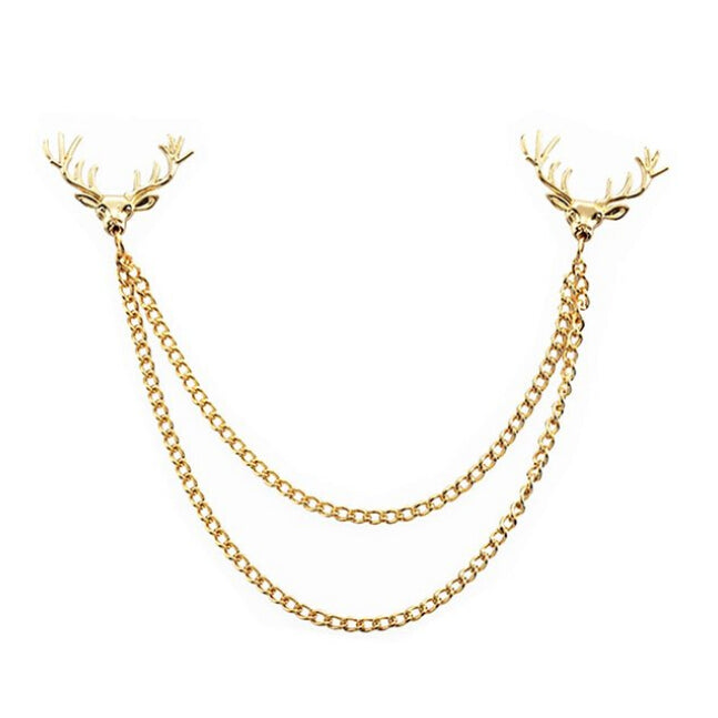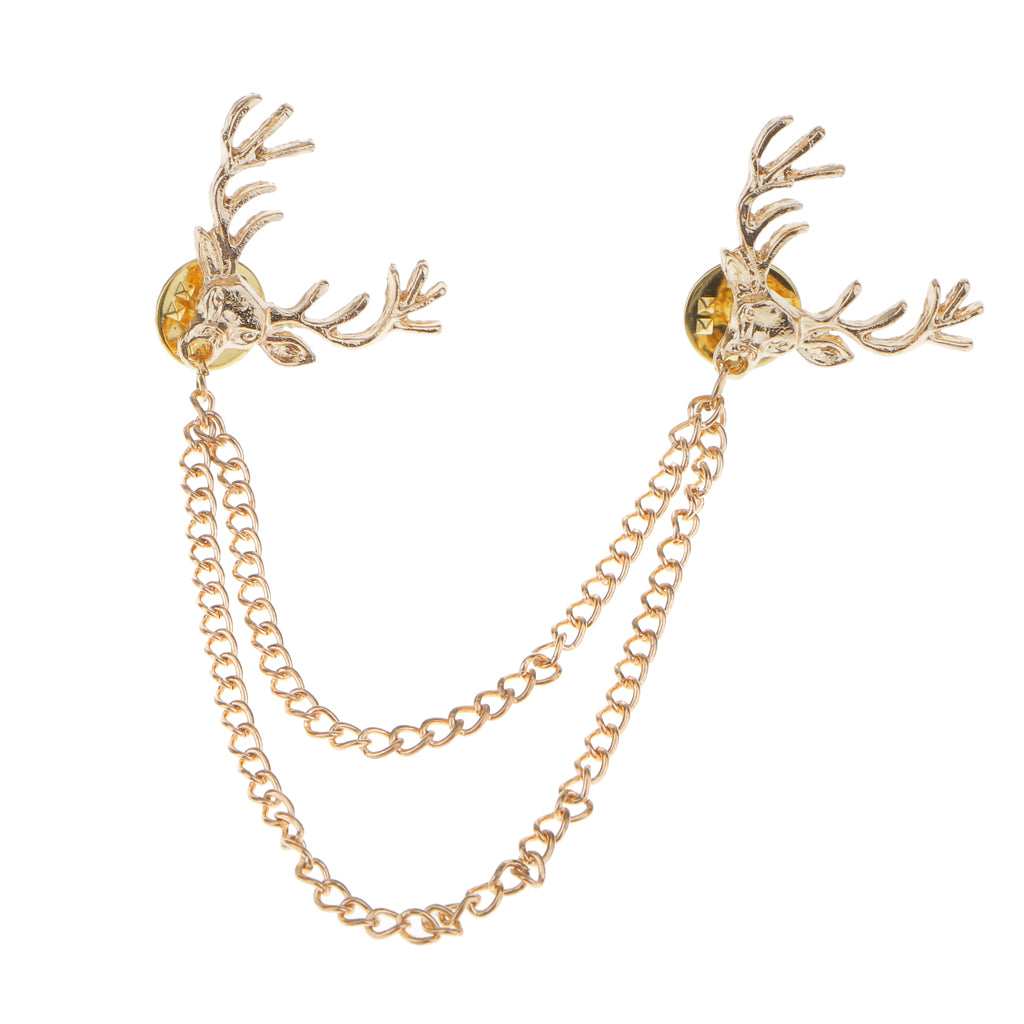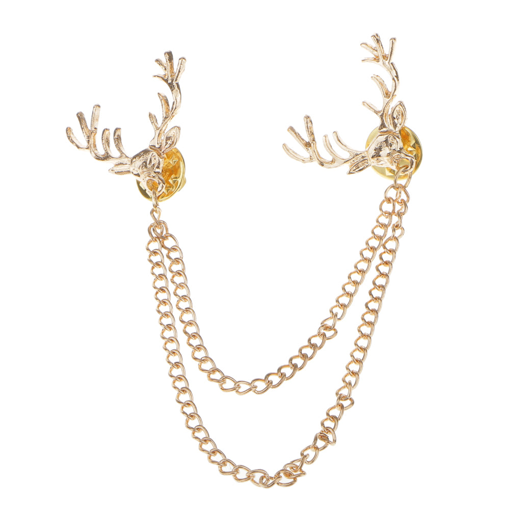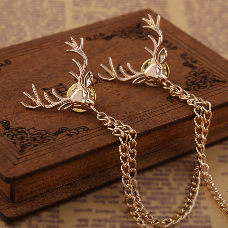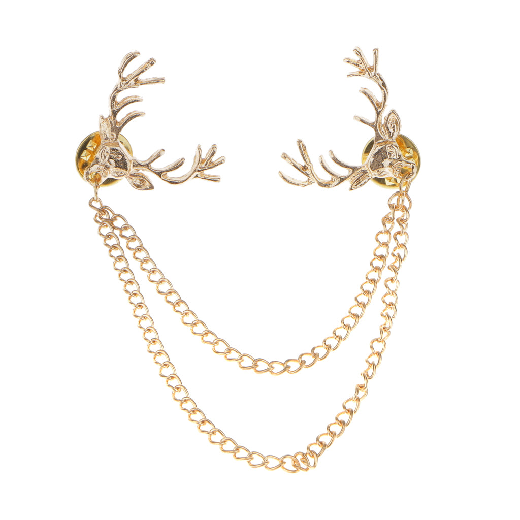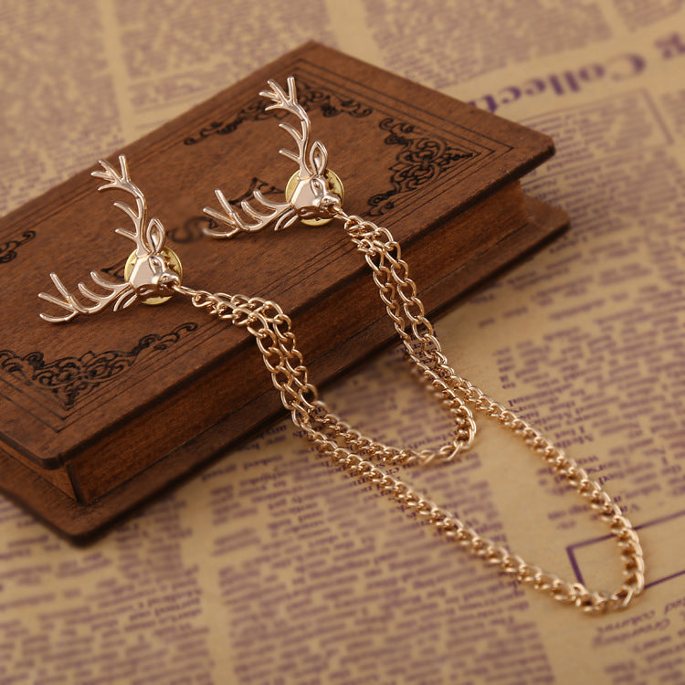 Charming Deer Head Elk Tips Double Chains Tassels Collar Pins Brooch Gold Plated
