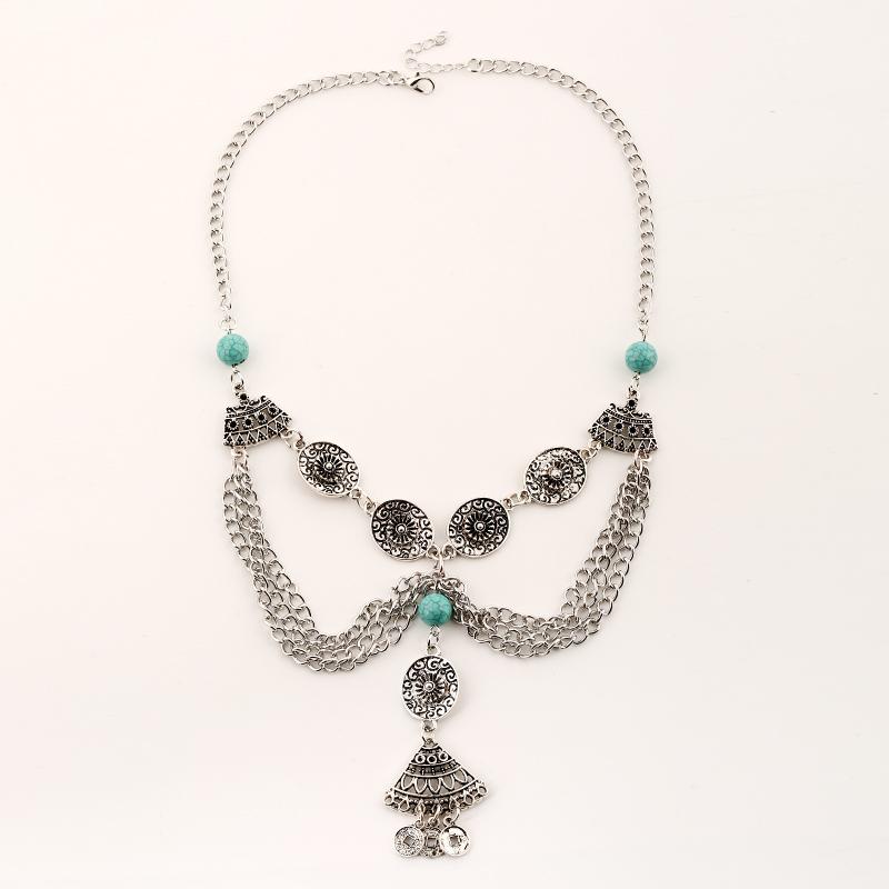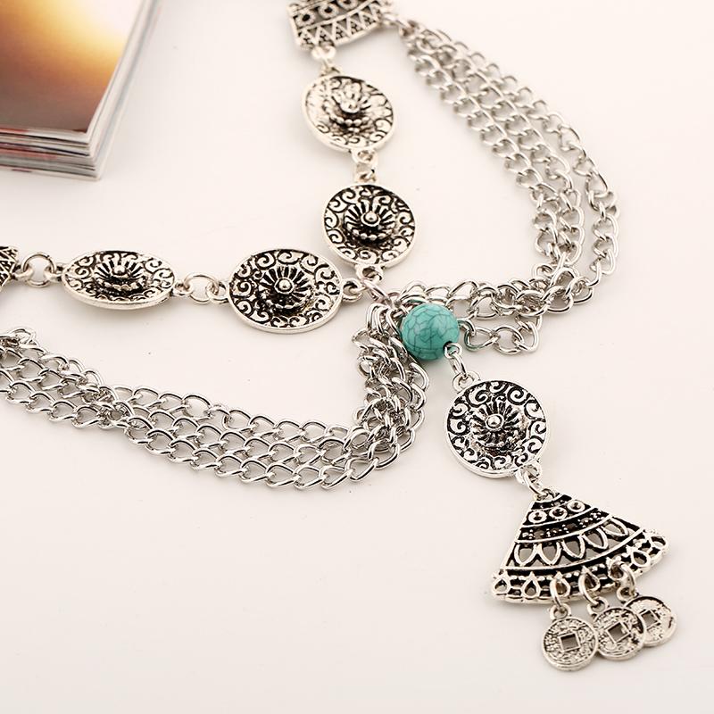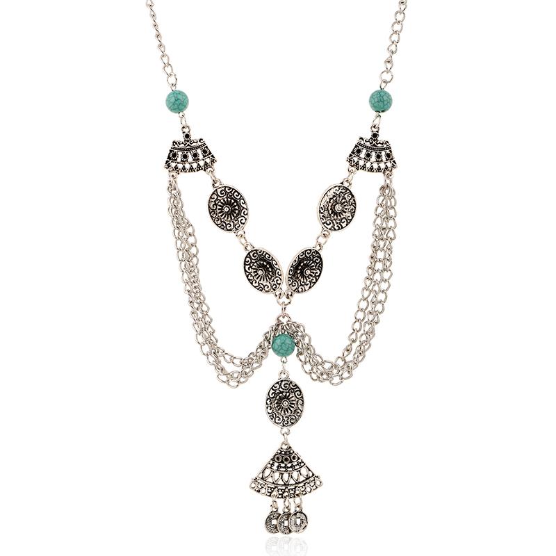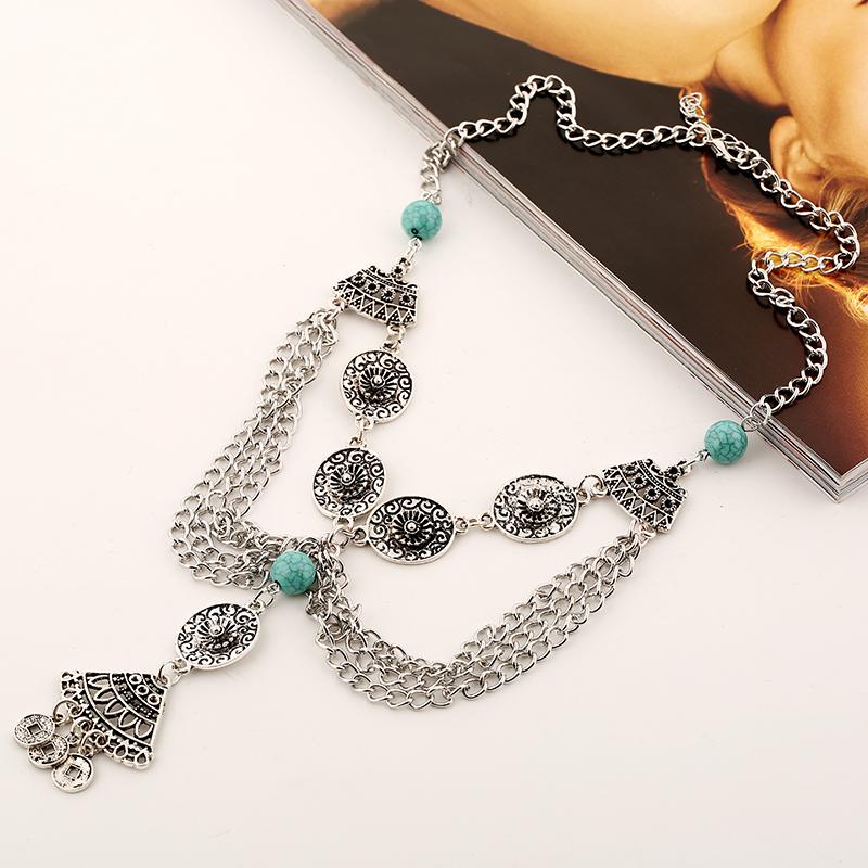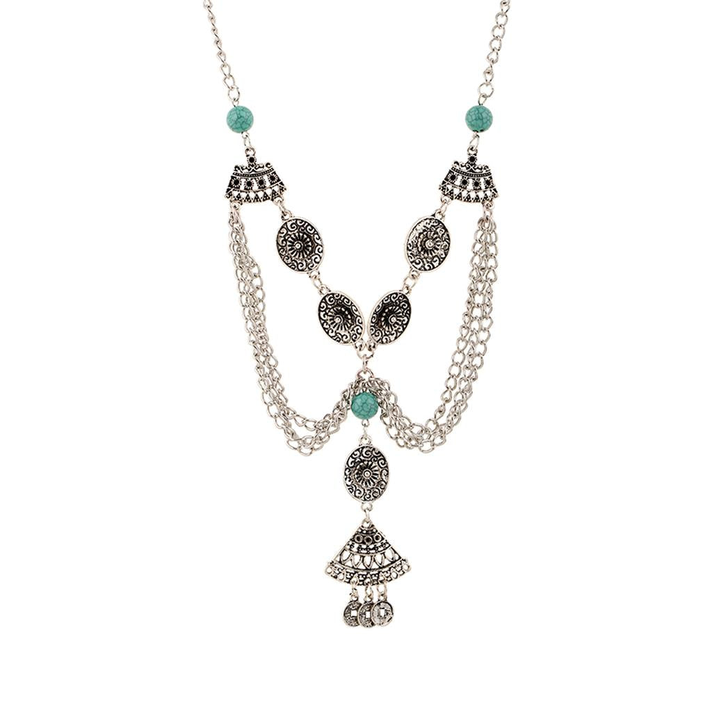 Chunky Silver Necklace Women Vintage Coins Tassel Pendant Turquoise Bead