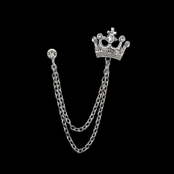 Crystal Rhinestone Crown with Layer Chain Tassels Brooch Lapel Pin Coat Suit