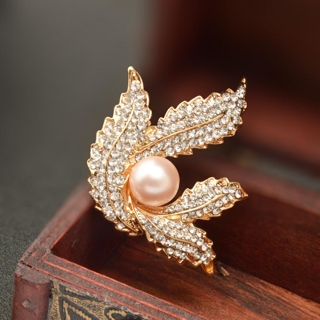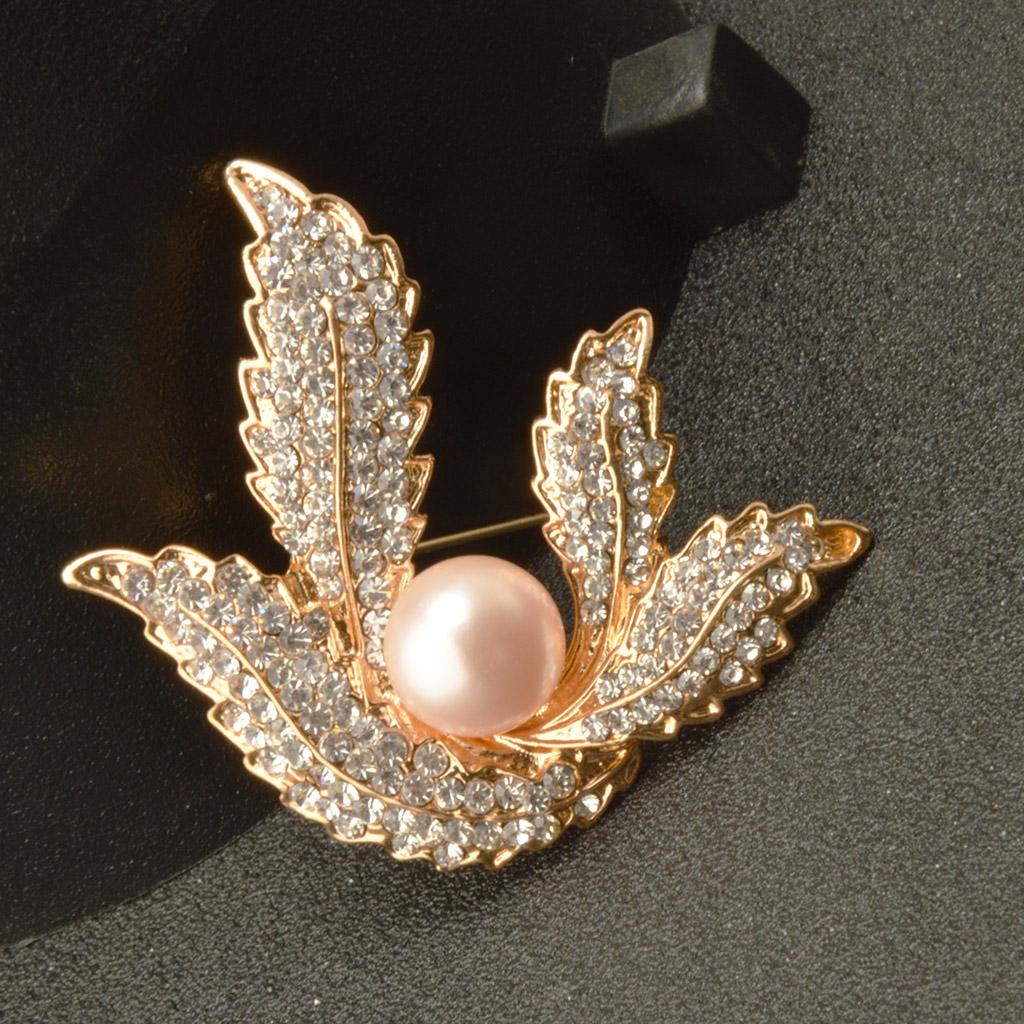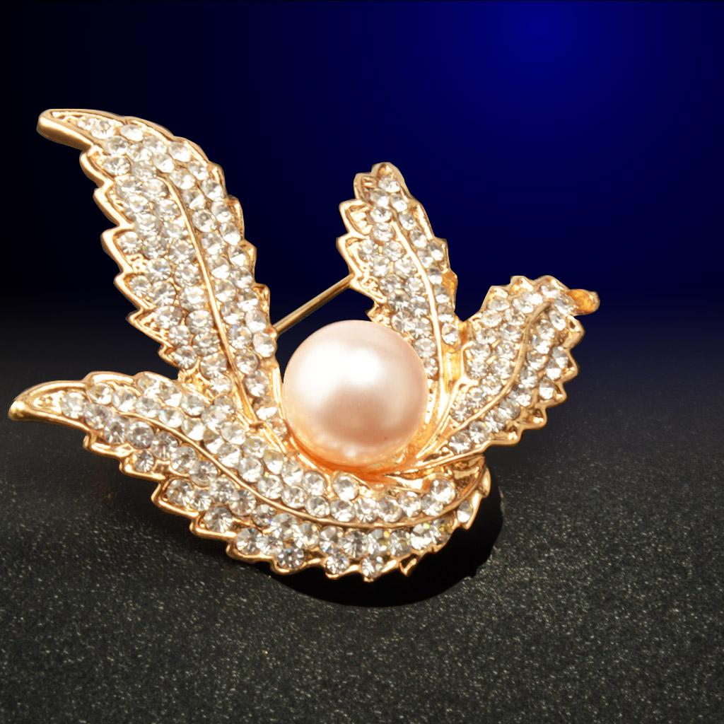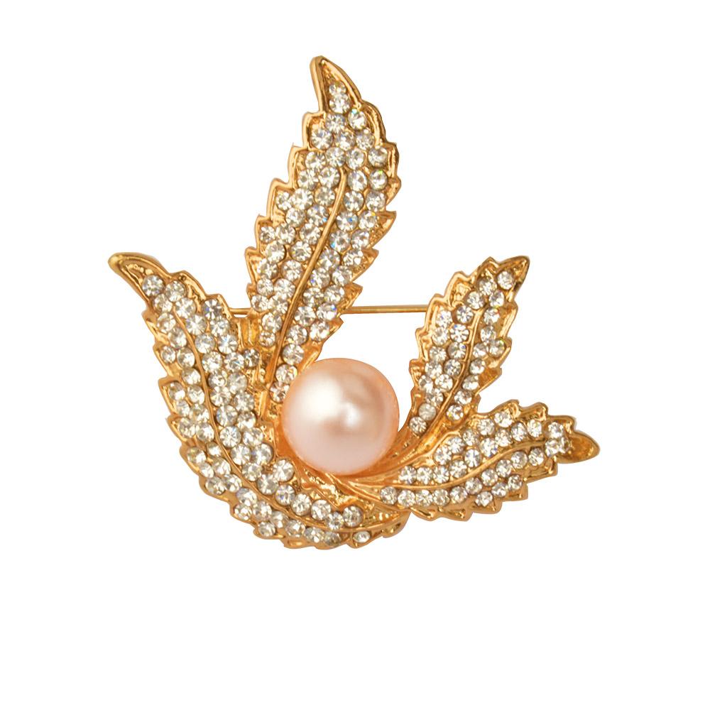 Elegant Leaf Brooch Jewellery Gold Crystal Rhinestone Faux Pearl Brooch Pin for Women