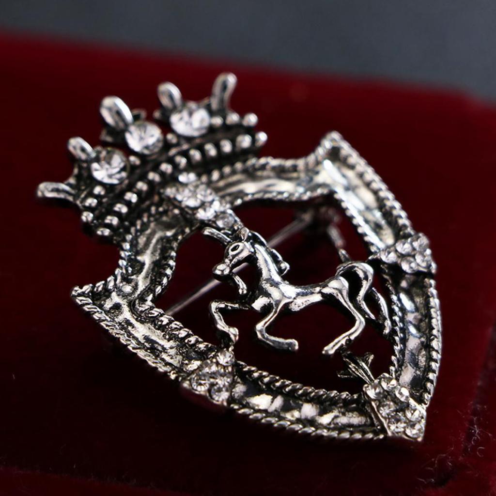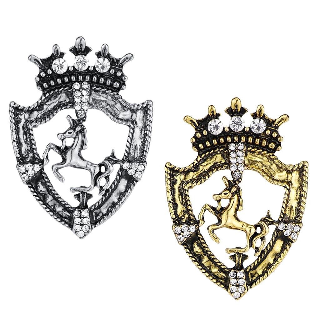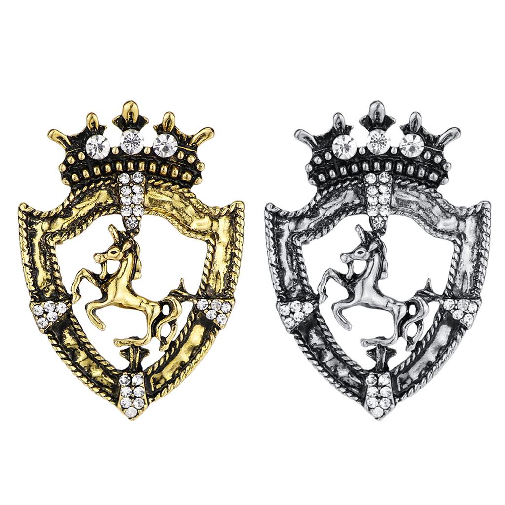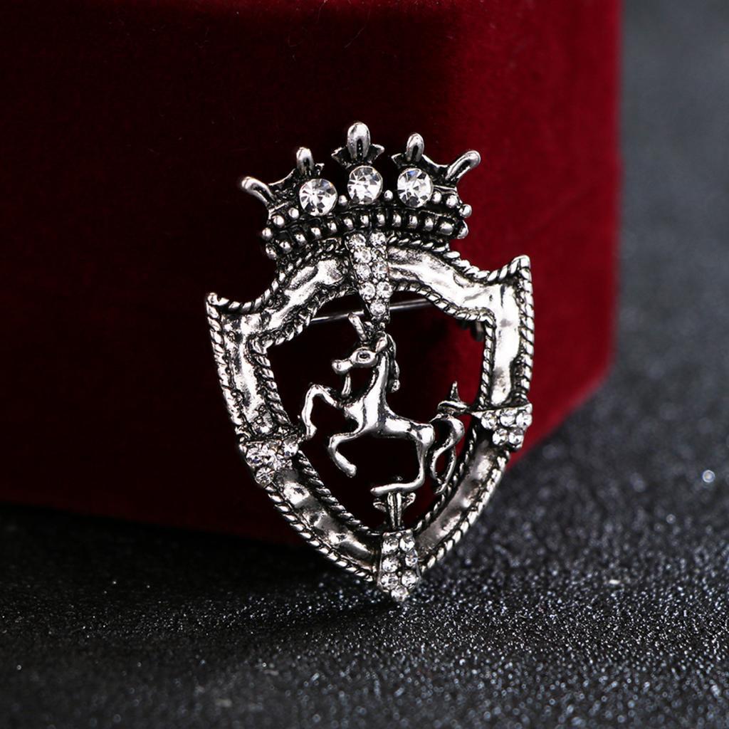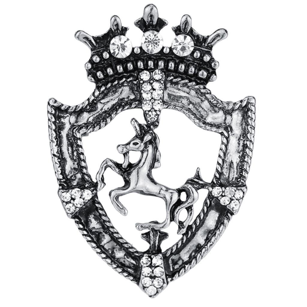 Fancy Queen Crown Brooch Crystal Unicorn Racing Badge Brooch Antique Silver