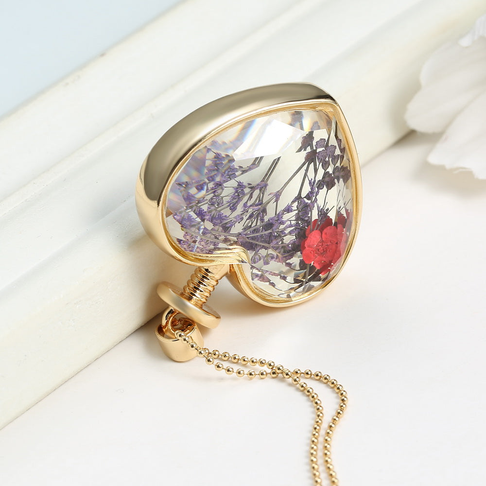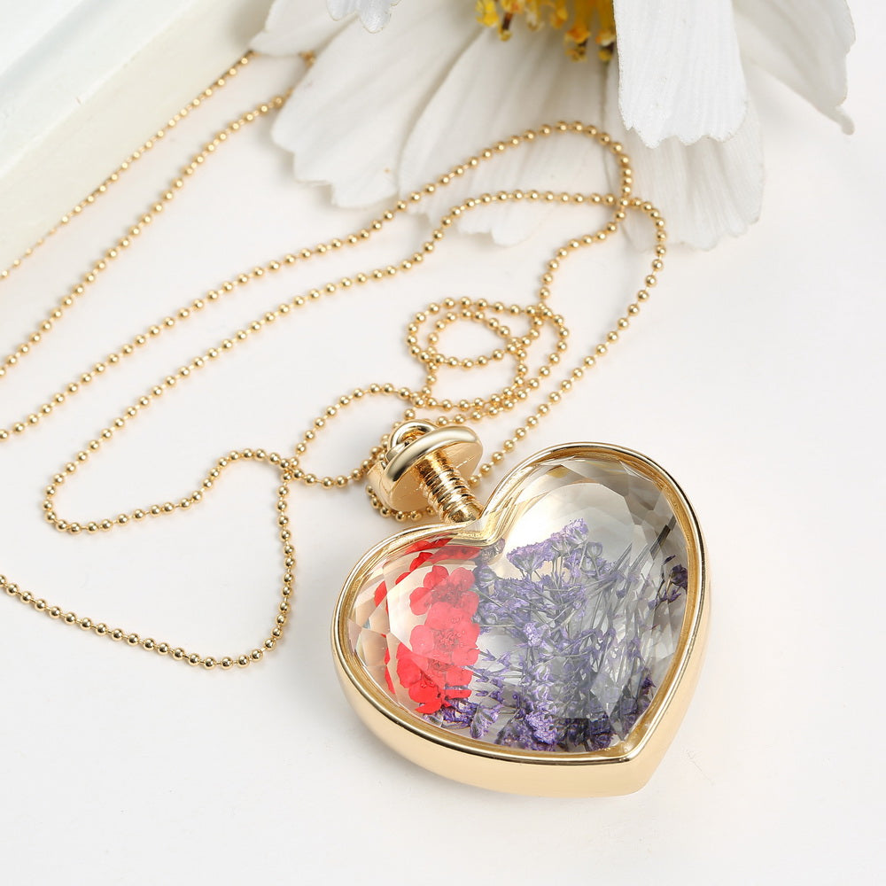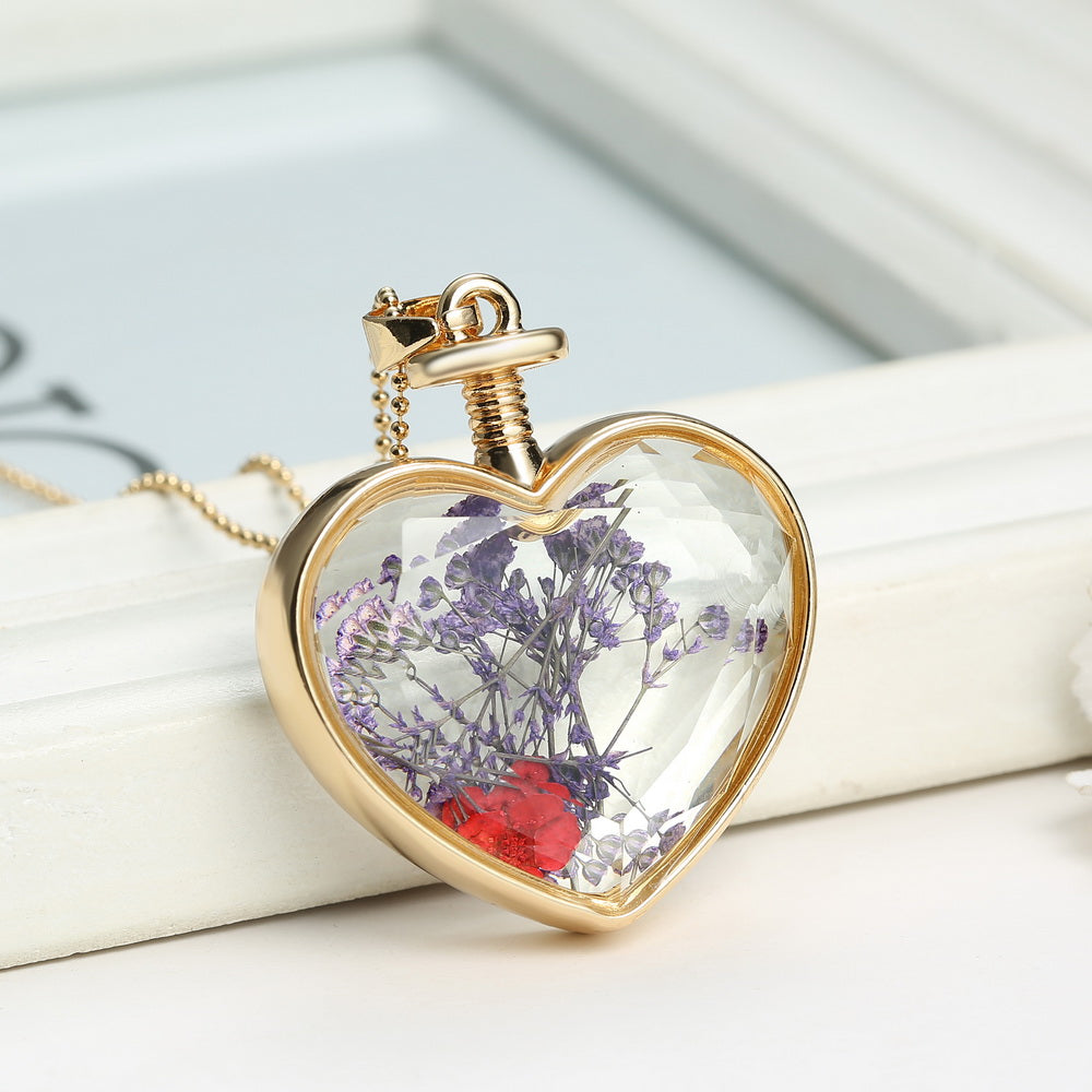 Fashion Glass Heart Shape Floating Locket Dried Flower Plant Chain Necklace