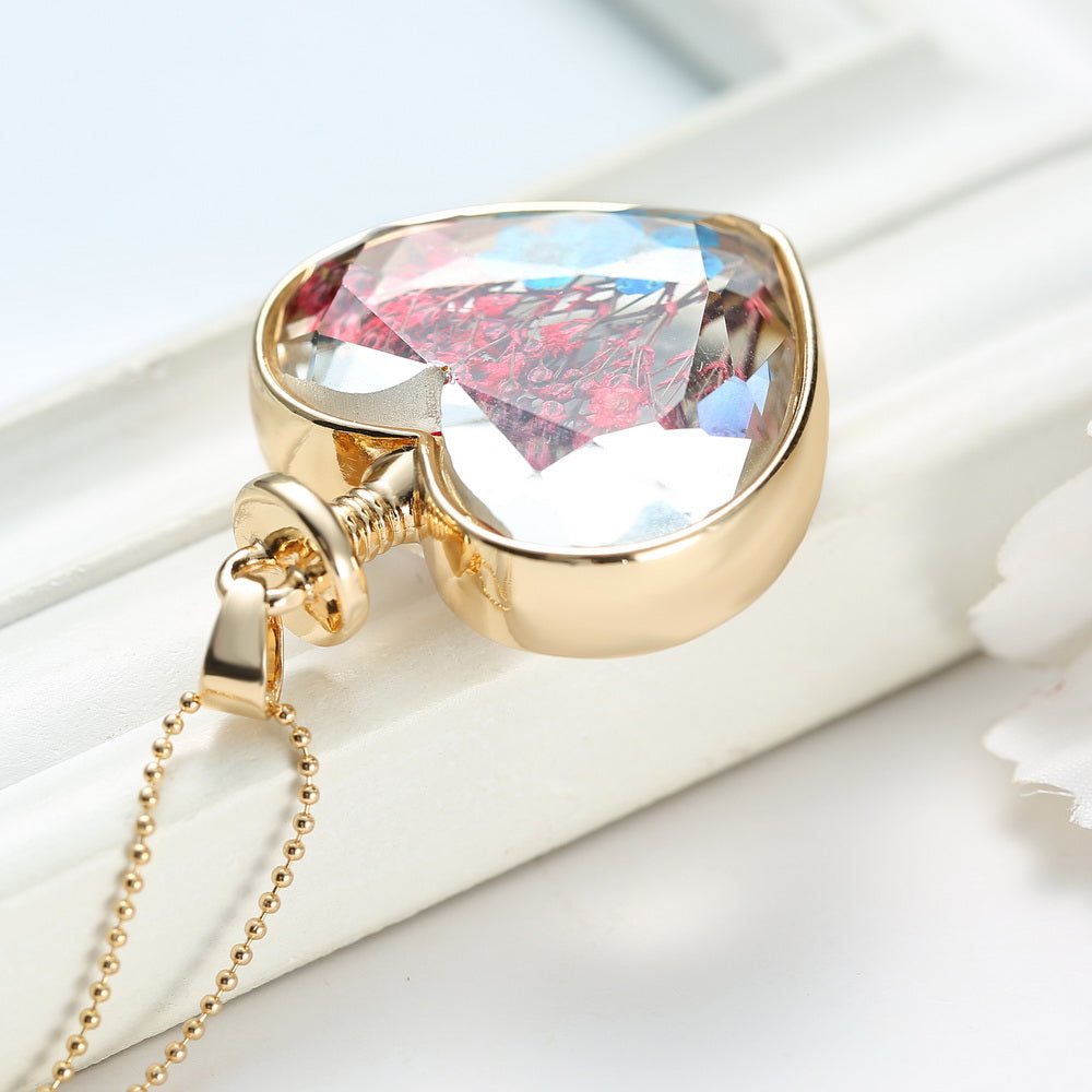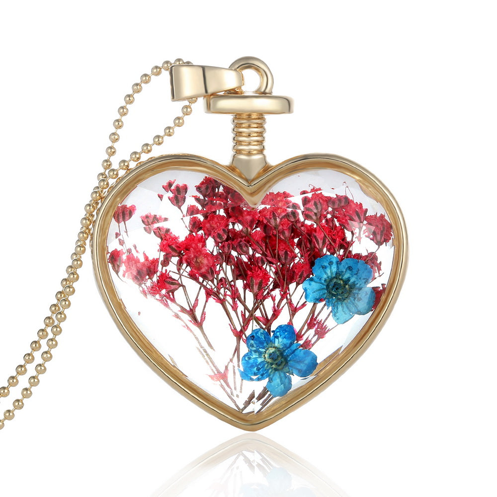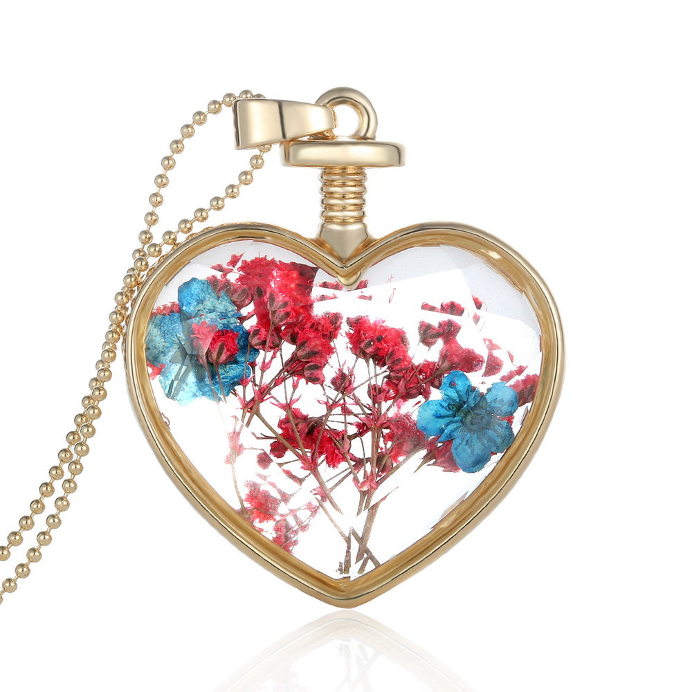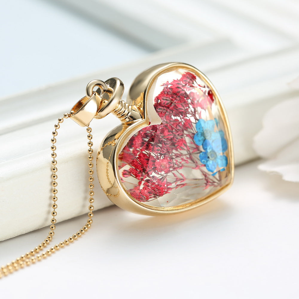 Glass Heart Shape Floating Locket Dried Flower Pendant Golden Chain Necklace