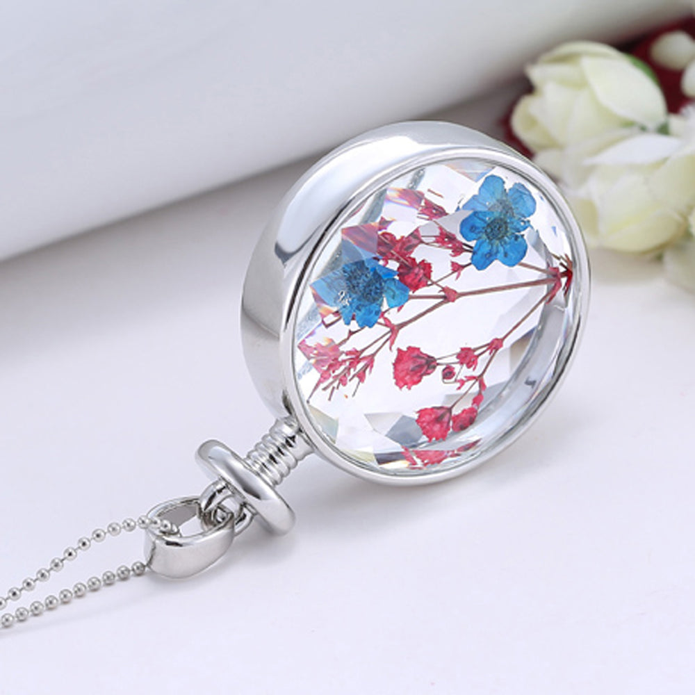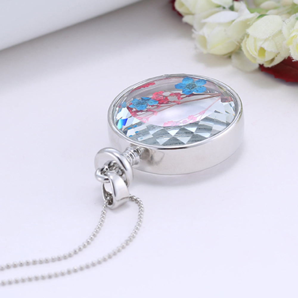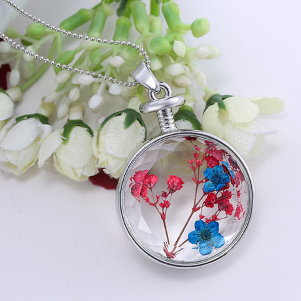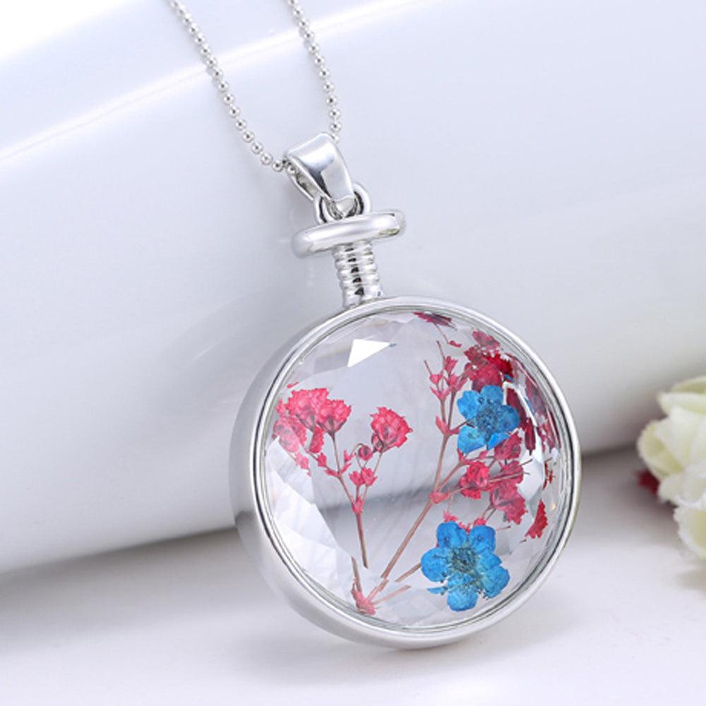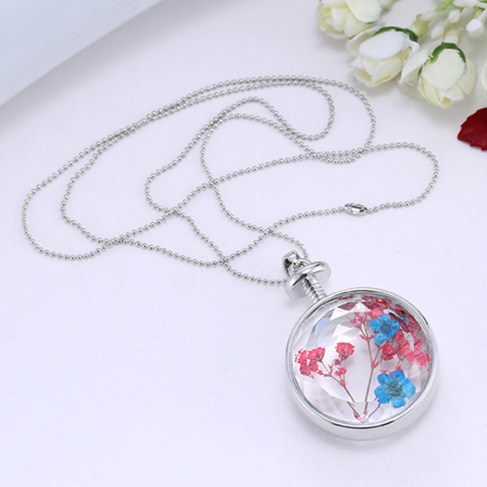 Glass Round Bottle Floating Rose Blue Dried Flower Silver Chain Necklace