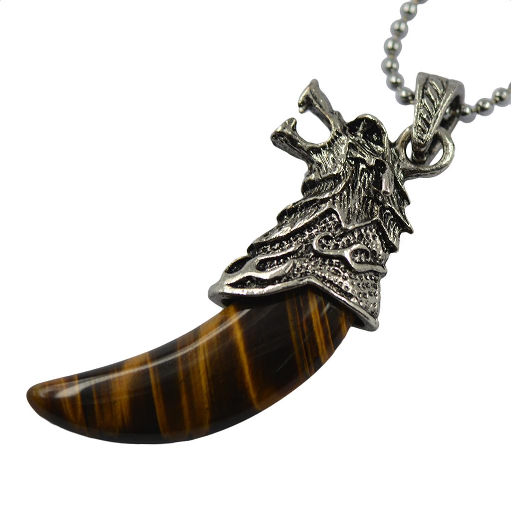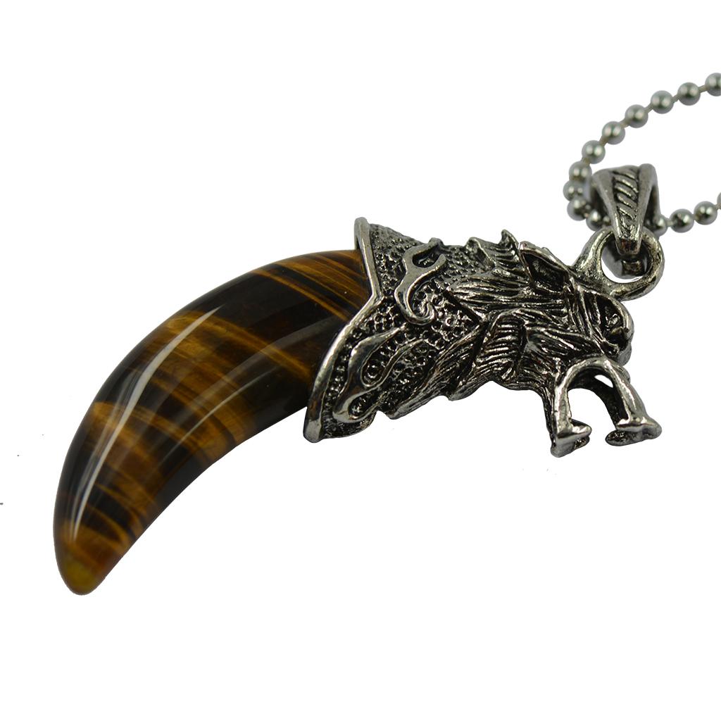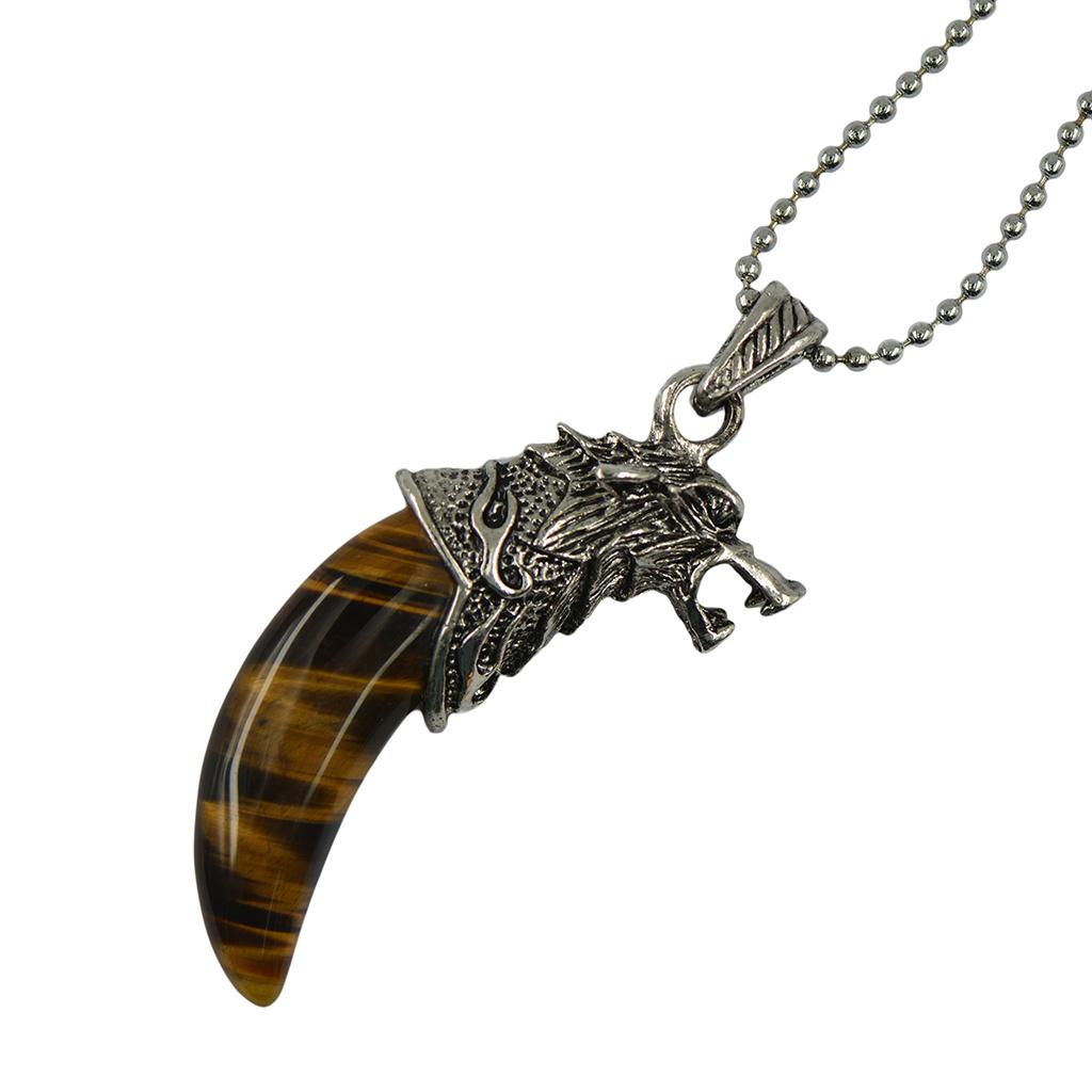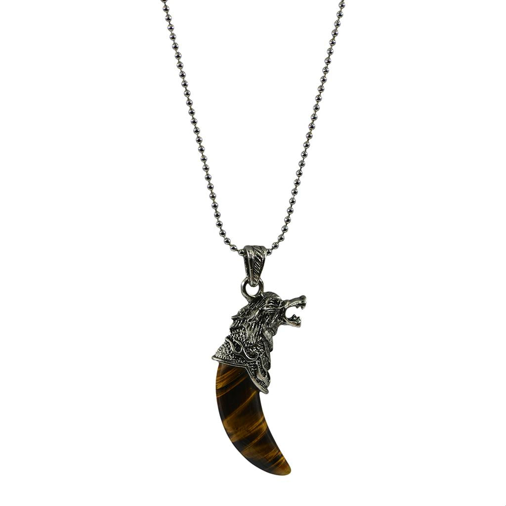 Mens 3D Wolf Tooth Head Opal Pendant Ball Chain Necklace Yellow