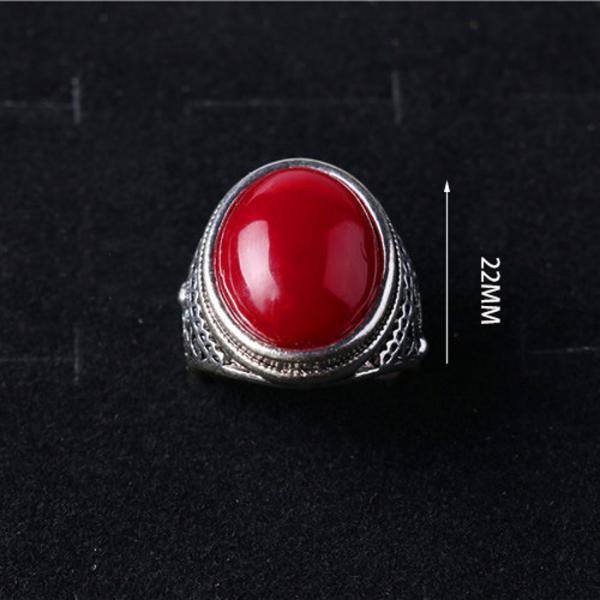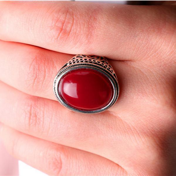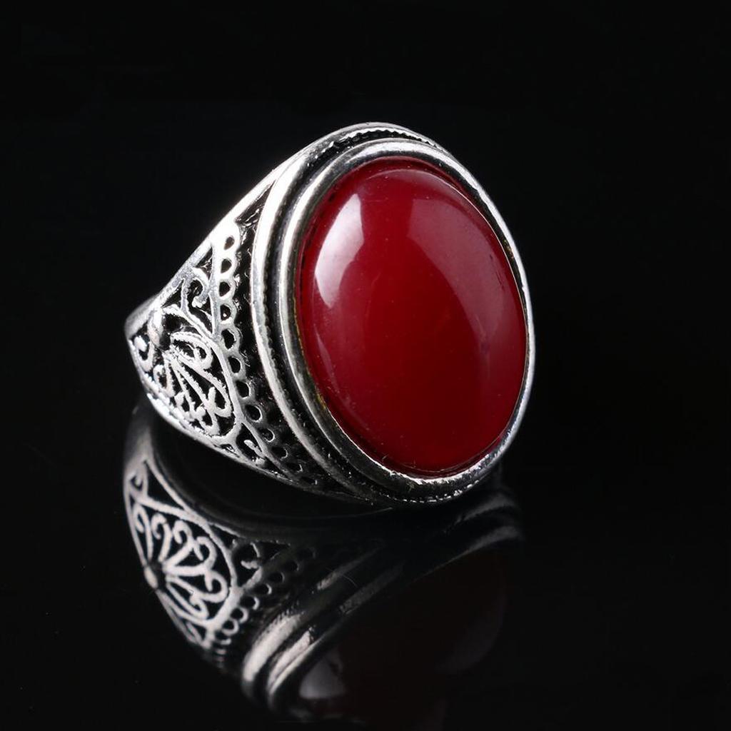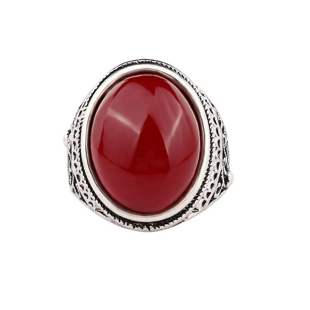 Metal Alloy Engraved Ring Mens Wedding Band Silver Red Oval Gemstone Sz 9