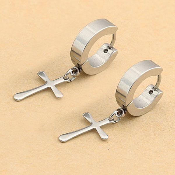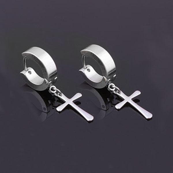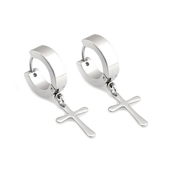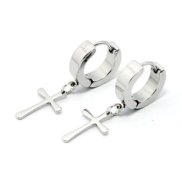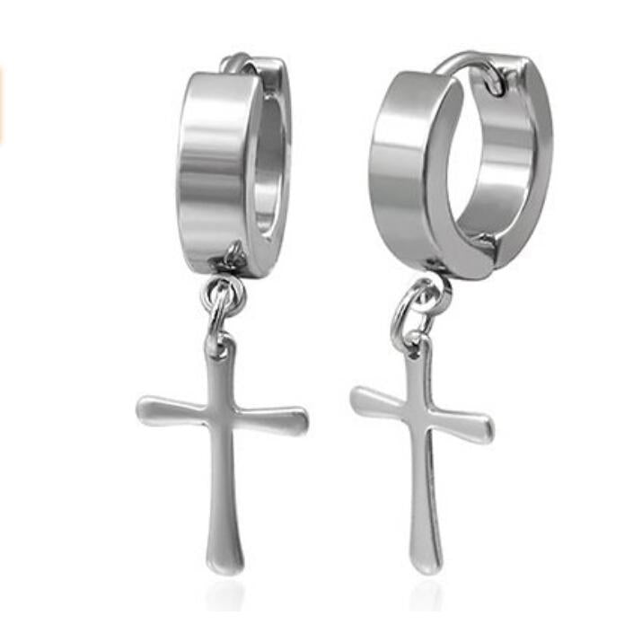 Punk Stainless Steel Cross Dangle Hoop Huggie Earrings Pierced Steel