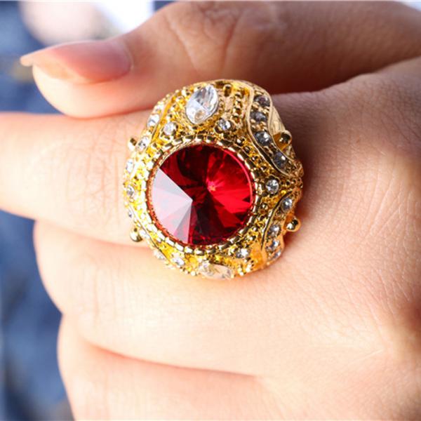 • Shiny Red Rhinestone Rings with Crown Shape, Novel Personality Design.