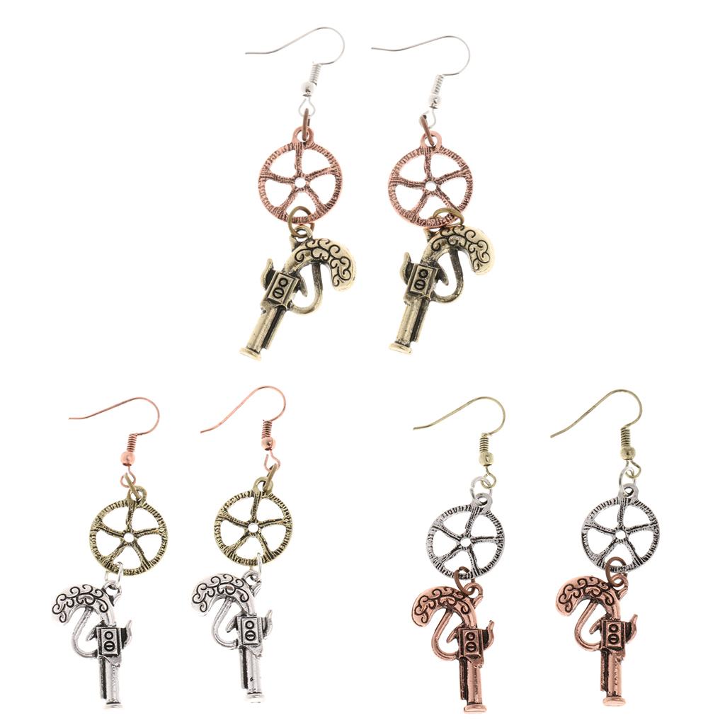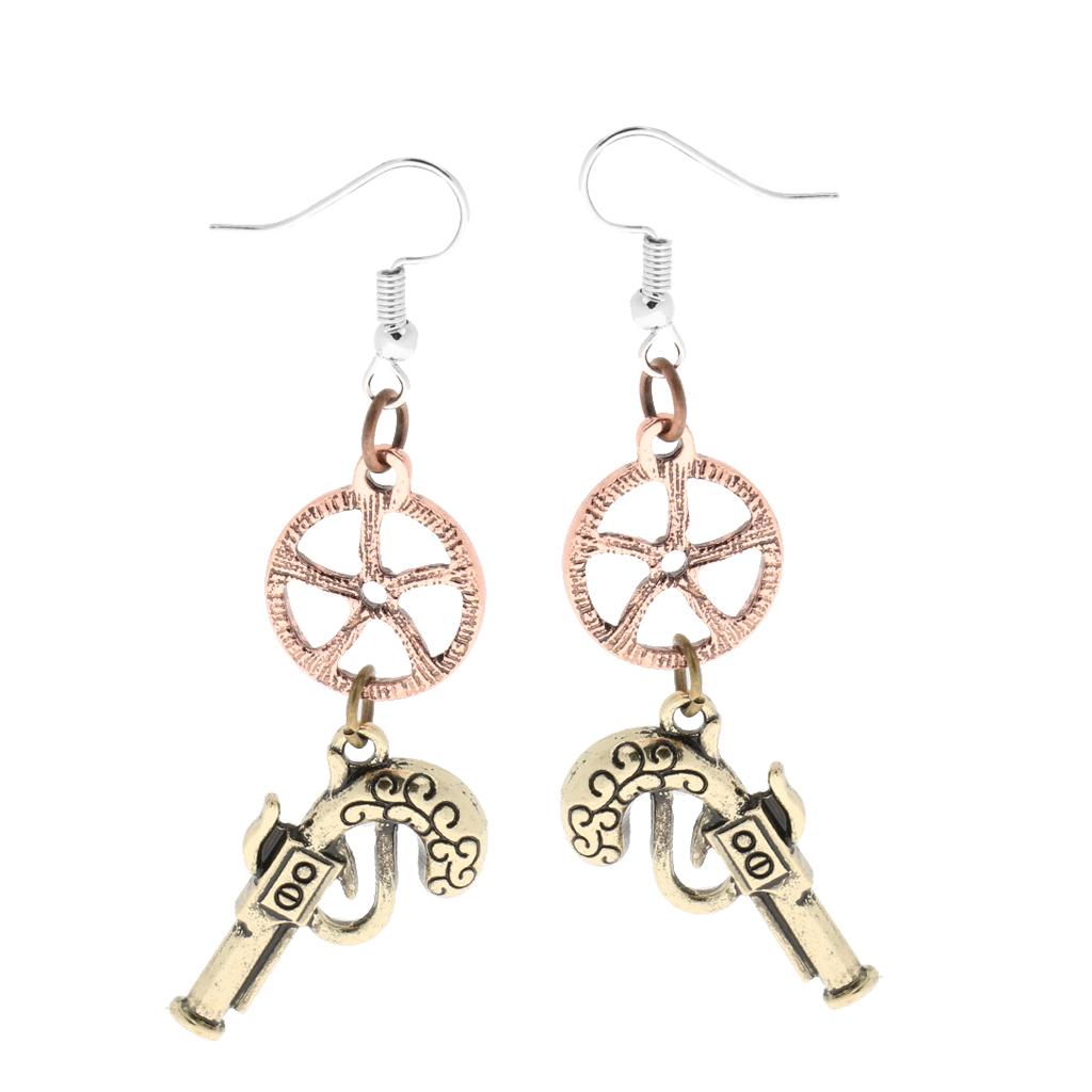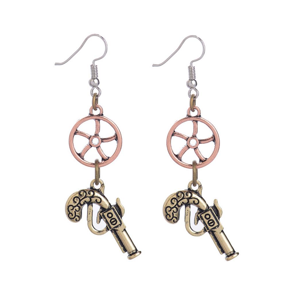 • Vintage steampunk revolver gun wheel gear drop earrings with personality.