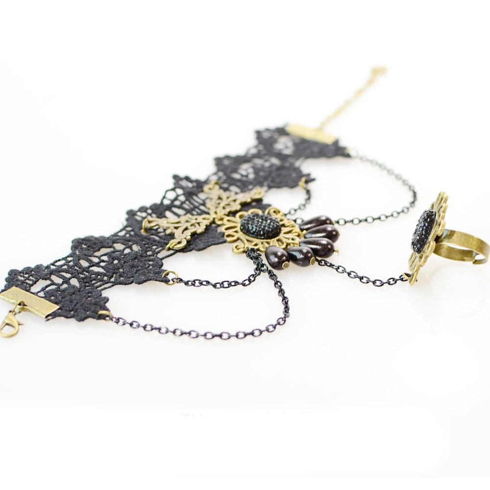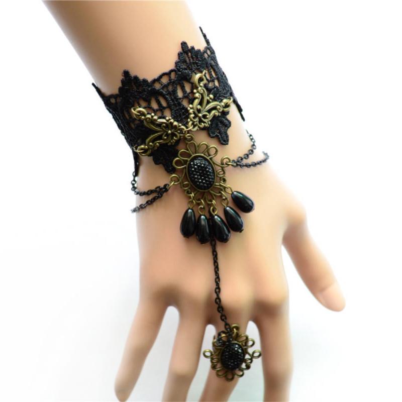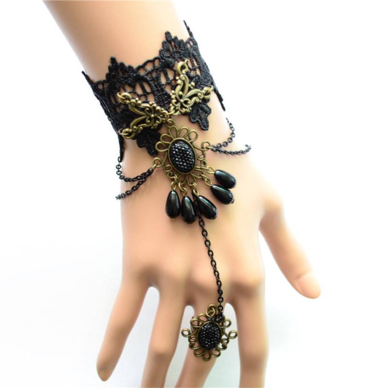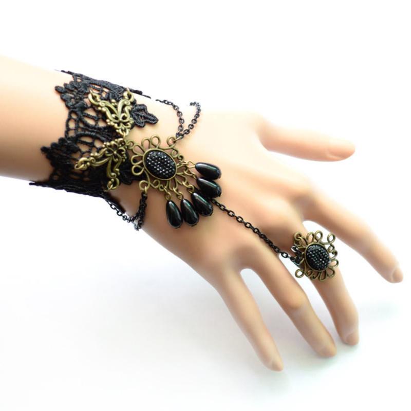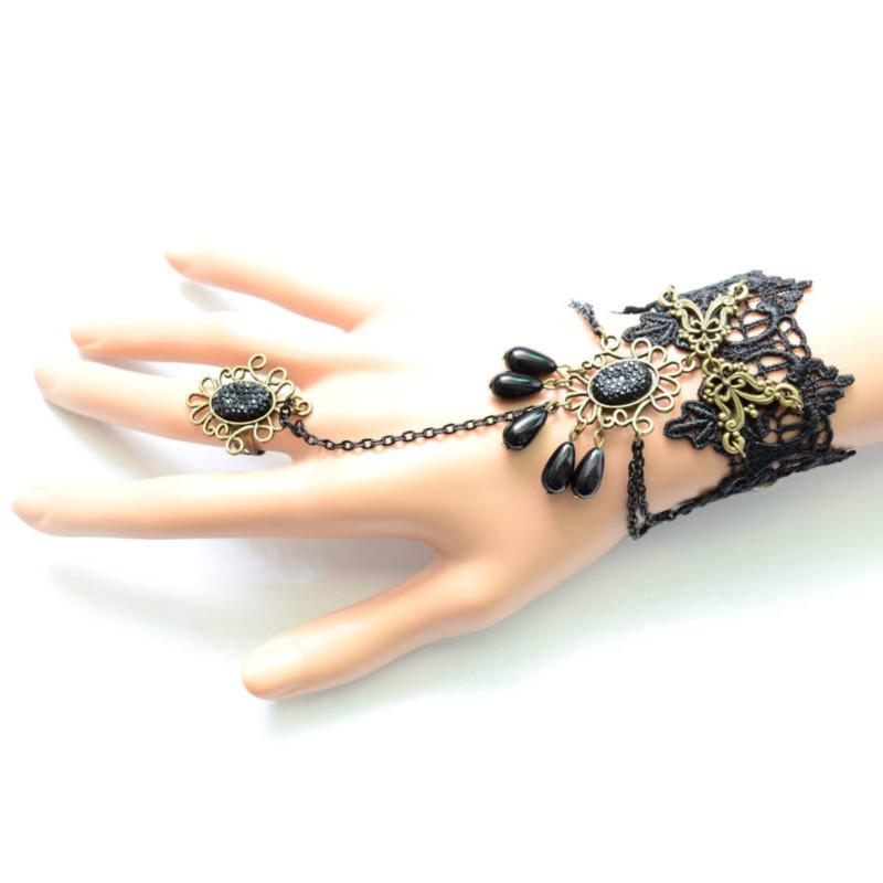 Retro Vintage Gothic Punk Style Lace Beads Slave Bracelet Ring Black