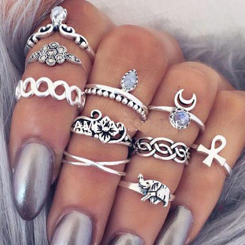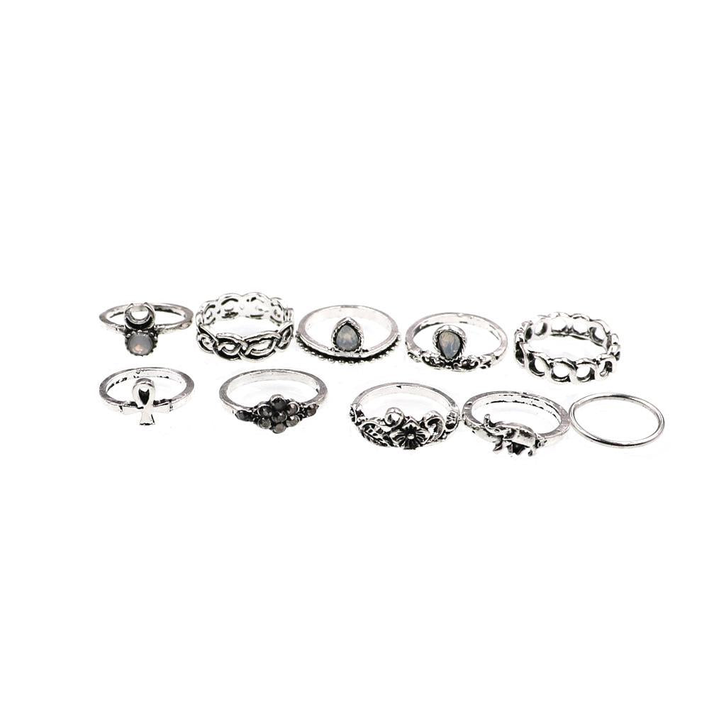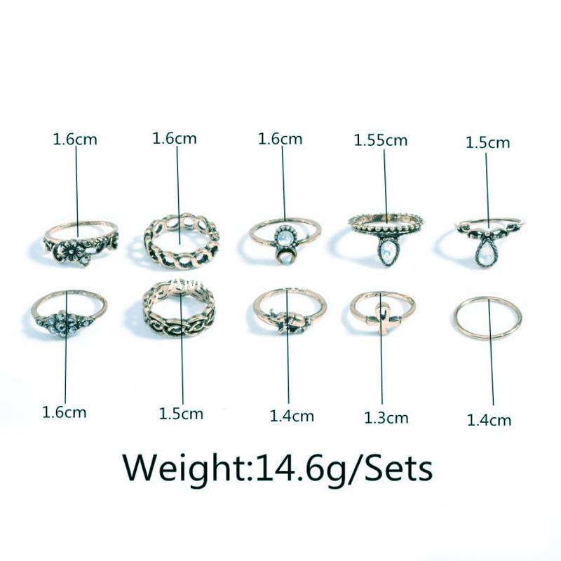 Introducing Set of 10 Ethnic retro palace feng shui diamond ring Set for you.This ring set contains superior design rings like Bowknot, Heart, Five-pointed star, Key, Row of Rhinestone and many more and Boho design finish gives these rinng an ethenic look. Flaunt with this set of Multiple Finger Stack Knuckle Band Punk rings in any party, outdoor.